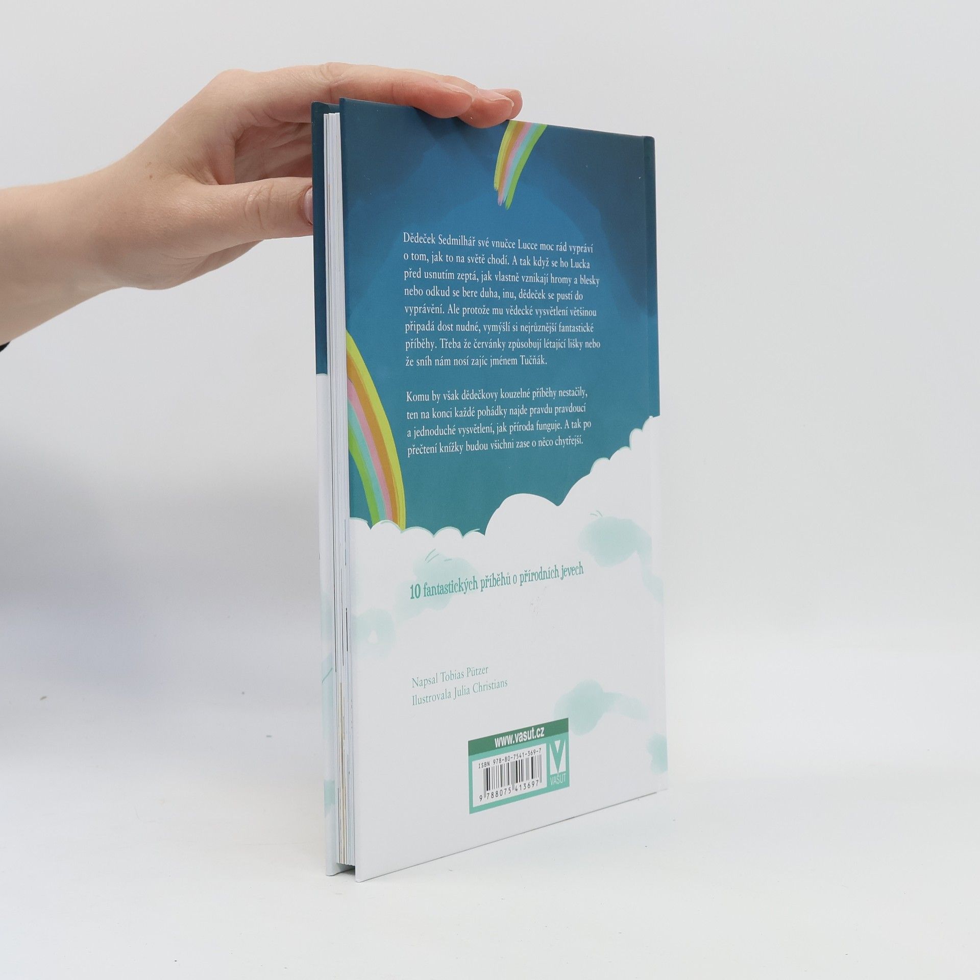 Deset fantastických příběhů o přírodních jevech. Když se malá vnučka Lucka dědečka zeptá, jak vlastně vznikají hromy a blesky nebo odkud se bere duha, ochotně se pustí do vyprávění. Ale protože mu vědecké vysvětlení většinou připadá dost nudné, vymýšlí si nejrůznější fantastické příběhy. Třeba že červánky způsobují létající lišky nebo že sníh nám nosí zajíc jménem Tučňák. Komu by však dědečkovy kouzelné příběhy nestačily, ten na konci každé pohádky najde jednoduché vysvětlení, jak příroda funguje. Nakladatelská anotace. Kráceno.