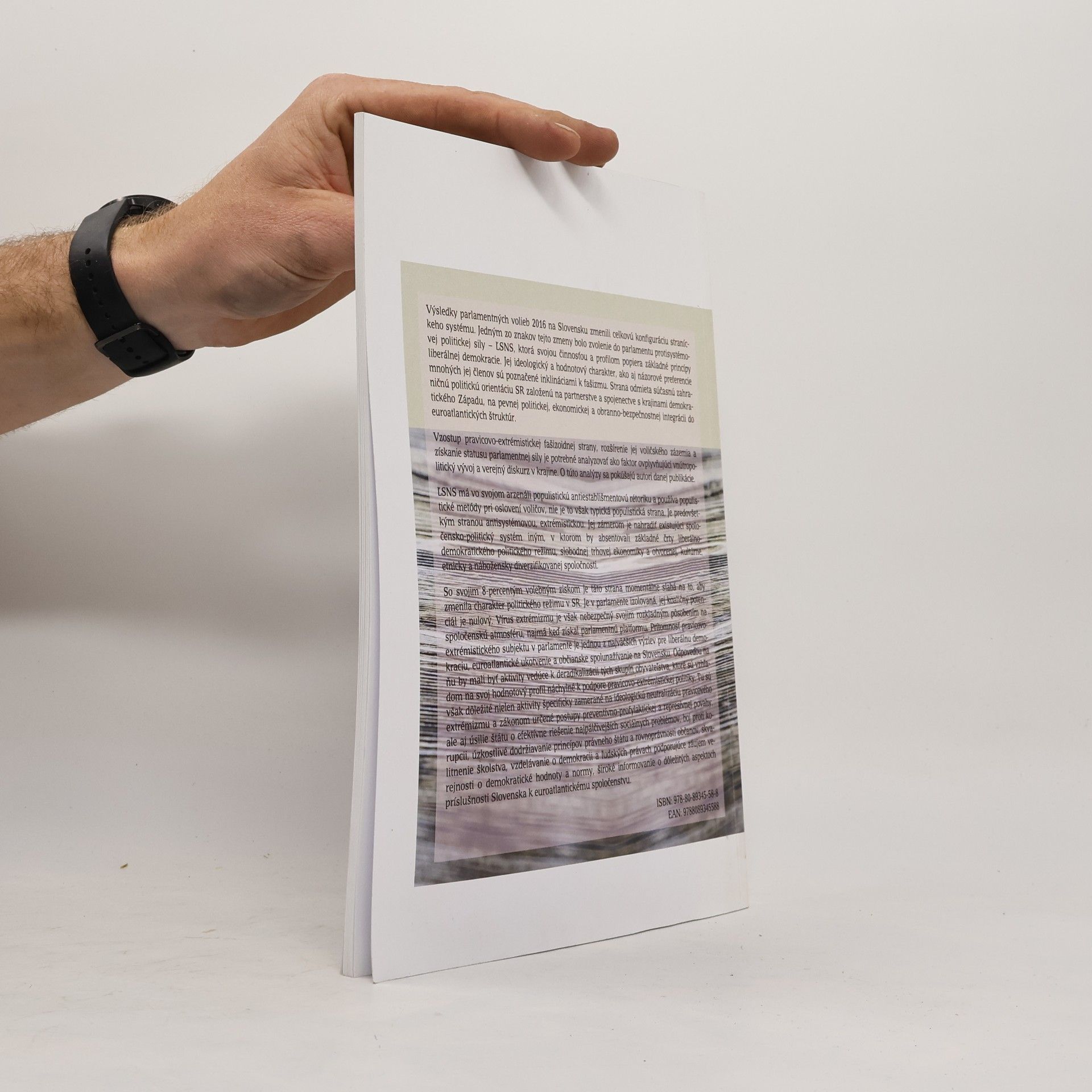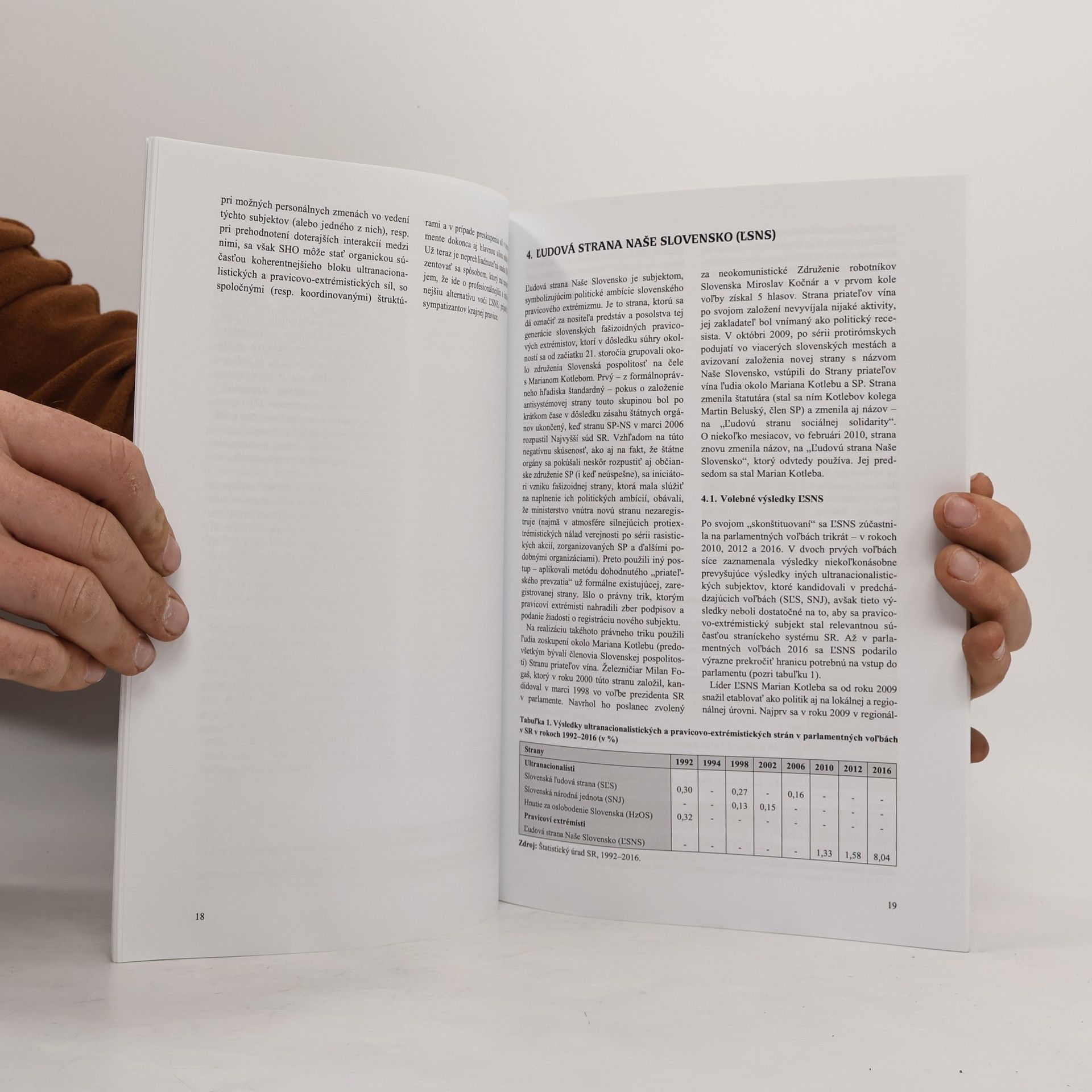 Stav, trendy a podpora Autori publikácie analyzujú súčasný spoločensko-politický kontext, slovenskú pravicovo-extrémistickú a ultranacionalistickú scénu. Publikácia obsahuje kapitolu o Ľudovej strane Naše Slovensko (volebné výsledky, profil strany, program, témy, personálne zázemie, povolebné aktivity), tiež opis sociálno-demografickej štruktúry elektorátu ĽSNS s motívmi a zdrojmi podpory. Autori sa venujú tiež miere dopytu po pravicovom extrémizme, charakteru verejnej a politickej debaty o pravicovom extrémizme, radikálnom nacionalizme a fašizme po parlamentných voľbách 2016 a názorom verejnosti predstavujúcim úrodnú pôdu pravicového extrémizmu. Kniha je ohlasom na situáciu, kedy výsledky parlamentných volieb 2016 zmenili celkovú konfiguráciu straníckeho systému na Slovensku. Jedným zo znakov tejto zmeny bolo zvolenie protisystémovej politickej sily do NR SR, a to strany, ktorá svojou činnosťou a profilom popiera základné princípy liberálnej demokracie. Vzostup tejto sily a rozšírenie jej voličského zázemia je potrebné analyzovať ako faktor ovplyvňujúci vnútropolitický vývoj a verejný diskurz v krajine.