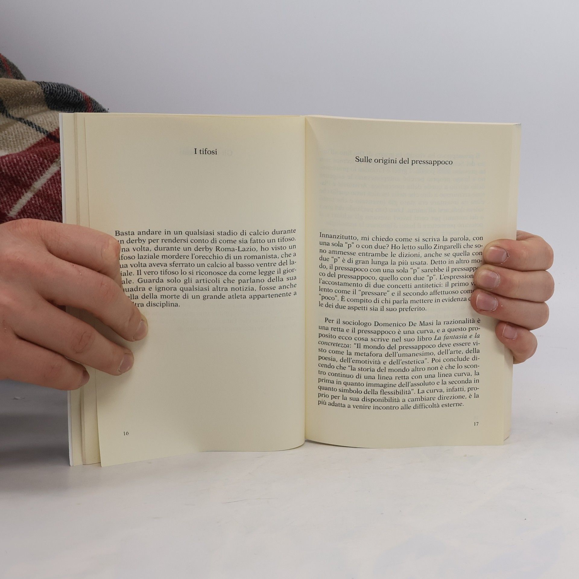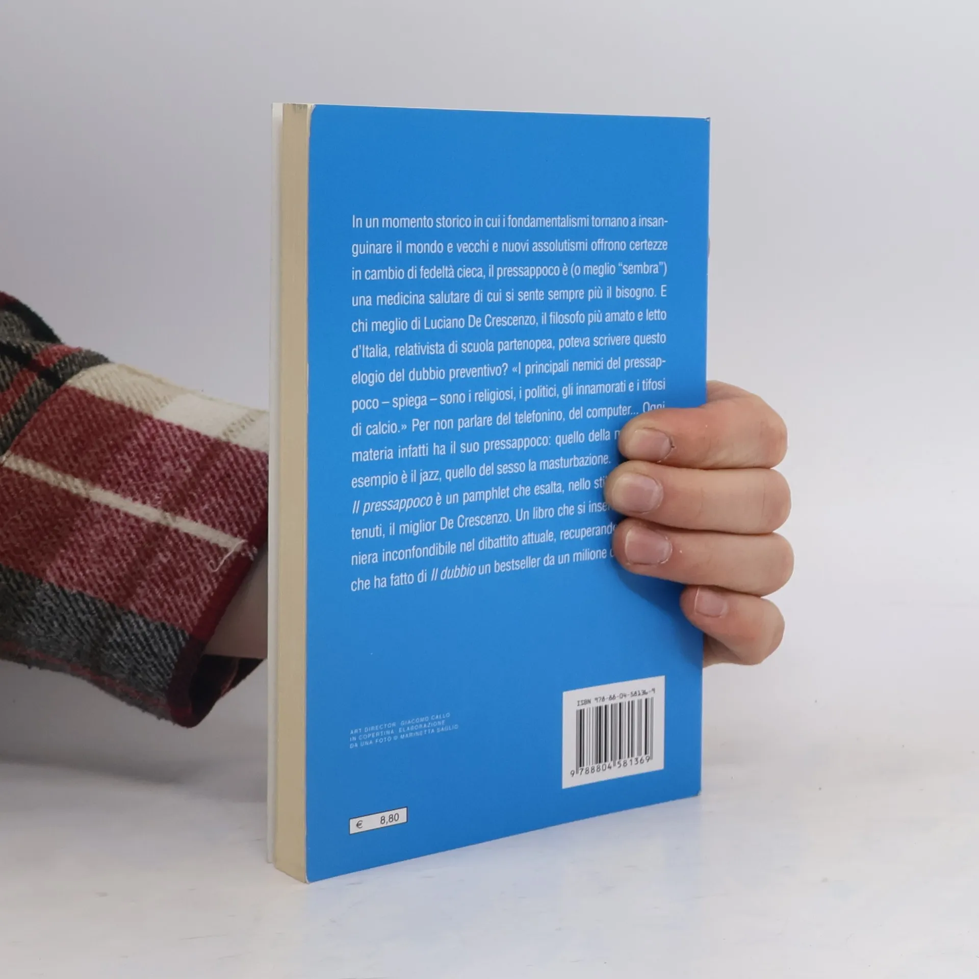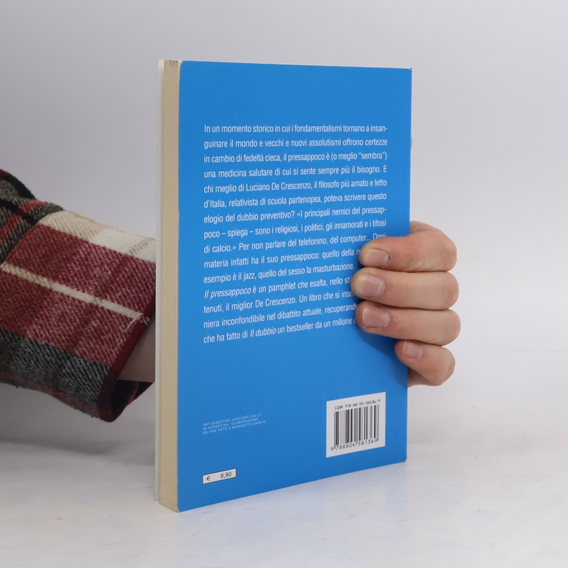 "Amo gli uomini del pressappoco e odio, o per meglio dire non mi sono simpatici, quelli che hanno le certezze assolute. In pratica amo quelli che parlano, che ascoltano, che cambiano parere". In un momento storico in cui i fondamentalismi tornano a insanguinare il mondo e vecchi e nuovi assolutismi offrono certezze in cambio di fedeltà cieca, il pressappoco è (o meglio "sembra") una medicina salutare di cui si sente sempre più il bisogno. E chi meglio di Luciano De Crescenzo, relativista di scuola partenopea, poteva scrivere questo elogio del dubbio preventivo? "I principali nemici del pressappoco - spiega - sono i religiosi, i politici, gli innamorati e i tifosi di calcio." Per non parlare del telefonino, del computer... Ogni materia infatti ha il suo pressappoco: quello della musica ad esempio è il jazz, quello del sesso la masturbazione.