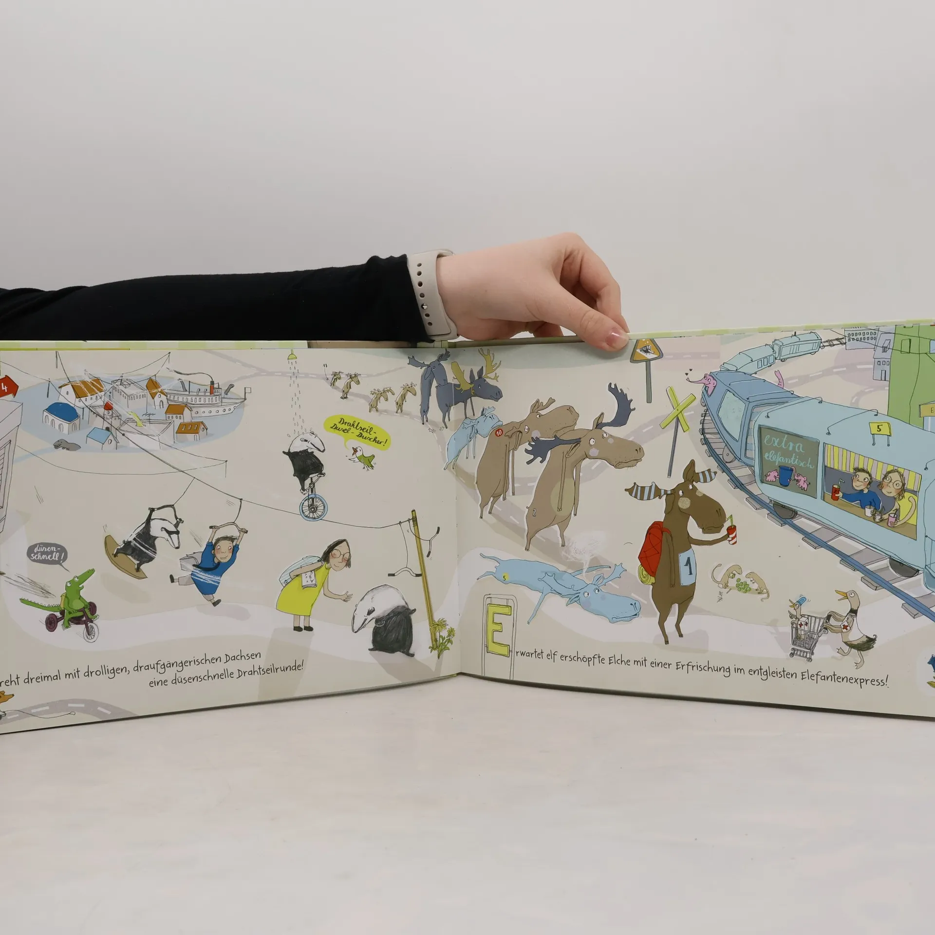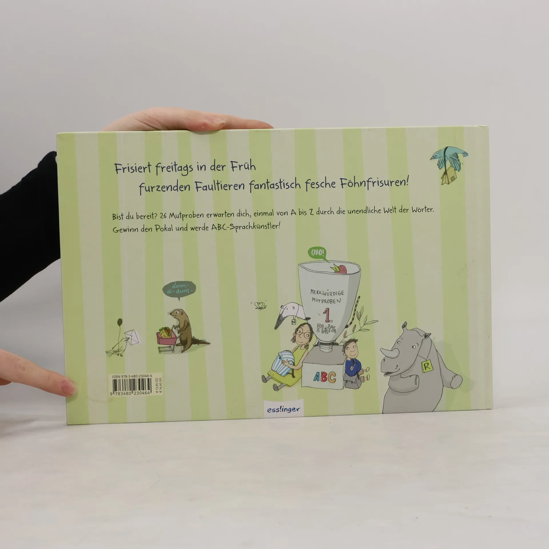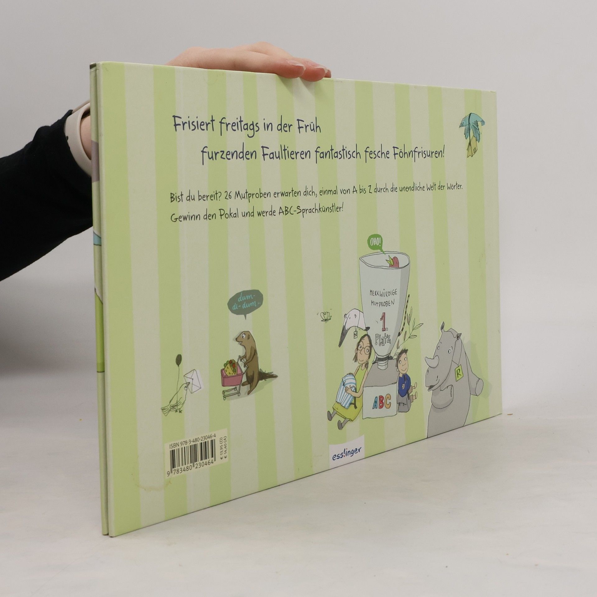Ein unverwechselbar illustriertes Bilderbuch rund ums Alphabet mit Lachgarantie! Mutig treten wir durch eine Tür und schon erwarten uns angelnde Antilopen auf Affenbrotbäumen oder brüllende Bananenbiber mit Boxhandschuhen. 26 herrlich-skurrile Mutproben gilt es zu bestehen. Zusätzlich stecken in den Bildern ganz viele Dinge, die mit dem jeweiligen Buchstaben beginnen. Also zuhören, schauen, entdecken und lachen – jede Seite ist ein kreatives Spiel mit einem Buchstaben und der unendlichen Welt der Wörter!