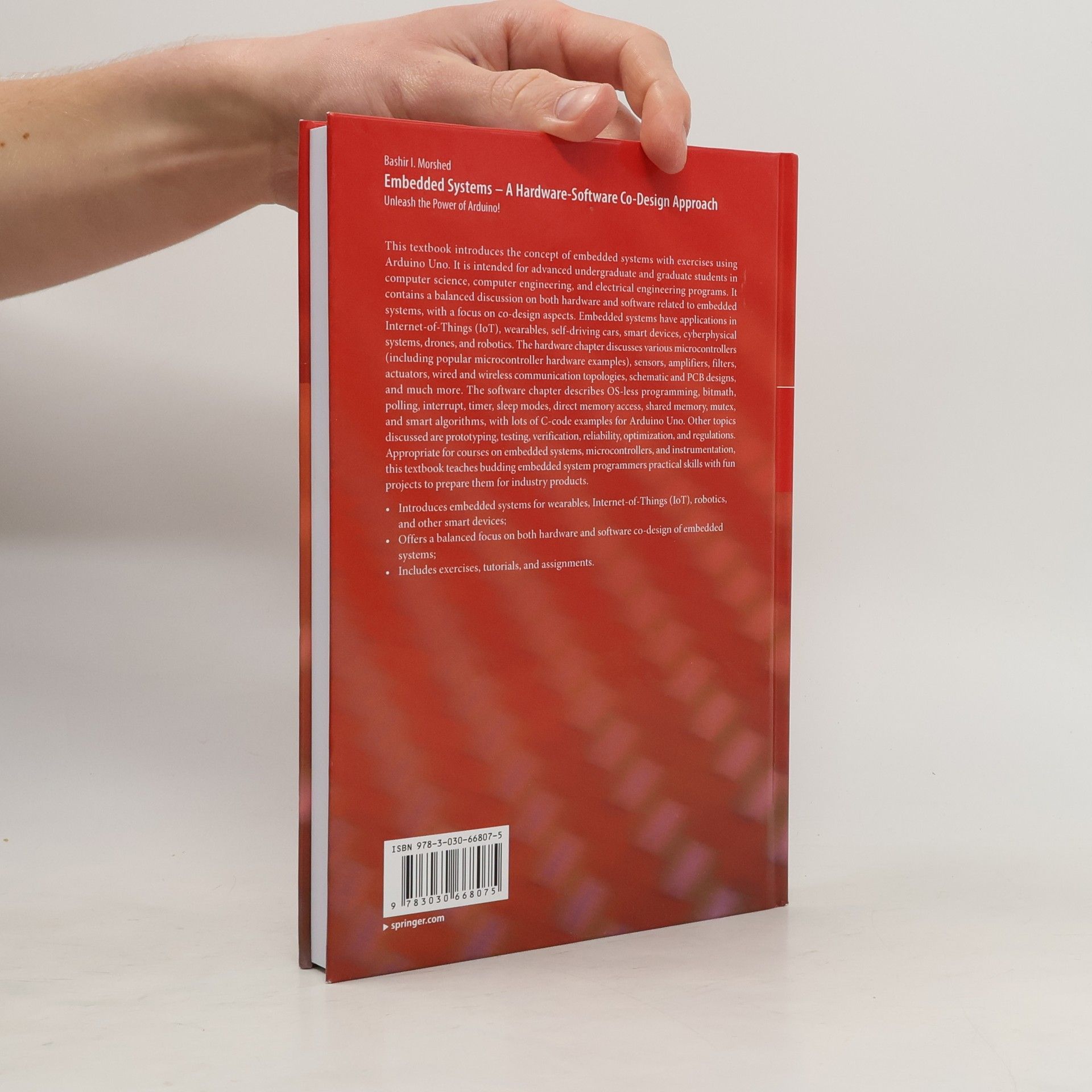 This textbook introduces the concept of embedded systems with exercises using Arduino Uno. It is intended for advanced undergraduate and graduate students in computer science, computer engineering, and electrical engineering programs. It contains a balanced discussion on both hardware and software related to embedded systems, with a focus on co-design aspects. Embedded systems have applications in Internet-of-Things (IoT), wearables, self-driving cars, smart devices, cyberphysical systems, drones, and robotics. The hardware chapter discusses various microcontrollers (including popular microcontroller hardware examples), sensors, amplifiers, filters, actuators, wired and wireless communication topologies, schematic and PCB designs, and much more. The software chapter describes OS-less programming, bitmath, polling, interrupt, timer, sleep modes, direct memory access, shared memory, mutex, and smart algorithms, with lots of C-code examples for Arduino Uno. Other topics discussed are prototyping, testing, verification, reliability, optimization, and regulations. Appropriate for courses on embedded systems, microcontrollers, and instrumentation, this textbook teaches budding embedded system programmers practical skills with fun projects to prepare them for industry products. Introduces embedded systems for wearables, Internet-of-Things (IoT), robotics, and other smart devices; Offers a balanced focus on both hardware and software co-design of embedded systems; Includes exercises, tutorials, and assignments.