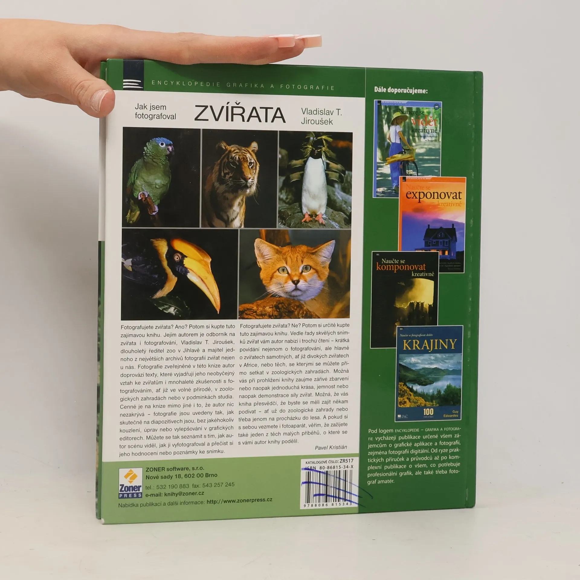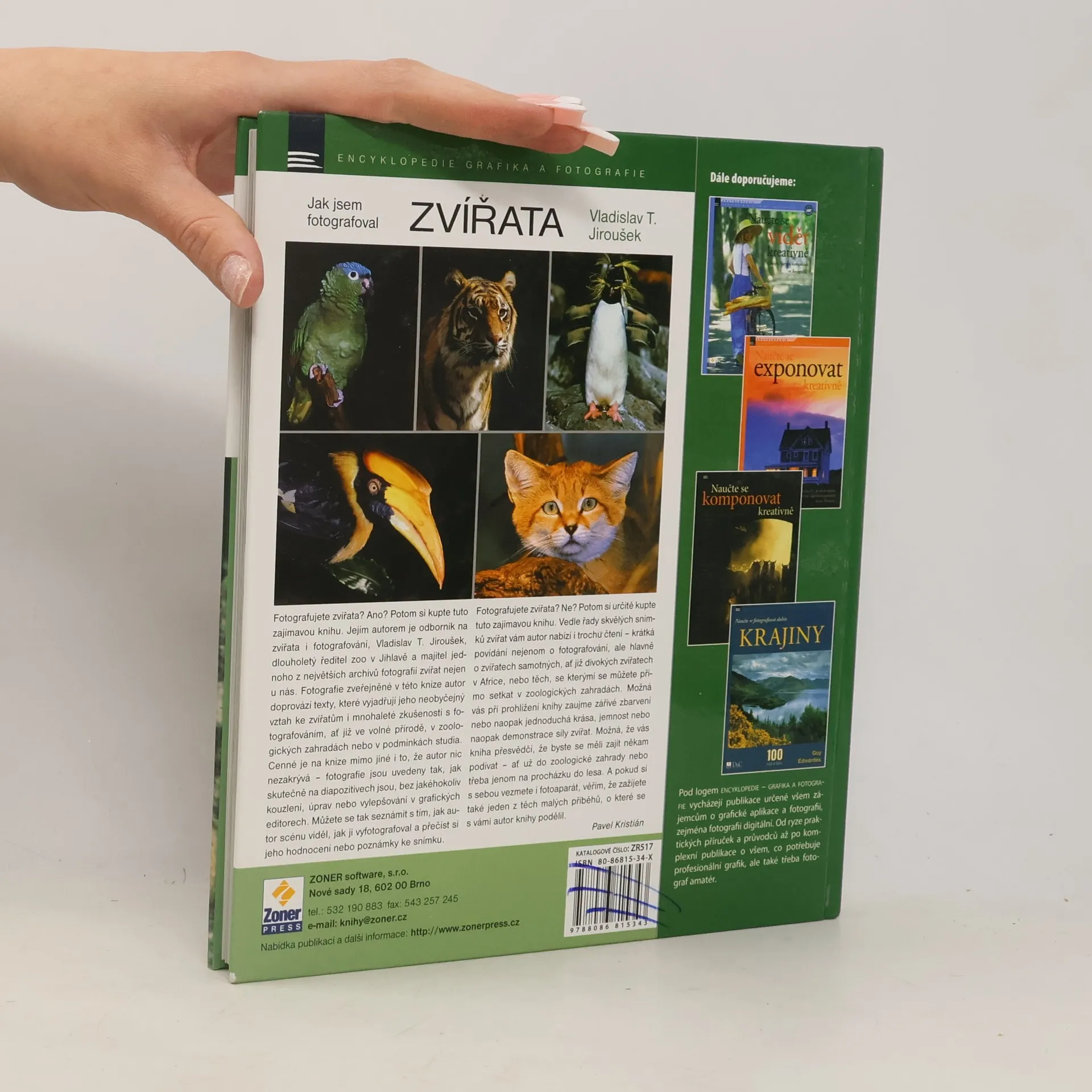 Fotografujete zvířata? Ano? Potom pro vás možná bude tato kniha zajímavá. Autorem knihy je odborník na zvířata i fotografování, Vladislav T. Jiroušek, dlouholetý ředitel zoo v Jihlavě a majitel jednoho z největších archivů fotografií zvířat nejen u nás. Fotografie zveřejněné v této knize autor doprovází texty, které vyjadřují jeho neobyčejný vztah ke zvířatům i mnohaleté zkušenosti s fotografováním, ať již ve volné přírodě, v zoologických zahradách nebo v podmínkách studia. Cenné je na knize mimo jiné i to, že autor nic nezakrývá - fotografie jsou uvedeny tak, jak skutečně na diapozitivech jsou, bez jakéhokoliv kouzlení, úprav nebo vylepšování v grafických editorech. Můžete se tak seznámit s tím, jak autor scénu viděl, jak ji vyfotografoval a přečíst jeho hodnocení nebo poznámky ke snímku. Fotografujete zvířata? Ne? Potom pro vás možná bude kniha zajímavá. Vedle řady skvělých snímků zvířat vám autor nabízí i zajímavé čtení jak o zvířatech, tak i o tom, jak je fotografoval. Možná, že vás přesvědčí, že byste se měli zajít podívat - ať už do zoologické zahrady nebo jenom na procházku do lesa. A pokud s sebou vezmete i fotoaparát, věřím, že zažijete také jeden z těch malých příběhů, o které se s vámi autor knihy podělil.