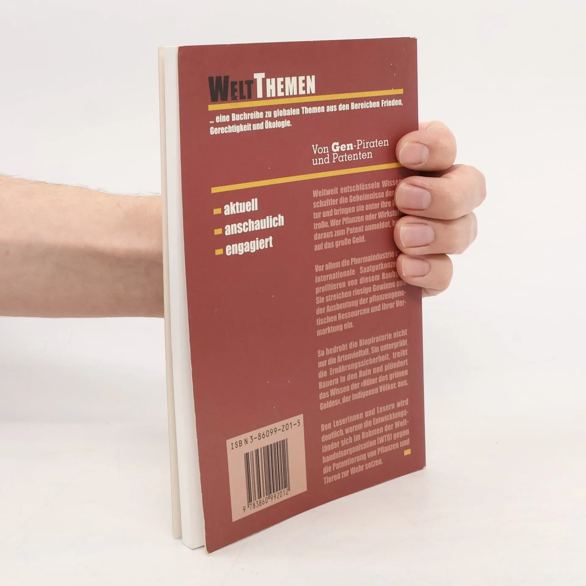 Ein gemeinsames Projekt mit der Nichtregierungsorganisation Brot für die Welt Weltweit entschlüsseln Wissenschaftler die Geheimnisse der Natur und bringen sie unter ihre Kontrolle. Wer Pflanzen oder Wirkstoffe daraus zum Patent anmeldet, hofft auf das große Geld. Vor allem die Pharmaindustrie und internationale Saatgutkonzerne profitieren von diesem Raubgut. Doch die Biopiraterie bedroht nicht nur die Artenvielfalt, sie untergräbt auch die Ernährungssicherheit, treibt Bauern im Süden in den Ruin und plündert das Wissen der indigenen Völker aus. Der Band macht deutlich, warum sich die Entwicklungsländer im Rahmen der Welthandelsorganisation gegen die Patentierung von Pflanzen und Tieren zur Wehr setzen.
