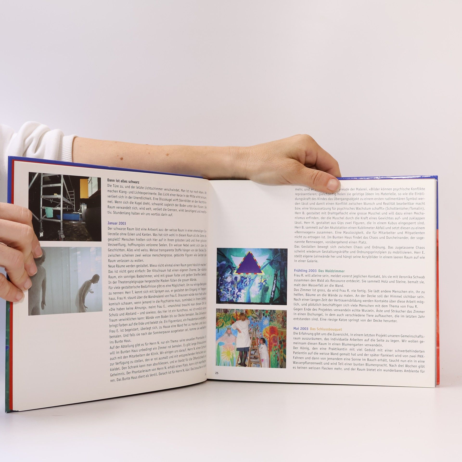 Wer fremde Wände bemalt, um der eigenen Kreativität freien Lauf zu lassen, überschreitet oft Grenzen und stößt auf Widerstand. In der Kantonalen Psychiatrischen Klinik in Liestal war dies jedoch ausdrücklich erwünscht und wurde zu therapeutischen Zwecken gefördert. Ein ungenutztes, renovationsbedürftiges Haus der Klinik bot die Gelegenheit für das Projekt 'Buntes Haus'. Durch einen Impuls des Chefarztes Dr. Theodor Cahn konnte eine Abteilung sinnvoll genutzt werden, was zu einem außergewöhnlichen Kunstprojekt führte. Hier konnten Psychiatriepatienten ihre schöpferischen Energien entfalten und es entstand ein Kosmos ausdrucksvoller Bilder, der die Betrachter anspricht und auch Nichtfachleute fasziniert. Der Text bietet interessante Einblicke in das Potenzial kreativer Projekte und die kreativen Prozesse, die bei psychisch Kranken und Gesunden ähnlich ablaufen. Die Qualität der im Bunten Haus entstandenen Werke überrascht und regt zur Auseinandersetzung mit der Frage an: Was ist Kunst? Diese Bilder tragen zur Diskussion über den Kunstbegriff bei, ein Thema, das die moderne Kunst seit fast hundert Jahren beschäftigt. Während die Renovation begonnen hat, lebt das Bunte Haus in den Erinnerungen der Beteiligten und in den zurückgebliebenen Werken und Objekten weiter. Die Publikation möchte der Psychiatrie ein Fenster zur Außenwelt öffnen und der Öffentlichkeit einen bildhaften Eindruck in einen oft fremden Bereich vermitteln.