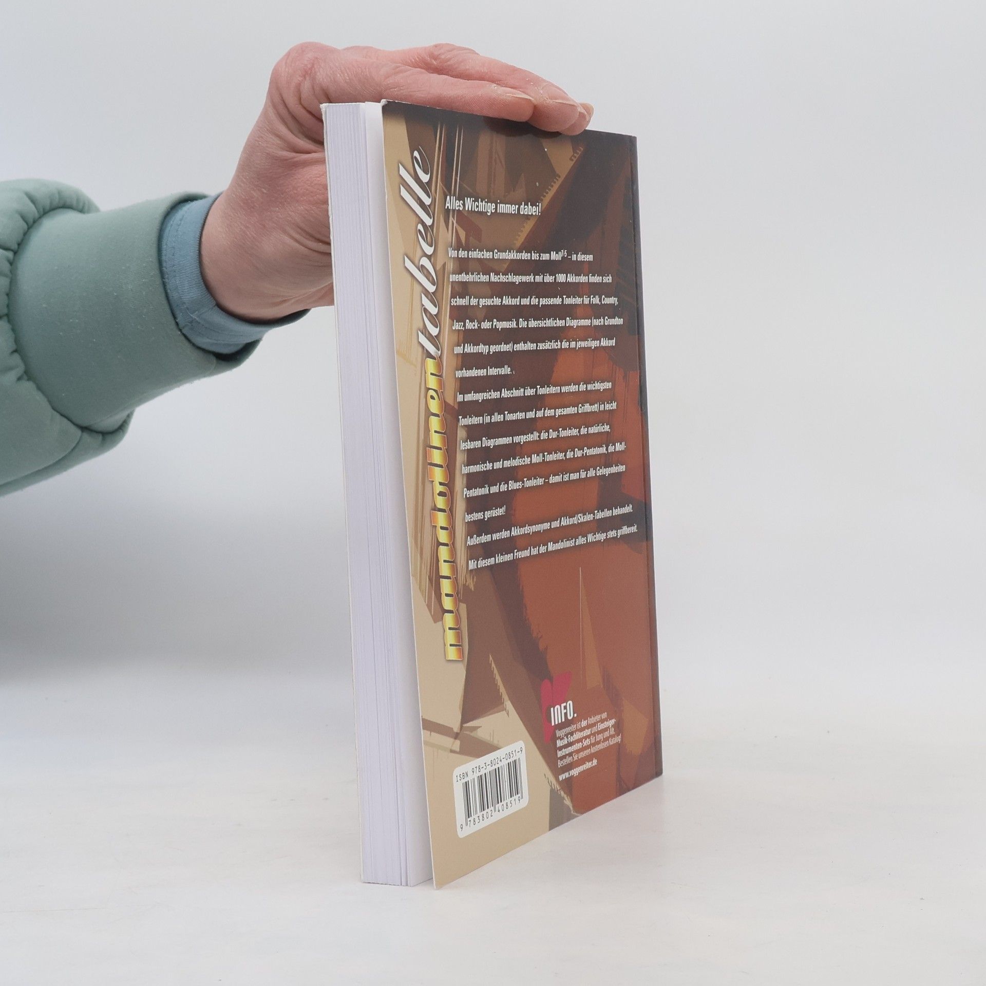 Alles Wichtige immer dabei! Von den einfachen Grundakkorden bis zum Moll7b5 - in diesem unentbehrlichen Nachschlagewerk mit ber 1000 Akkorden finden sich schnell der gesuchte Akkord und die passende Tonleiter fr Folk, Country, Jazz, Rock- oder Popmusik. Die bersichtlichen Diagramme (nach Grundton und Akkordtyp geordnet), enthalten zustzlich die im jeweiligen Akkord vorhandenen Intervalle. Im umfangreichen Abschnitt ber Tonleitern werden die wichtigsten Tonleitern (in allen Tonarten und auf dem gesamten Griffbrett) in leicht lesbaren Diagrammen die Durtonleiter, die natrliche, harmonische und melodische Molltonleiter, die Durpentatonik, die Mollpentatonik und die Bluestonleiter - damit ist man fr alle Gelegenheiten bestens gerstet! Auerdem werden Akkordsynonyme und Akkord/Skalen-Tabellen behandelt. Mit diesem kleinen Freund hat der Mandolinist alles Wichtige stets griffbereit.