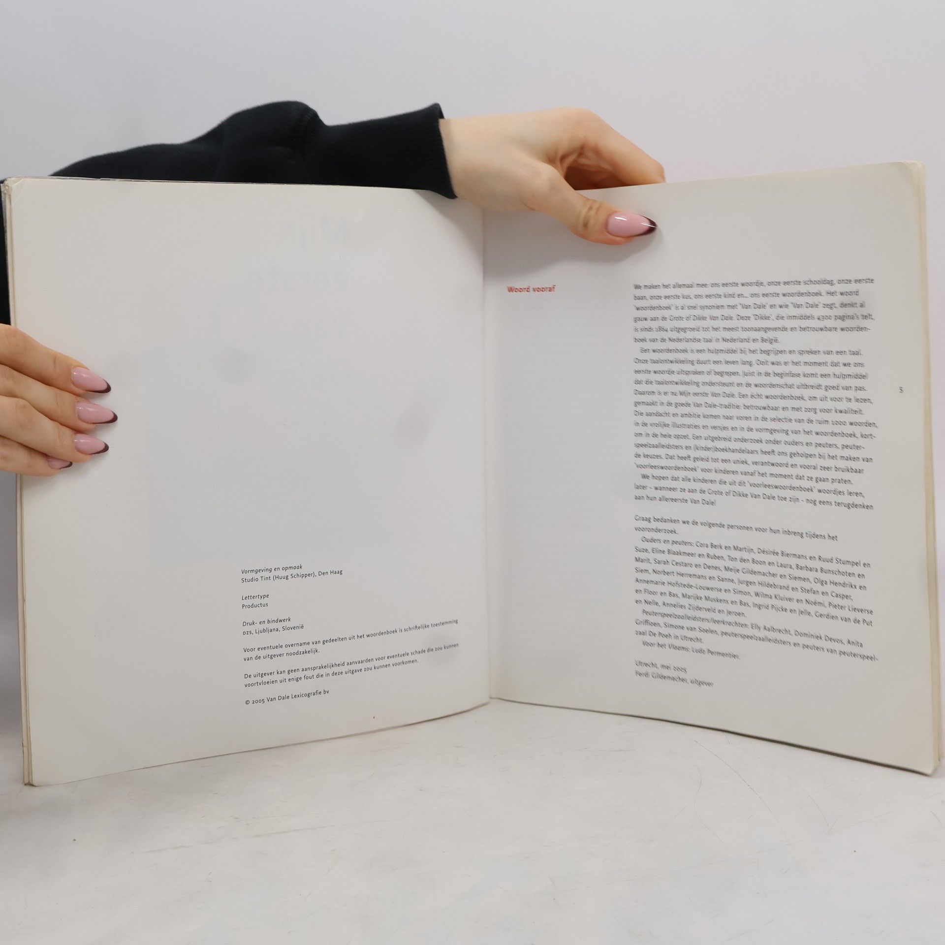 Alleen voor iBooks Mijn eerste Van Dale samen met jou Kennismaken met nieuwe woorden voor peuters vanaf 3 jaar. Dit themaboekje bevat 42 woorden rond het thema bij de dieren. De woorden worden beschreven in een versje en nog eens verduidelijkt met een vrolijke tekening. De versjes nodigen uit tot nazeggen en helpen bij het onthouden van de betekenis. De reeks Mijn eerste Van Dale themaboekjes bestaat uit 6 deeltjes met thema's die aansluiten bij de belevingswereld van kinderen van drie tot ongeveer vier jaar: naar buiten, bij de dieren, op weg, aan het werk, in huis, samen met jou. Speciaal voor jonge kinderen heeft Van Dale een reeks kinderwoordenboeken ontwikkeld. Woorden worden hierin spelenderwijs aangeleerd door voor te lezen of samen te lezen. De woorden zijn geselecteerd op basis van onderzoek naar kindertaalverwerving. De reeks is prachtig geïllustreerd. Het eerste deel uit de reeks Van Dale-kinderwoordenboeken is Mijn eerste Van Dale. Mijn eerste Van Dale themaboekjes vormen een uitbreiding op dit succesvolle voorleeswoordenboek. De themaboekjes bevatten wat moeilijker woorden dan in Mijn eerste Van Dale voorleeswoordenboek.