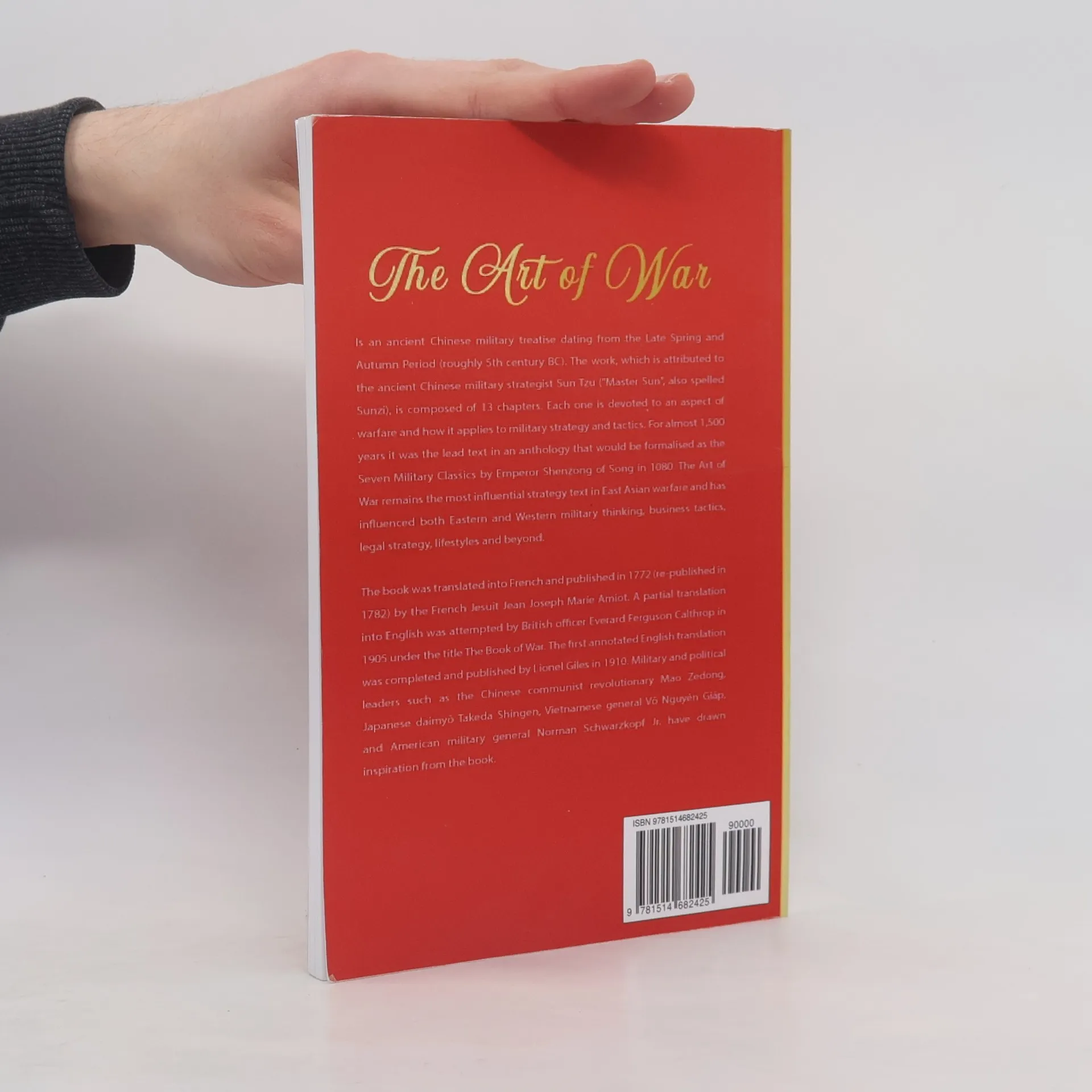 The Art of War is an ancient Chinese military treatise attributed to Sun Tzu, a high-ranking military general, strategist and tactician. The text is composed of 13 chapters, each of which is devoted to one aspect of warfare. It is commonly known to be the definitive work on military strategy and tactics of its time. It has been the most famous and influential of China's Seven Military Classics, and "for the last two thousand years it remained the most important military treatise in Asia, where even the common people knew it by name." It has had an influence on Eastern and Western military thinking, business tactics, legal strategy and beyond. The book was first translated into the French language in 1772 by French Jesuit Jean Joseph Marie Amiot and a partial translation into English was attempted by British officer Everard Ferguson Calthrop in 1905. The first annotated English language translation was completed and published by Lionel Giles in 1910. Leaders as diverse as Mao Zedong, General Vo Nguyen Giap, General Douglas MacArthur and leaders of Imperial Japan have drawn inspiration from the work.