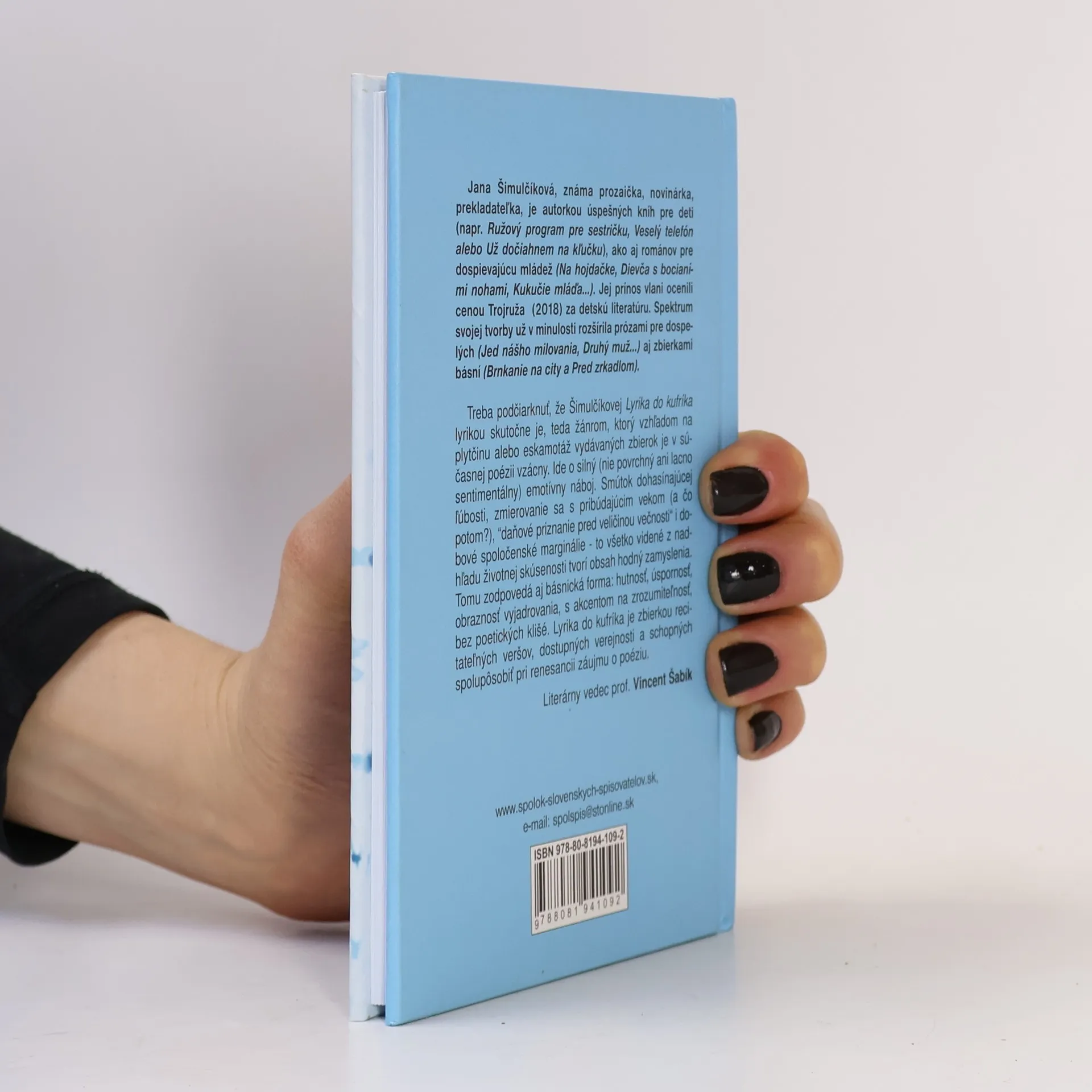 Jana Šimulčíková, známa prozaička, novinárka, prekladateľka, je autorkou úspešných kníh pre deti, ako aj románov pre dospievajúcu mládež. Jej prínos vlani ocenili cenou Trojruža (2018) za detskú literatúru. Ako poznamenáva literárny vedec prof. V. Šabík, „treba podčiarknuť, že „Šimulčíkovej Lyrika do kufríka lyrikou skutočne je, teda žánrom, ktorý vzhľadom na plytčinu alebo eskamotáž vydávaných zbierok je v súčasnej poézii vzácny. Ide o silný (nie povrchný ani lacno sentimentálny) emotívny náboj. Smútok dohasínajúcej ľúbosti, zmierovanie sa s pribúdajúcim vekom (a čo potom?) ,daňové priznanie pred veličinou večnosti? i dobové spoločenské marginálie – to všetko videné z nadhľadu životnej skúsenosti tvorí obsah hodný zamyslenia. Tomu zodpovedá aj básnická forma: hutnosť, úspornosť, obraznosť vyjadrovania, s akcentom na zrozumiteľnosť, bez poetických klišé.“ Lyrika do kufríka (vydal Spolok slovenských spisovateľov) je zbierkou recitateľných veršov, dostupných verejnosti a schopných spolupôsobiť pri renesancii záujmu o poéziu.