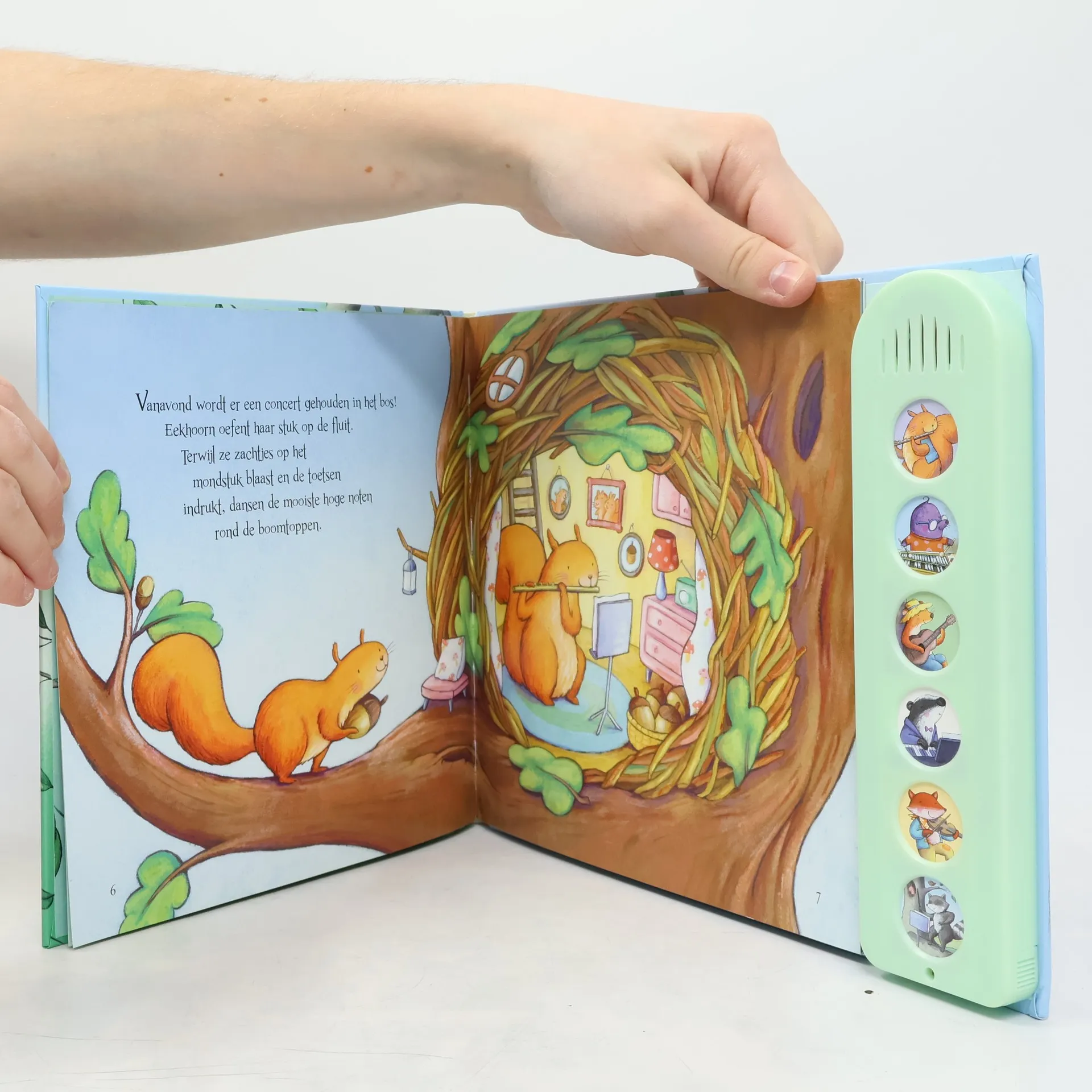 In bet bos wordt een concert gehouden. Alle dieren zijn thuis druk aan het oefenen: Eekhoorn op haar fluit, meneer Mol op de xylofoon en Wezel op zijn gitaar. Oblong prentenboek met paginagrote kleurenillustraties en geluidsknoppen. Vanaf ca. 2 jaar.