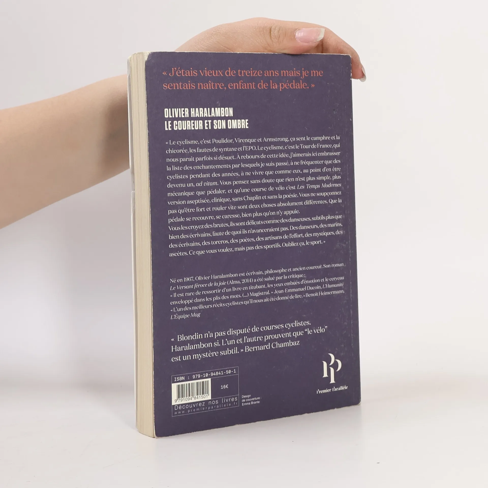 Le cyclisme, c'est le Tour de France, devant lequel vous ne cessez de vous ennuyer qu'en vous endormant. Rien de plus ennuyeux. Le cyclisme, c'est Poulidor, Richard Virenque et Lance Armstrong, ça sent le camphre et la chicorée, les fautes de syntaxe et l'EPO. A rebours de cette idée, j'aimerais ici embrasser la liste des enchantements par lesquels je suis passé à fréquenter que des cyclistes pendant des années, à ne vivre que comme eux, au point d'en être devenu un, ad vitam. J'ai dû me rendre à l'évidence : les livres ne rendent pas plus malins, la course cycliste oui. La course cycliste a la vertu de vous de tromper. Vous pensez sans doute que rien n'est plus simple, plus mécanique que pédaler, et qu'une course de vélo c'est Les Temps Modernes version aseptisée, clinique, sans Chaplin et sans la poésie. Vous ne soupçonnez pas qu'être fort et rouler vite sont deux choses absolument différentes. Que la pédale se recouvre, se caresse, bien plus qu'on n'y appuie. Vous les croyez des brutes, ils sont délicats comme des danseuses, subtils plus que bien des écrivains, faute de quoi ils n'avanceraient pas. Olivier Haralambon, écrivain a la puissance évocatrice exceptionnelle, philosophe et ancien coureur, offre ici un chant d'amour au cyclisme, dans la lignée des plus grands écrivains sportifs, Antoine Blondin en tête, des plus grands écrivains tout court.