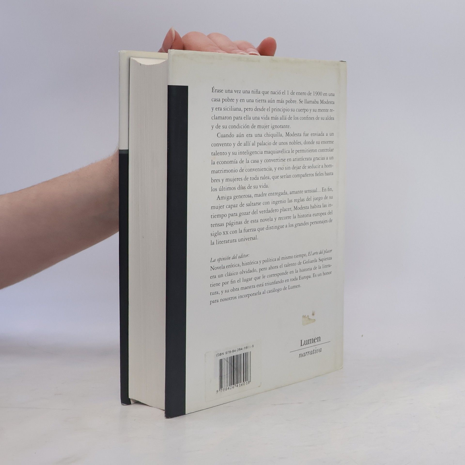 Érase una vez una niña que nació el 1 de enero de 1900 en una casa pobre y en una tierra aún más pobre. Se llamaba Modesta y era siciliana, pero desde el principio su cuerpo y su mente reclamaron para ella una vida más allá de los confines de su aldea y de su condición de mujer ignorante.Cuando aún era una chiquilla, Modesta fue enviada a un convento y de allí al palacio de unos nobles, donde su enorme talento y su inteligencia maquiavélica le permitieron controlar la economía de la casa y convertirse en aristócrata gracias a un matrimonio de conveniencia, y eso sin dejar de seducir a hombres y mujeres de toda ralea, que serían compañeros fieles hasta los últimos días de su vida.Amiga generosa, madre entregada, amante sensual... En fin, mujer capaz de saltarse con ingenio las reglas del juego de su tiempo para gozar del verdadero placer, Modesta habita las intensas páginas de esta novela y recorre la historia europea del siglo con la fuerza que distingue a los grandes personajes de la literatura universal.
