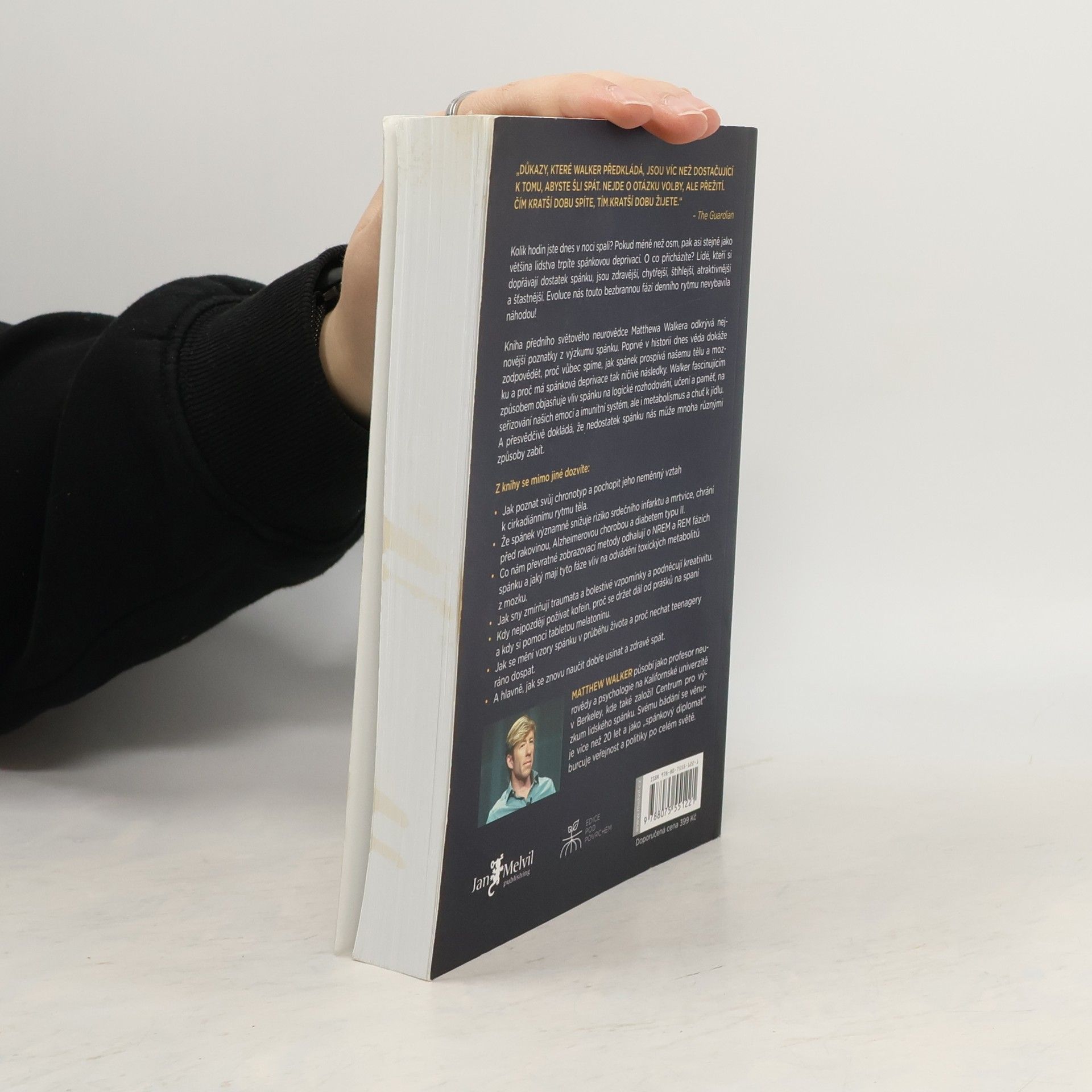 Kolik hodin jste dnes v noci spali? Pokud méně než osm, pak asi stejně jako většina lidstva trpíte spánkovou deprivací. O co přicházíte? Lidé, kteří si dopřávají dostatek spánku, jsou zdravější, chytřejší, štíhlejší, atraktivnější a šťastnější. Evoluce nás touto bezbrannou fází denního rytmu nevybavila náhodou! Kniha předního světového neurovědce Matthewa Walkera odkrývá nejnovější poznatky z výzkumu spánku. Poprvé v historii dnes věda dokáže zodpovědět, proč vůbec spíme, jak spánek prospívá našemu tělu a mozku a proč má spánková deprivace tak ničivé následky. Walker fascinujícím způsobem objasňuje vliv spánku na logické rozhodování, učení a paměť, na seřizování našich emocí a imunitní systém, ale i metabolismus a chuť k jídlu. A přesvědčivě dokládá, že nedostatek spánku nás může mnoha různými způsoby zabít.
