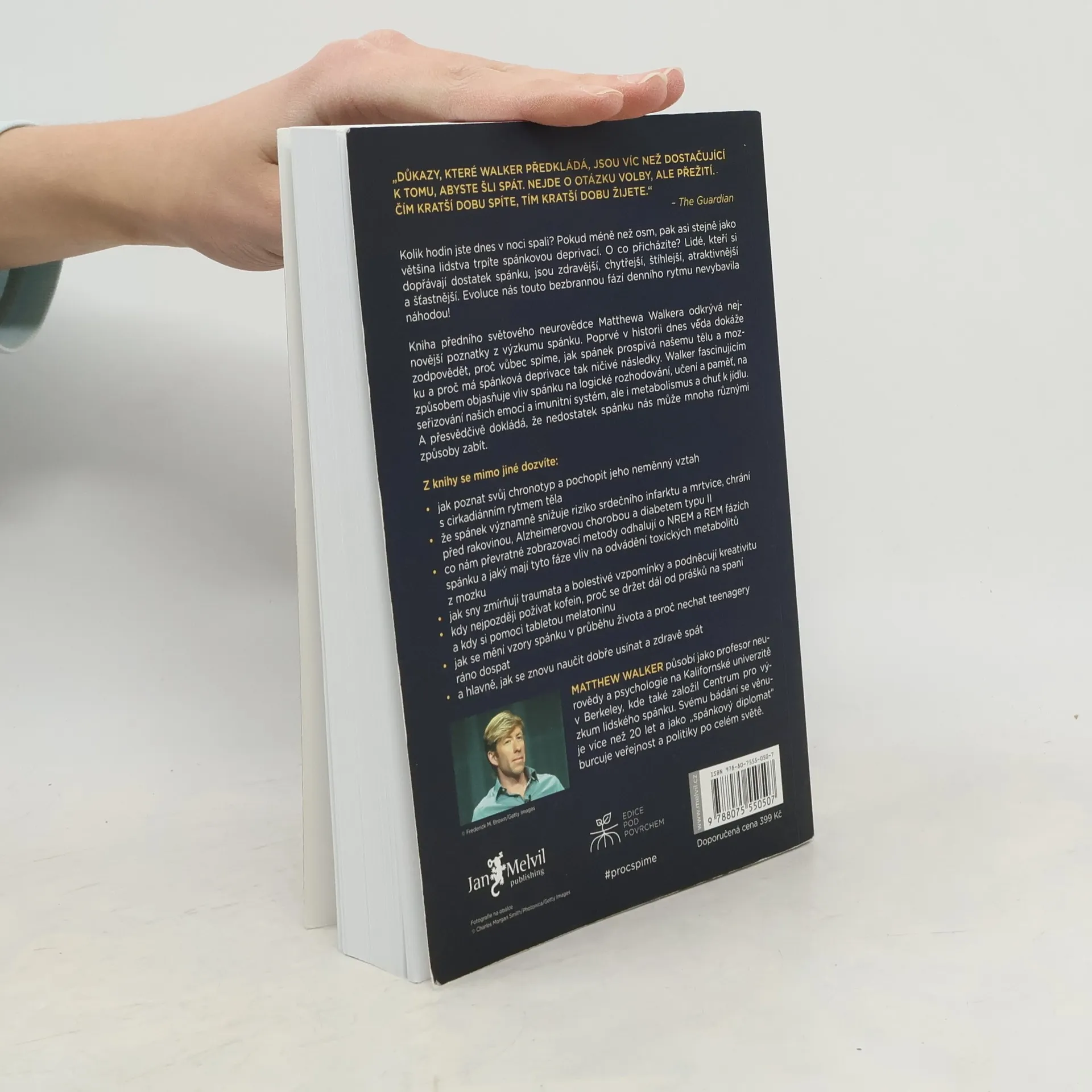 Kolik hodin jste dnes v noci spali? Pokud méně než osm, pak asi stejně jako většina lidstva trpíte spánkovou deprivací. O co přicházíte? Lidé, kteří si dopřávají dostatek spánku, jsou zdravější, chytřejší, štíhlejší, atraktivnější a šťastnější. Evoluce nás touto bezbrannou fází denního rytmu nevybavila náhodou! Kniha předního světového neurovědce Matthewa Walkera odkrývá nejnovější poznatky z výzkumu spánku. Poprvé v historii dnes věda dokáže zodpovědět, proč vůbec spíme, jak spánek prospívá našemu tělu a mozku a proč má spánková deprivace tak ničivé následky. Walker fascinujícím způsobem objasňuje vliv spánku na logické rozhodování, učení a paměť, na seřizování našich emocí a imunitní systém, ale i metabolismus a chuť k jídlu. A přesvědčivě dokládá, že nedostatek spánku nás může mnoha různými způsoby zabít.