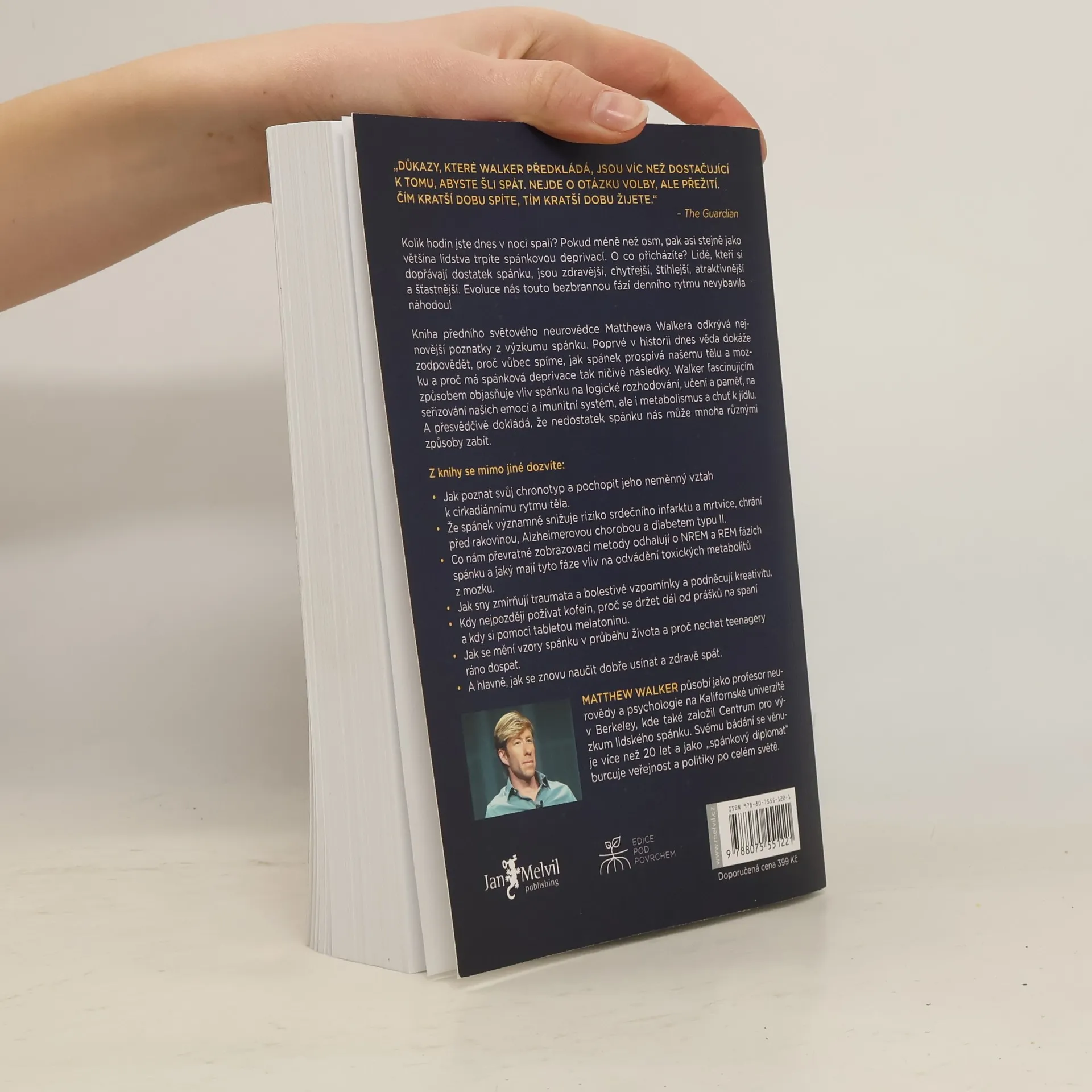 Kolik hodin jste dnes v noci spali? Pokud méně než osm, pak asi stejně jako většina lidstva trpíte spánkovou deprivací. O co přicházíte? Lidé, kteří si dopřávají dostatek spánku, jsou zdravější, chytřejší, štíhlejší, atraktivnější a šťastnější. Evoluce nás touto bezbrannou fází denního rytmu nevybavila náhodou! Kniha předního světového neurovědce Matthewa Walkera odkrývá nejnovější poznatky z výzkumu spánku. Poprvé v historii dnes věda dokáže zodpovědět, proč vůbec spíme, jak spánek prospívá našemu tělu a mozku a proč má spánková deprivace tak ničivé následky. Walker fascinujícím způsobem objasňuje vliv spánku na logické rozhodování, učení a paměť, na seřizování našich emocí a imunitní systém, ale i metabolismus a chuť k jídlu. A přesvědčivě dokládá, že nedostatek spánku nás může mnoha různými způsoby zabít.
