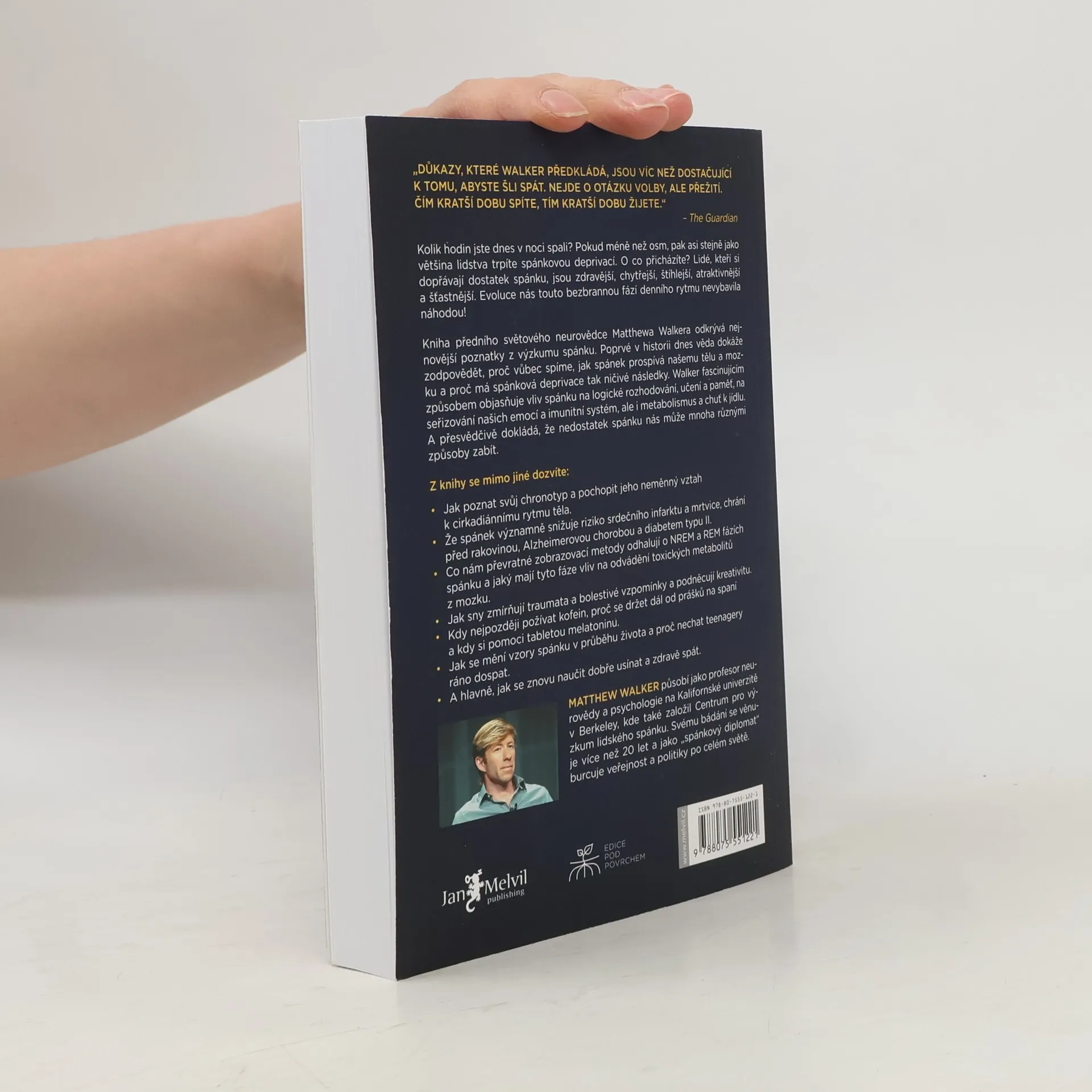Kolik hodin jste dnes v noci spali? Pokud méně než osm, pak asi stejně jako většina lidstva trpíte spánkovou deprivací. O co přicházíte? Lidé, kteří si dopřávají dostatek spánku, jsou zdravější, chytřejší, štíhlejší, atraktivnější a šťastnější. Evoluce nás touto bezbrannou fází denního rytmu nevybavila náhodou! Kniha předního světového neurovědce Matthewa Walkera odkrývá nejnovější poznatky z výzkumu spánku. Poprvé v historii dnes věda dokáže zodpovědět, proč vůbec spíme, jak spánek prospívá našemu tělu a mozku a proč má spánková deprivace tak ničivé následky. Walker fascinujícím způsobem objasňuje vliv spánku na logické rozhodování, učení a paměť, na seřizování našich emocí a imunitní systém, ale i metabolismus a chuť k jídlu. A přesvědčivě dokládá, že nedostatek spánku nás může mnoha různými způsoby zabít.