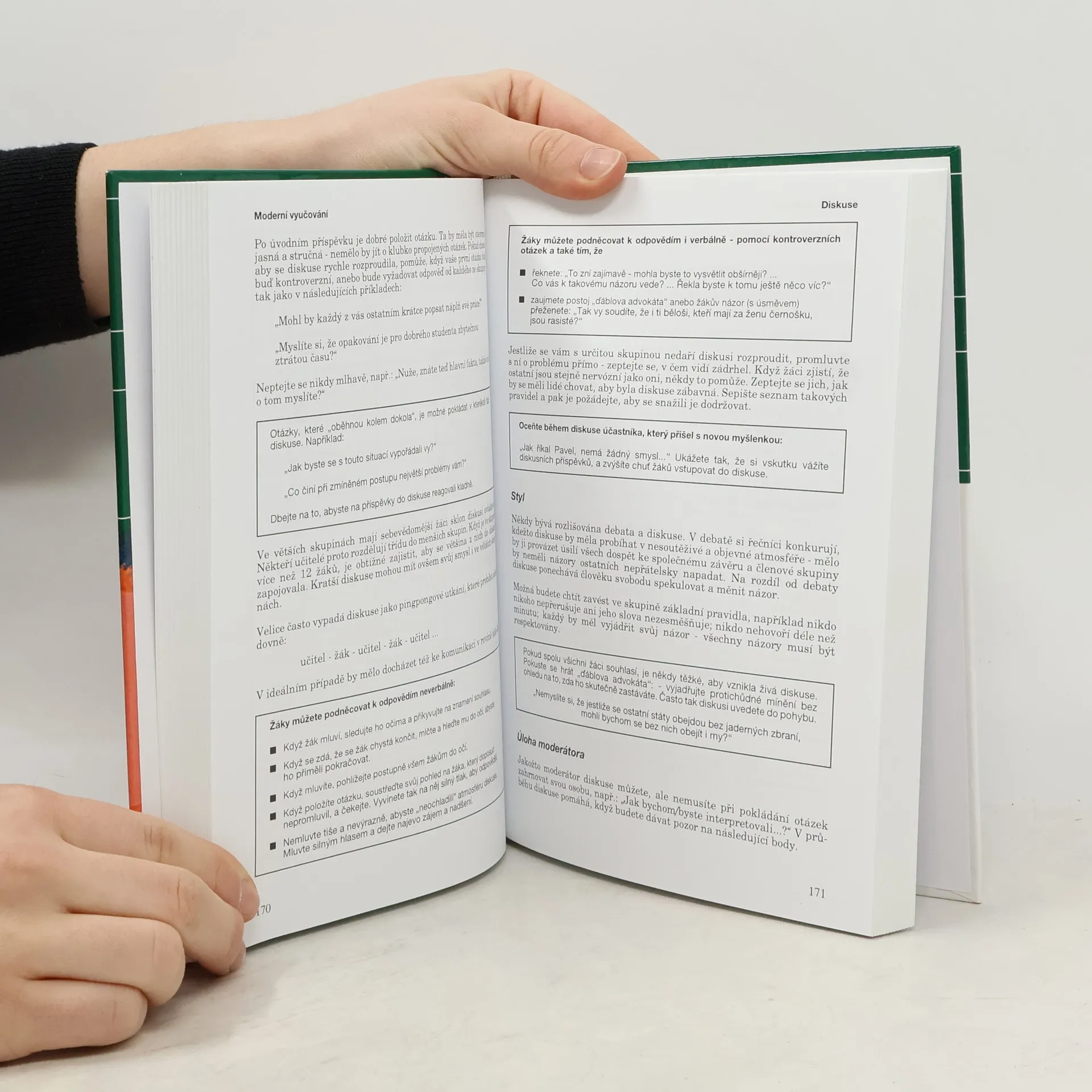 Základní příručka shrnuje psychologická východiska a moderní metody současné pedagogiky a didaktiky. První oddíl je věnován motivaci studentů a soustřeďuje se na vztah učitel - žák a problematiku kázně ve třídě. Druhý oddíl pojednává o metodách učení, analyzuje je a probírá jejich přednosti a nevýhody v konkrétních situacích. Třetí oddíl je zaměřen na učební pomůcky (od plakátů po video) a jejich využití ve výuce. Poslední část knihy vede k zamyšlení nad konkrétní přípravou vyučování.