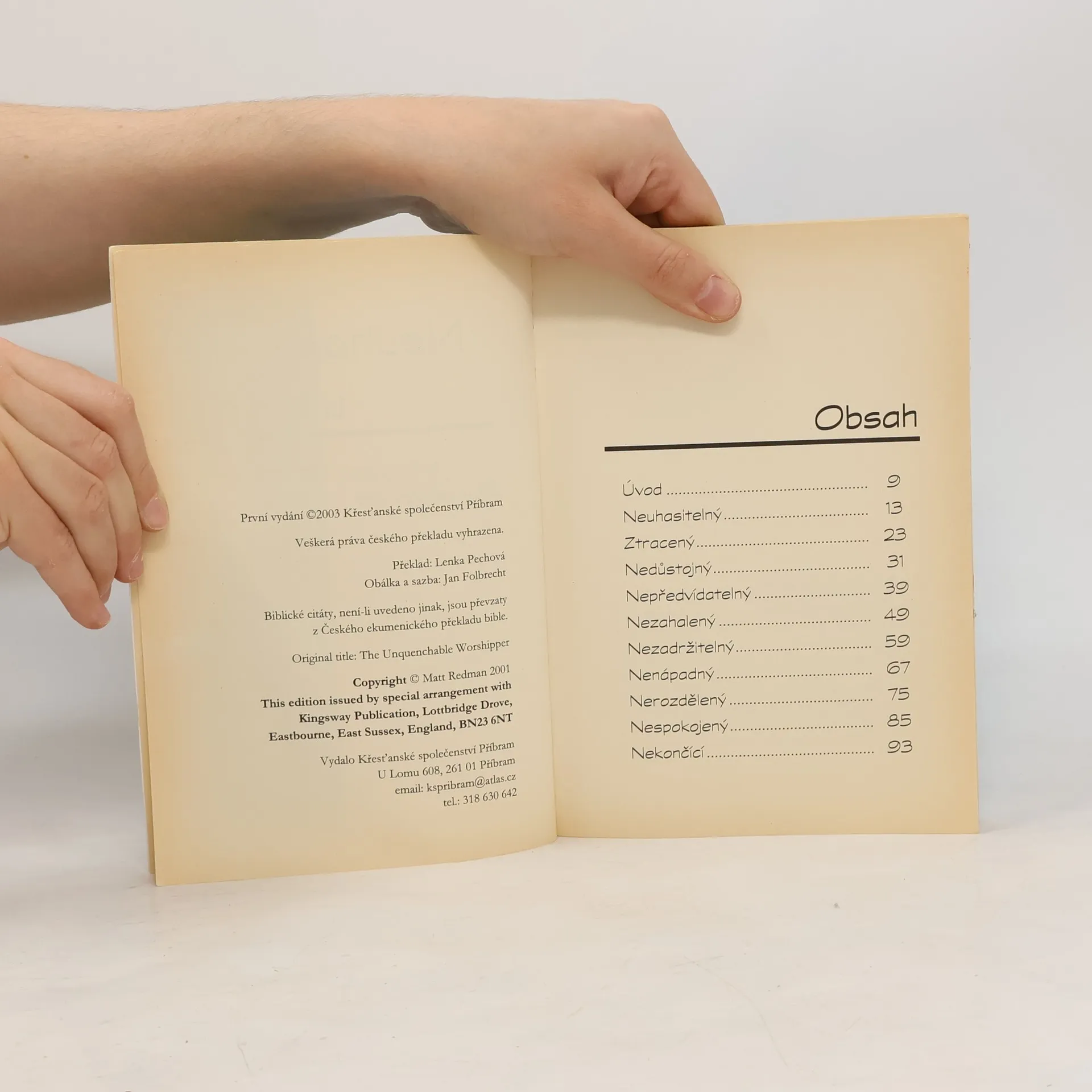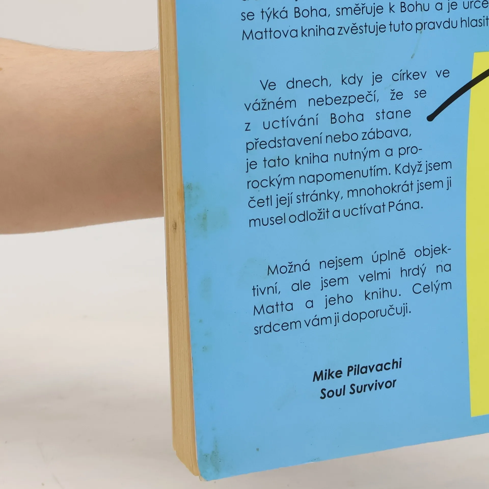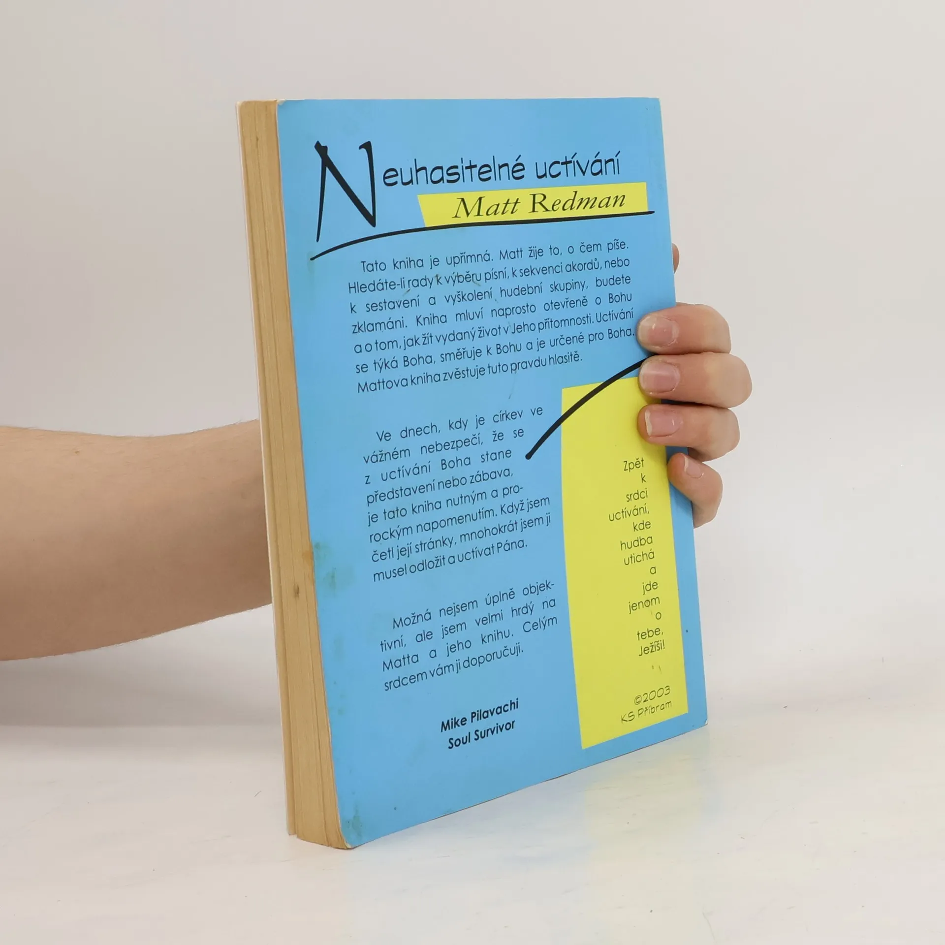 Obálkový podnázev: zpět k srdci uctívání. Hledáte-li rady k výběru písní, k sekvenci akordů, nebo k sestavení a vyškolení hudební skupiny, budete zklamáni. Kniha mluví naprosto otevřeně o Bohu a o tom, jak žít vydaný život v Jeho přítomnosti. Tato kniha je upřímná. Matt žije to, o čem píše. Ve dnech, kdy je církev ve vážném nebezpečí, že se z uctívání Boha stane představení nebo zábava, je tato kniha nutným a prorockým napomenutím.