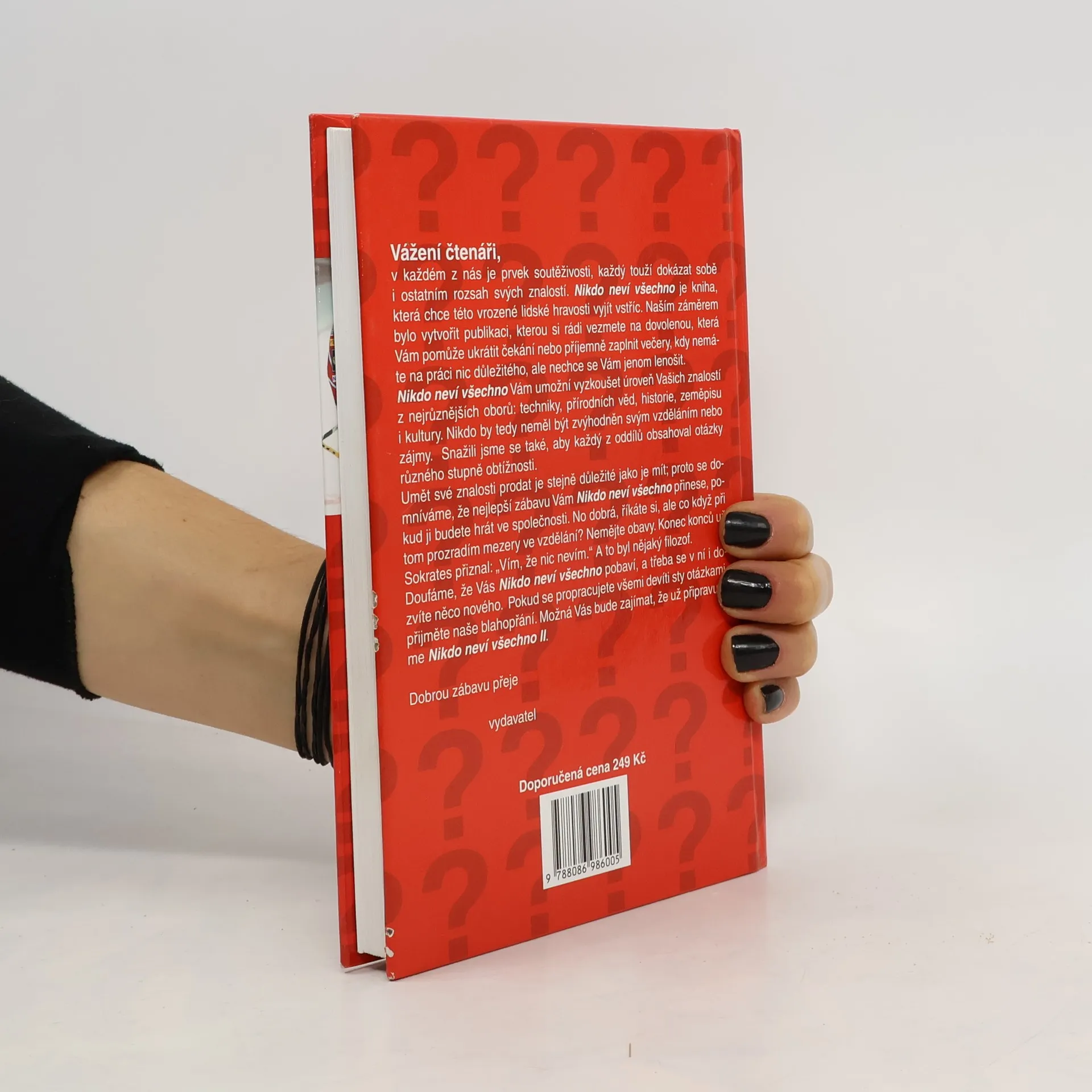 Velká kniha testů a kvizových otázek, která Vám umožní vyzkoušet úroveň znalostí z nejrůznějších oborů: techniky, přírodních věd, historie, zeměpisu i kultury. Kniha obsahuje 900 otázek rozdělených do 30 testových oddílů obsahujících otázky z různých oborů a s různým stupněm obtížnosti. Nejlepší zábavu přinese pokud ji použijete jako vědomostní hru s příteli, ale i Vy sami si můžete osvěžit svoje vědomosti.