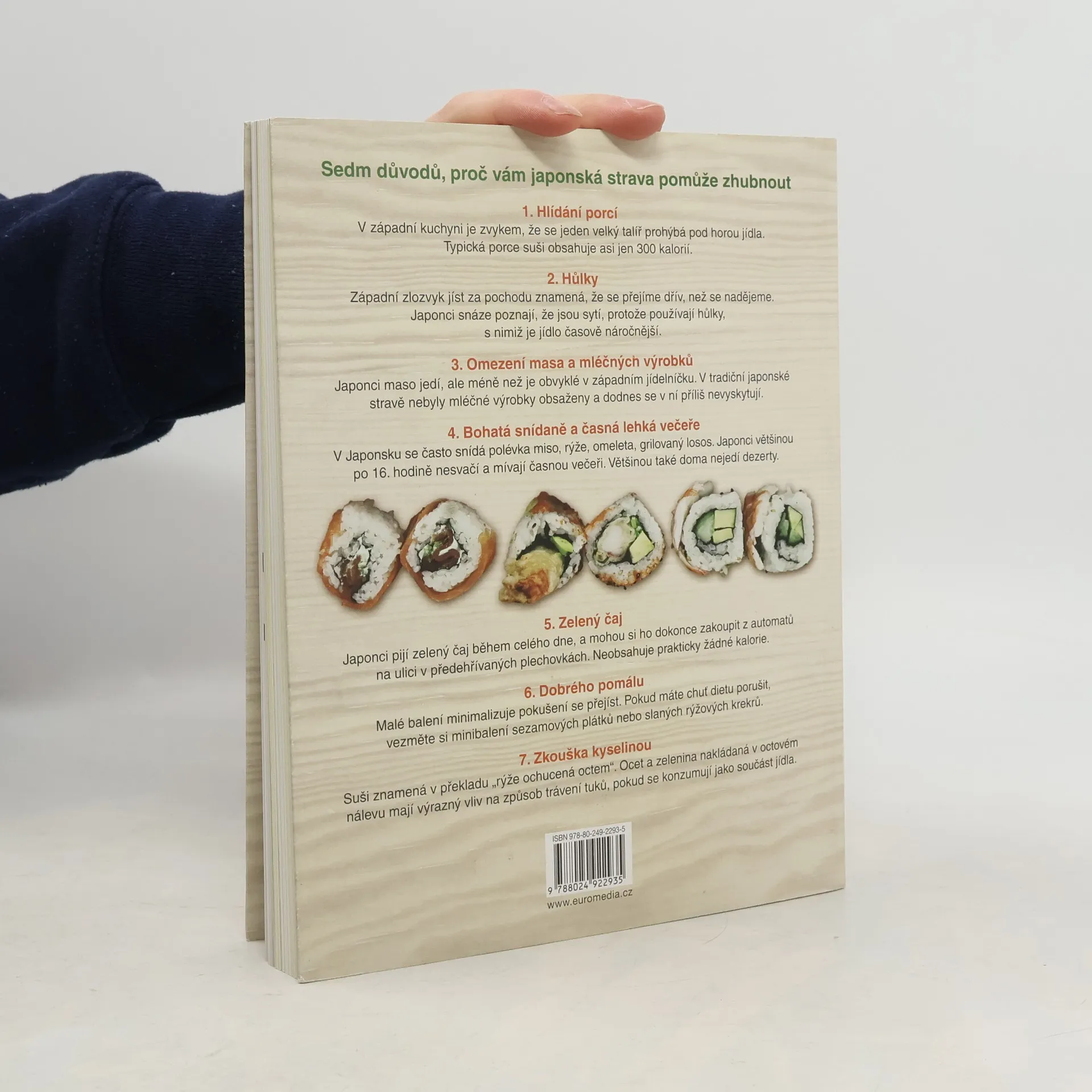 Jak zhubnout a udržet si štíhlost s japonskými pokrmy Jak to Japonky dělají, že jsou stále štíhlé? Jejich strava je zdravá, chutná a pomáhá při hubnutí. Co a kdy jíst je zakotveno v tradici a založeno na neodmyslitelných přísadách, k nimž patří rýže, miso, wasabi, ryby, čaj… Vyberte si z 50 jedinečných druhů suši nebo z bohaté nabídky polévek a salátů královny suši Makiko Sano. Nechte se zlákat svačinovým bento boxem o 500 kaloriích a naobědvejte se přímo u pracovního stolu. U všech receptů je uveden počet kalorií, aby bylo hubnutí ještě snazší.