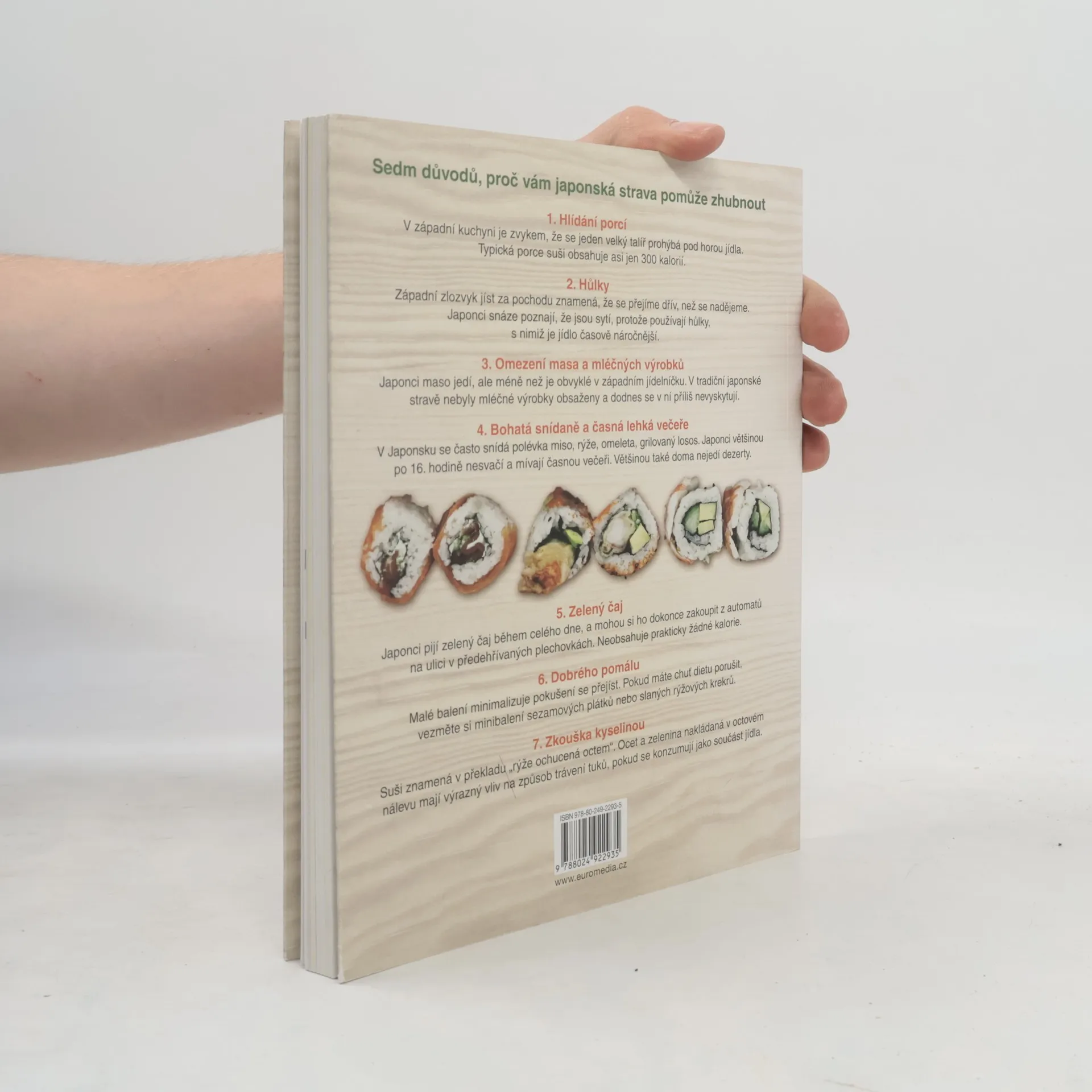 Jak zhubnout a udržet si štíhlost s japonskými pokrmy Jak to Japonky dělají, že jsou stále štíhlé? Jejich strava je zdravá, chutná a pomáhá při hubnutí. Co a kdy jíst je zakotveno v tradici a založeno na neodmyslitelných přísadách, k nimž patří rýže, miso, wasabi, ryby, čaj… Vyberte si z 50 jedinečných druhů suši nebo z bohaté nabídky polévek a salátů královny suši Makiko Sano. Nechte se zlákat svačinovým bento boxem o 500 kaloriích a naobědvejte se přímo u pracovního stolu. U všech receptů je uveden počet kalorií, aby bylo hubnutí ještě snazší.