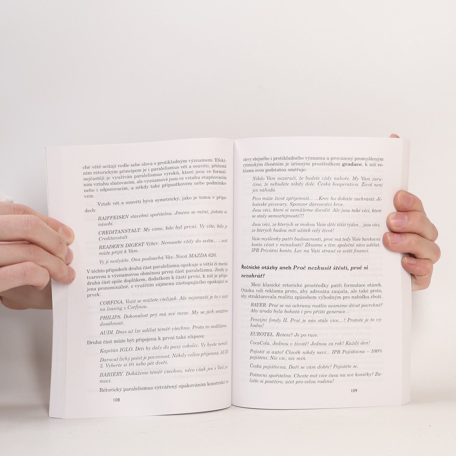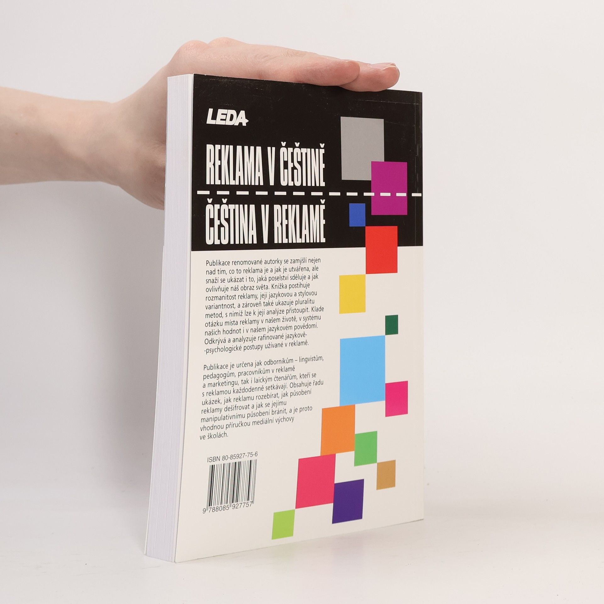 Publikace analyzující reklamu z převážně lingvistického a stylistického hlediska. Autorka zkoumá jazykové prostředky reklamy jako svébytného útvaru na pomezí stylistiky a umění a na řadě četných příkladů z praxe ozřejmuje nástroje, působící vědomě i nevědomě na naše myšlení a konání.