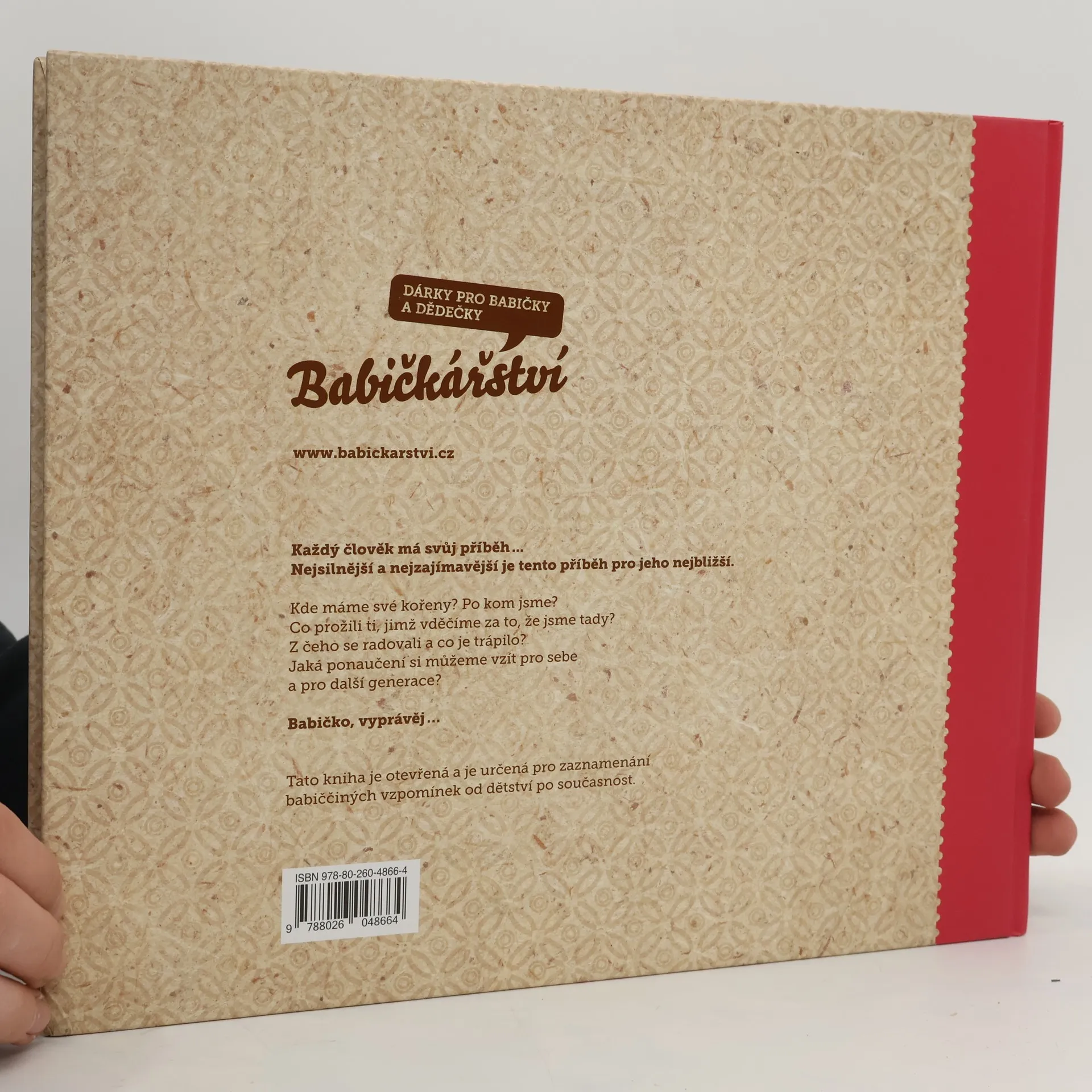 Otevřená kniha pro zaznamenání vzpomínek vaší babičky od dětství po současnost. Babička bude moci sama nebo s vaší pomocí vyplňovat knížku a odpoví tak na celou řadu pečlivě vybraných otázek. Namátkou: čím chtěla být, když byla malá, jací byli její rodiče a prarodiče, kde si hrála, kdy potkala dědečka – svého muže, co spolu zažili, jak vnímala babička historické události, co se podle ní dnes změnilo oproti době jejího mládí… Kniha se stane pro vaší babičku zábavou a pro celou vaši rodinu cenným pokladem. Doprovodné obrázky a dobové fotografie pomáhají probouzet vzpomínky. V knížce je prostor na přidání vlastních fotografií. „Babičko, vyprávěj“ je unikátním dárkem pro všechny babičky.
