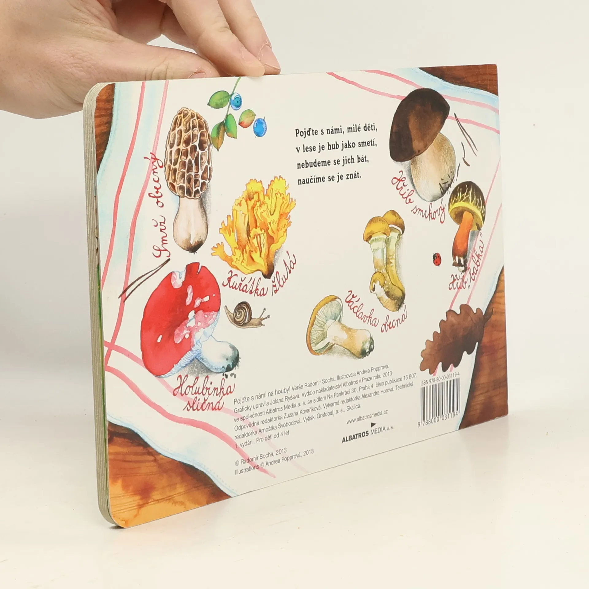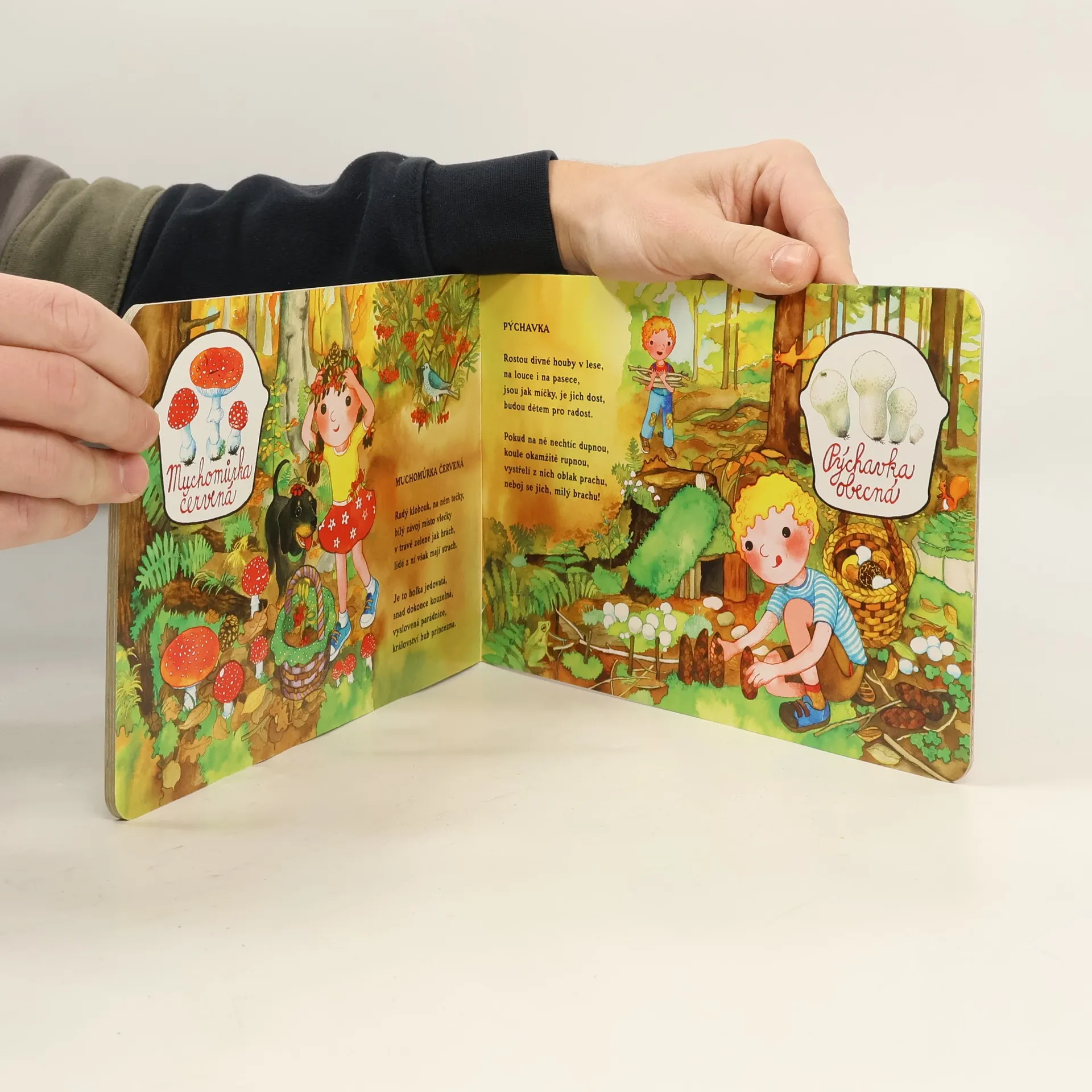 Vzhůru do lesa s veselými verši a obrázky! V poznávacím leporelu se děti seznámí s vybranými druhy hub, jedlými i nejedlými, jako jsou např. májovka, liška, holubinka, hřib modrák, křemenáč, bedla, pýchavka, muchomůrka červená či klouzek. Pojďte na houby bez obav!