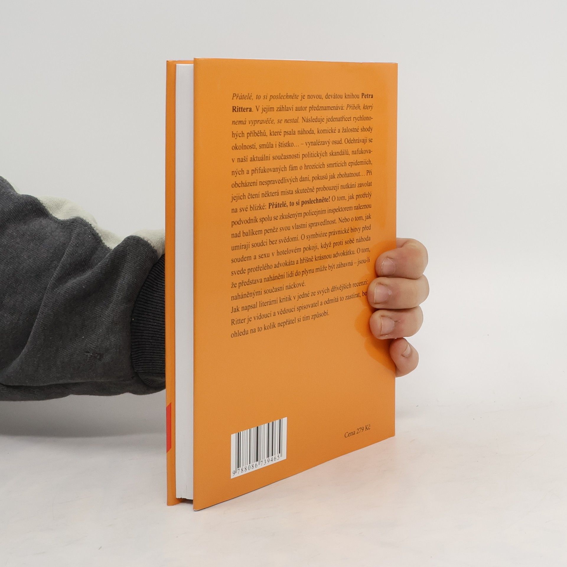Přátelé, to si poslechněte je další, devátou knihou Petra Rittera. V jejím záhlaví autor předznamenává: Příběh, který nemá vypravěče, se nestal. Následuje jedenatřicet rychlonohých příběhů, které psala náhoda, komické a žalostné shody okolností, smůla i štístko… - vynalézavý osud. Odehrávají se v naší aktuální současnosti politických skandálů, nafukovaných a přifukovaných fám o hrozících smrtících epidemiích, obcházení nespravedlivých daní, pokusů jak zbohatnout… Při jejich čtení některá místa skutečně probouzejí nutkání zavolat na své blízké: Přátelé, to si poslechněte! O tom, jak protřelý podvodník spolu se zkušeným policejním inspektorem naleznou nad balíkem peněz svou vlastní spravedlnost. Nebo o tom, jak umírají soudci bez svědomí. O symbióze právnické bitvy před soudem a sexu v hotelovém pokoji, když proti sobě náhoda svede protřelého advokáta a hříšně krásnou advokátku. O tom, že představa nahánění lidí do plynu může být zábavná - jsou-li naháněnými současní náckové. Jak napsal literární kritik v jedné ze svých dřívějších recenzí: Ritter je vidoucí a vědoucí spisovatel a odmítá to zastírat, bez ohledu na to kolik nepřátel si tím způsobí.
