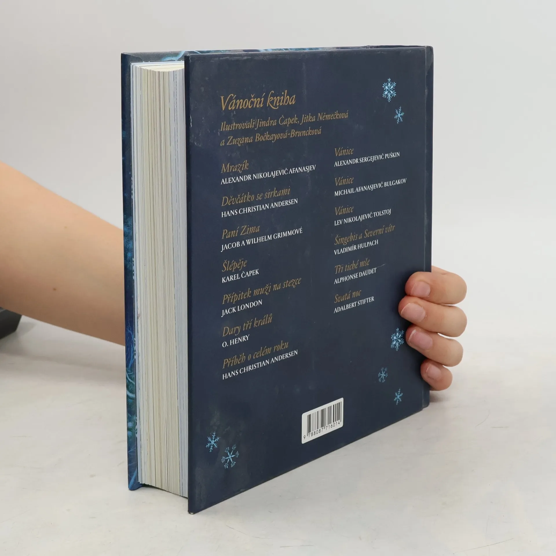 Rozsáhlý ilustrovaný soubor nejkrásnějších próz s tematikou Vánoc a zimního času od slavných světových autorů jako jsou bratři Grimmové, H. Ch. Andersen, A. S. Puškin, L. N. Tolstoj, M. A. Bulgakov, O. Henry , J. London, A. Daudet, K. Čapek aj.. Zatímco povídky promlouvají hlavně k dospělým, dětem jsou určeny vánoční pohádky. Nechybí Paní zima bratří Grimmů, ruská lidová pohádka Mrazík či Děvčátko se sirkami Hanse Christiana Andersena. Vánoční kniha obsahuje ještě celou řadu dalších příběhů, které se nejlépe čtou, když za okny sněží a v pokoji voní purpura… Vzhledem ke své obsáhlosti a velkolepé kompozici nemá kniha obdoby, obsahuje několik stovek výpravných ilustrací Jindry Čapka, Zuzany Bočkayové-Brunckové a Jitky Němečkové, kteří vytvořili překrásné výtvarné dílo oslavující poezii Vánoc.