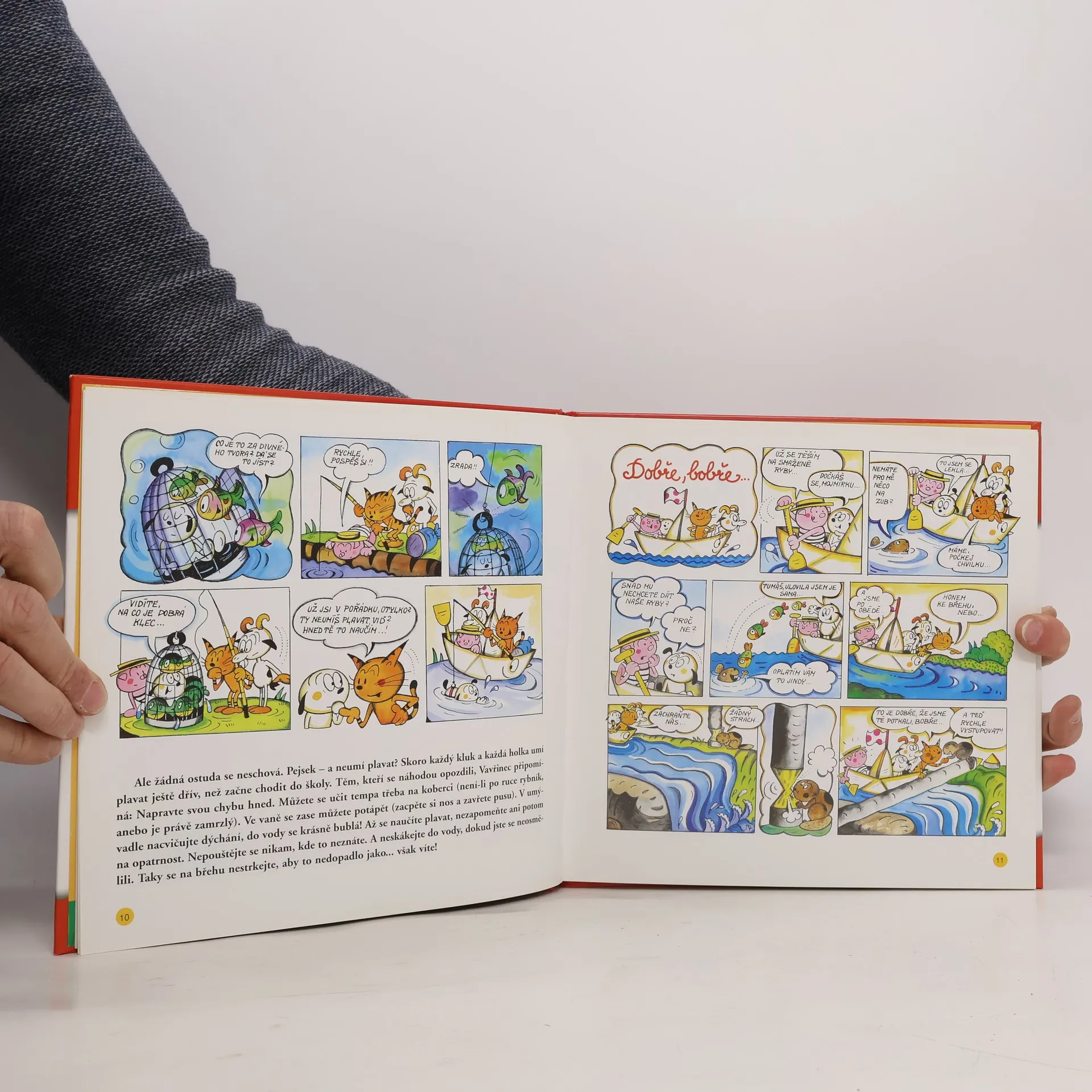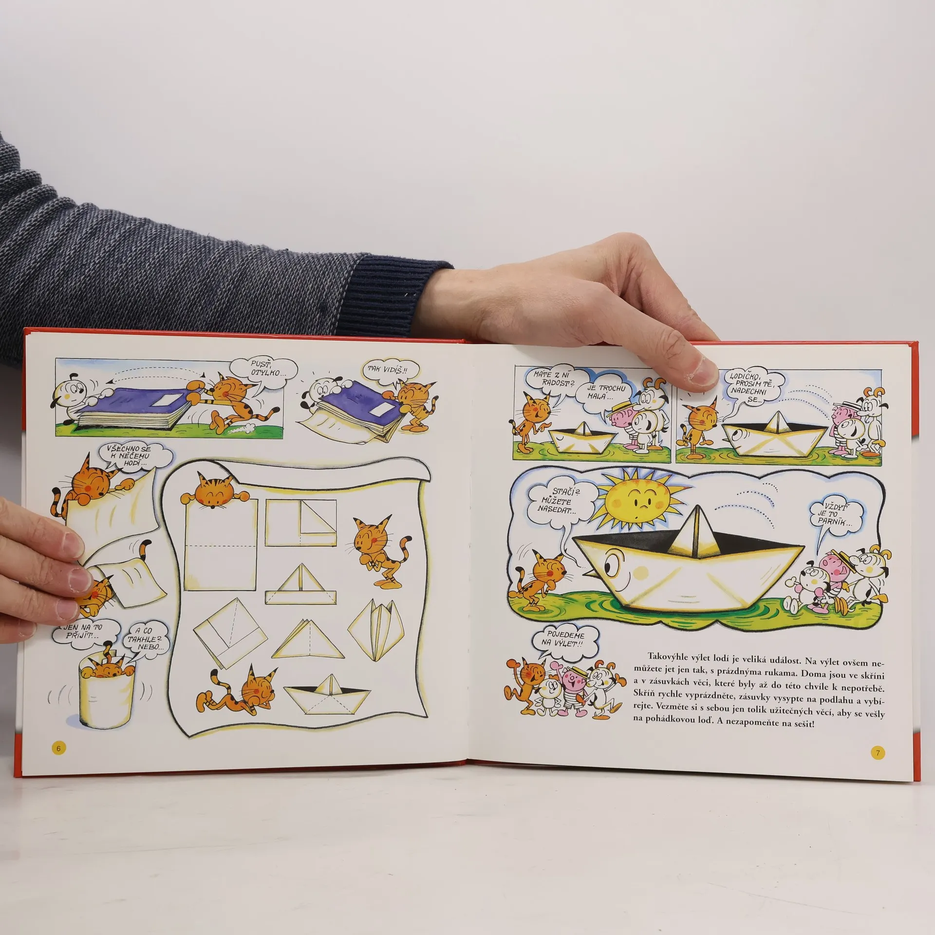 Kocour Vavřinec spolu s kamarády Otylkou, Spytihněvem a Mojmírem jsou v těch nejlepších kocouřích, psích, kozlečích a prasátkovských letech. Však brzy poznáte, co všechno dokáží. Takovýhle výlet lodí je veliká událost. Na výlet ovšem nemůžete jet jen tak, s prázdnýma rukama. Doma jsou ve skříni a v zásuvkách věci, které byly až do této chvíle k nepotřebě. Skříň rychle vyprázdněte, zásuvky vysypte na podlahu a vybírejte. Vezměte si s sebou jen tolik užitečných věcí, aby se vešly na pohádkovou loď. A nezapomeňte na sešit!
