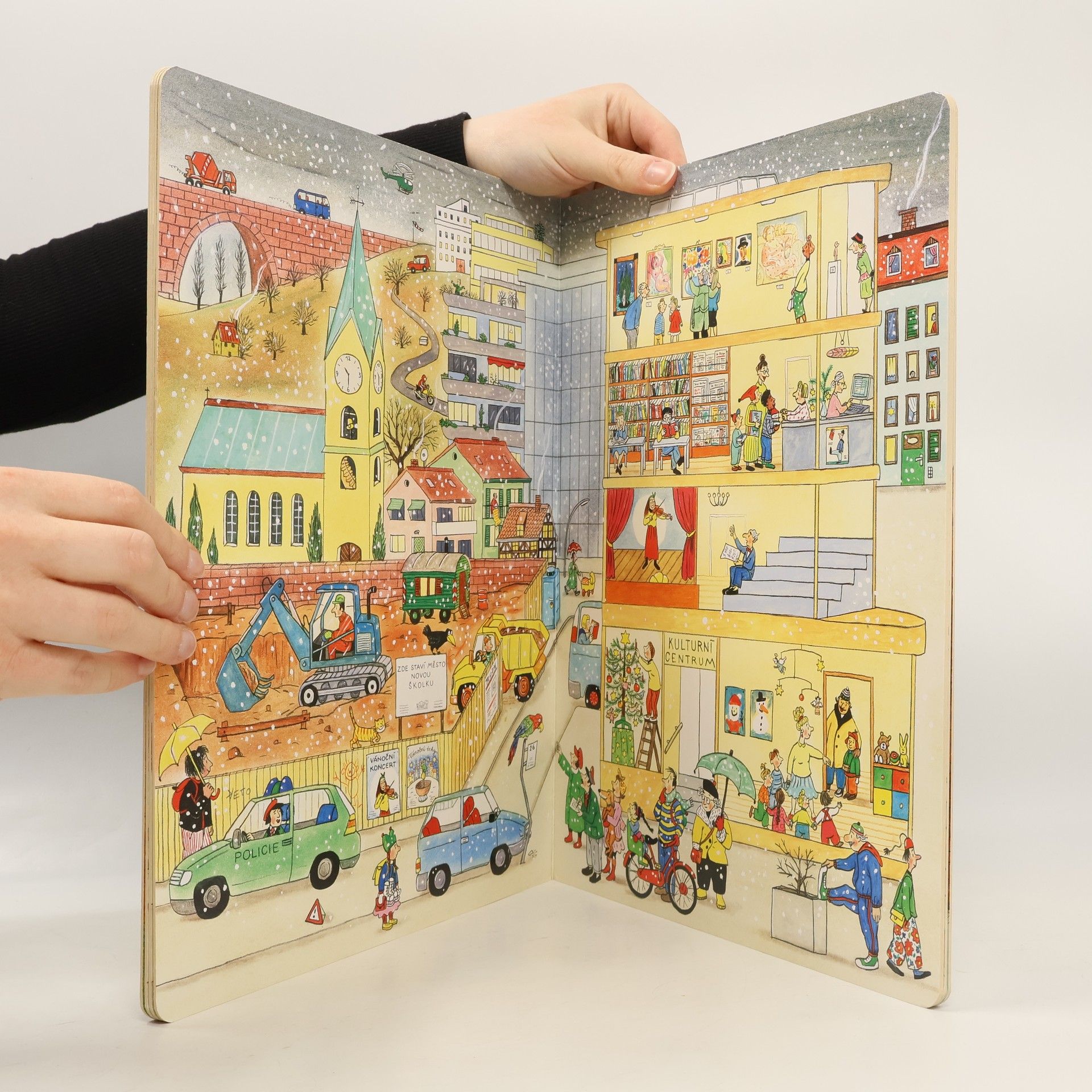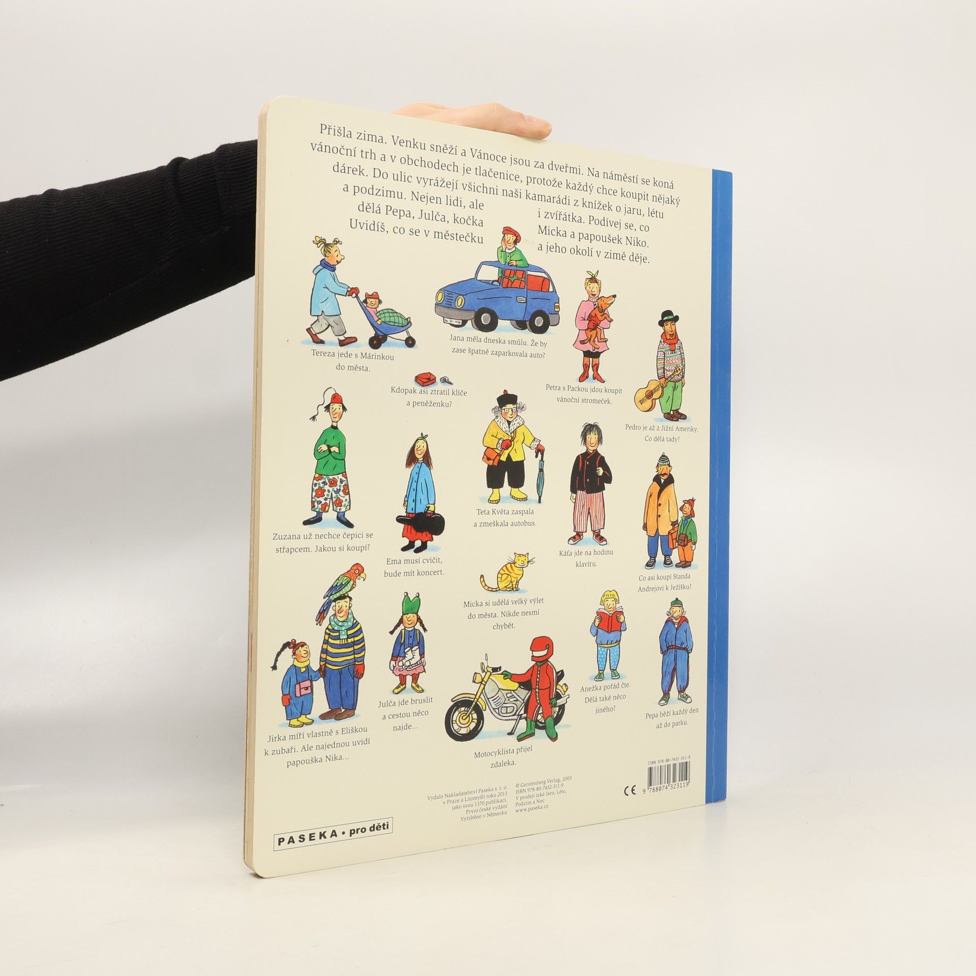 Po knížce o jaru, létu a podzimu přichází Zima. Rotraut Suzanne Bernerová na obrázcích znovu vypráví své malé, vtipné příběhy všedního dne, které poutají a bystří pozornost, podněcují fantazii a řečové schopnosti, ale hlavně baví malé i větší děti. V předvánoční atmosféře se opět setkáte s některými starými známými a kamarády z předchozích tří úspěšných knížek. Přibudou další postavy, věci a zvířátka. Jen místo zůstává stejné: město s ulicemi, domy, s tržištěm, obchody, k tomu park a nedaleký statek. Podívejte se, co všechno se v Zimě děje!