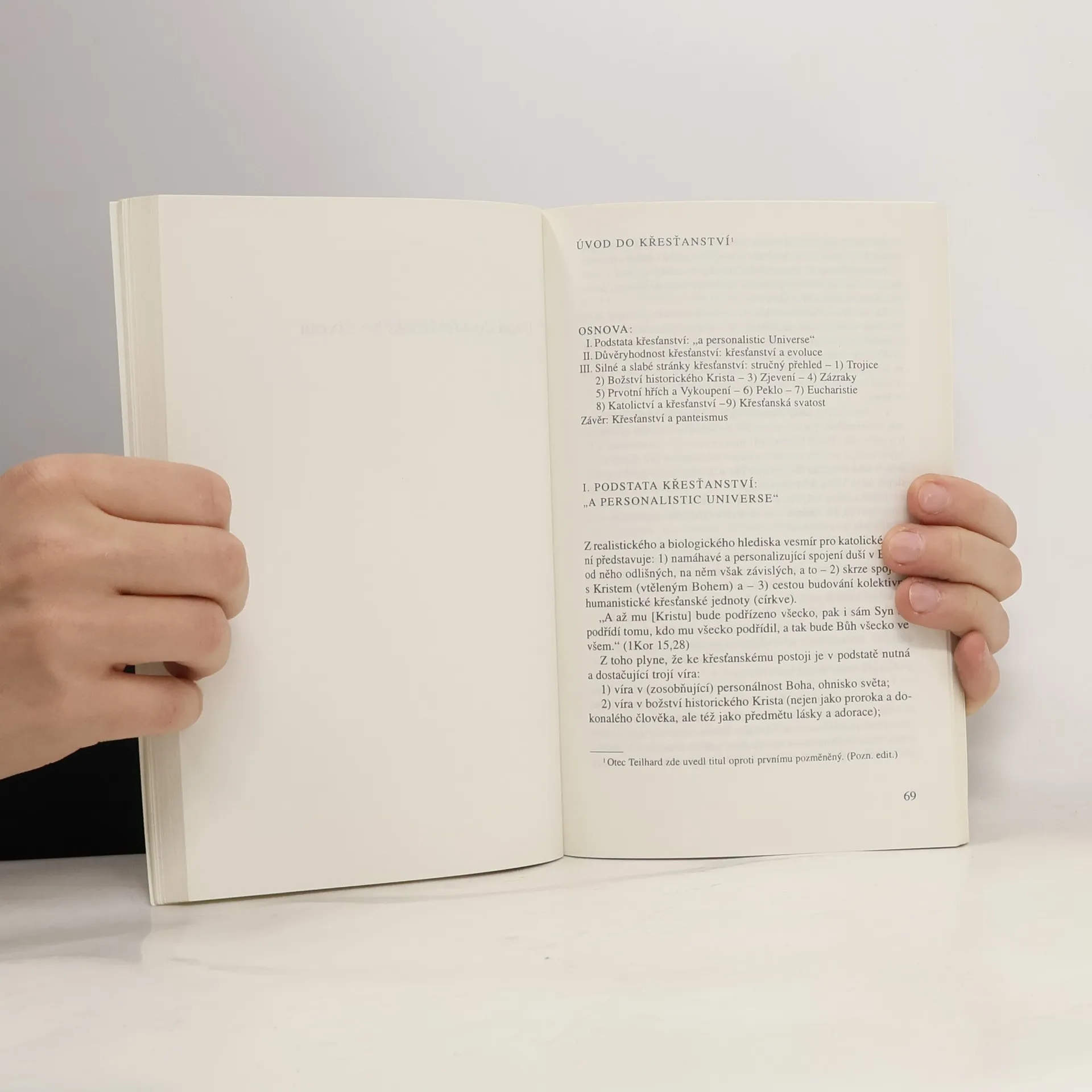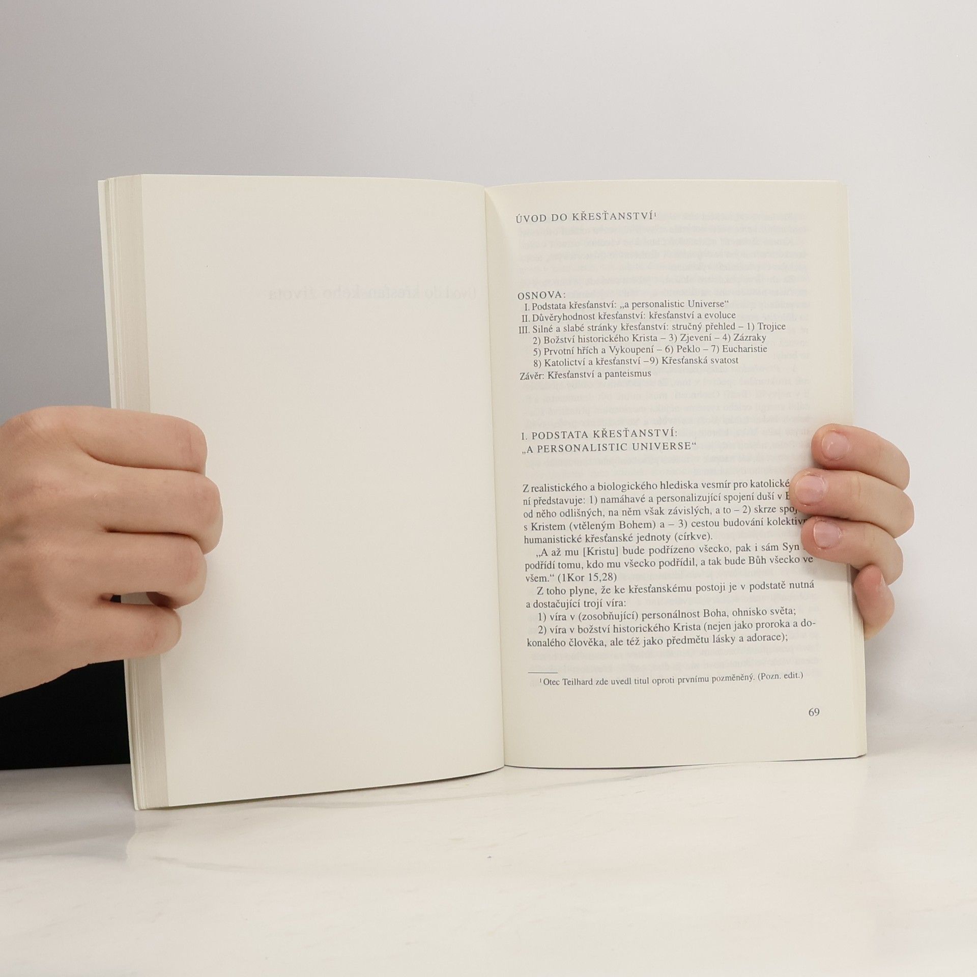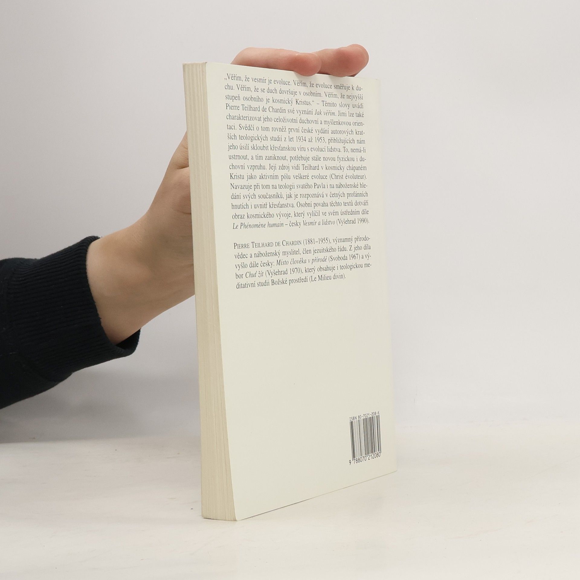 Výbor dosud u nás nevydaných textů věnovaný duchovnímu životu, inspirujícímu se hluboce myšlenkou Vykoupení i realitou vesmírného vývoje. „Věřím, že vesmír je evoluce. Věřím, že evoluce směřuje k duchu. Věřím, že se duch dovršuje v osobním. Věřím, že nejvyšší stupeň osobního je kosmický Kristus." – Těmito slovy uvádí Pierre Teilhard de Chardin své vyznání Jak věřím. Jimi lze také charakterizovat jeho celoživotní duchovní a myšlenkovou orientaci. Svědčí o tom rovněž první české vydání autorových kratších teologických studií z let 1934 až 1953, přibližujících nám jeho úsilí skloubit křesťanskou víru s evolucí lidstva. To, nemá-li ustrnout, a tím zaniknout, potřebuje stále novou fyzickou i duchovní vzpruhu. Její zdroj vidí Teilhard v kosmicky chápaném Kristu jako aktivním pólu veškeré evoluce (Christ évoluteur). Navazuje při tom na teologii svatého Pavla i na náboženské hledání svých současníků, jak je rozpoznává v četných profánních hnutích i uvnitř křesťanstva. Osobní povaha těchto textů dotváří obraz kosmického vývoje, který vylíčil ve svém ústředním díle Le Phénomène humain – česky Vesmír a lidstvo (Vyšehrad 1990). PIERRE TEILHARD DE CHARDIN (1881–1955), významný přírodovědec a náboženský myslitel, člen jezuitského řádu. Z jeho díla vyšlo dále česky: Místo člověka v přírodě (Svoboda 1967) a výbor Chuť žít (Vyšehrad 1970), který obsahuje i teologickou meditativní studii Božské prostředí (Le Milieu divin).