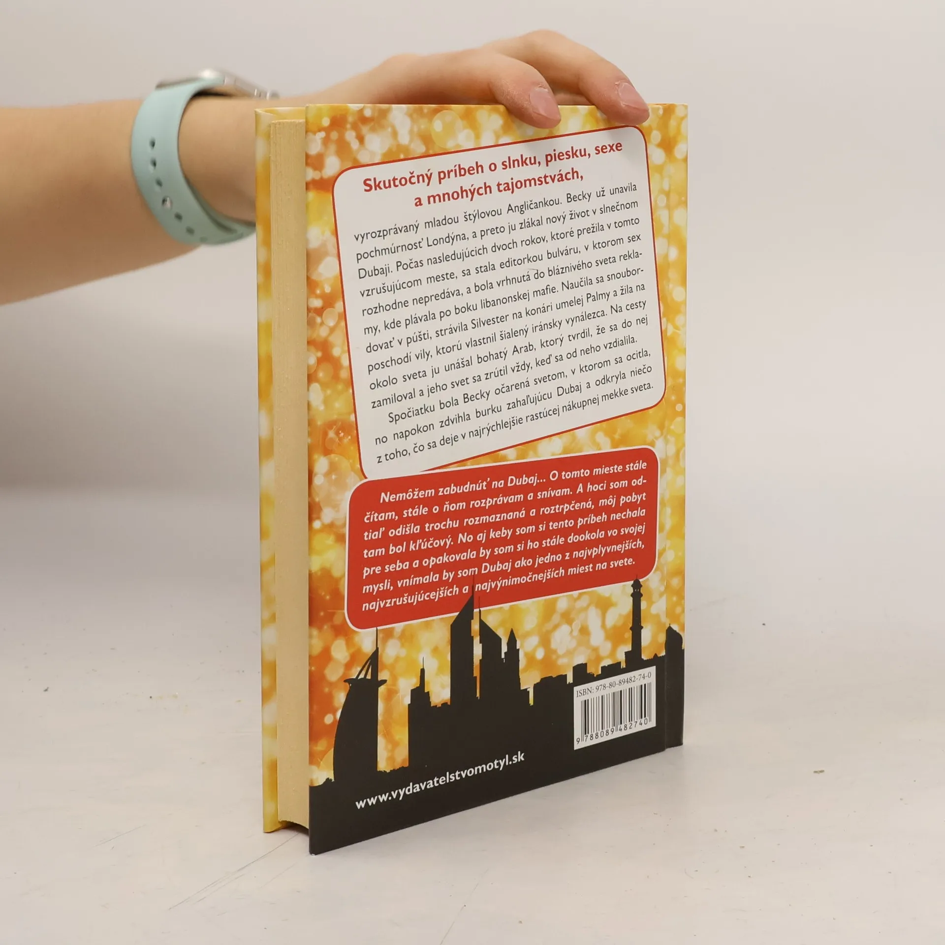 Skutočný príbeh o slnku, piesku, sexe a mnohých tajomstvách, vyrozprávaný mladou štýlovou Angličankou. Becky už unavila pochmúrnosť Londýna, a preto ju zlákal nový život v slnečnom Dubaji. Počas nasledujúcich dvoch rokov, ktoré prežila v tomto vzrušujúcom meste, sa stala editorkou bulváru, v ktorom sex rozhodne nepredáva, a bola vrhnutá do bláznivého sveta reklamy, kde plávala po boku libanonskej mafie. Naučila sa snoubordovať v púšti, strávila Silvester na konári umelej Palmy a žila na poschodí vily, ktorú vlastnil šialený iránsky vynálezca. Na cesty okolo sveta ju unášal bohatý Arab, ktorý tvrdil, že sa do nej zamiloval a jeho svet sa zrútil vždy, keď sa od neho vzdialila. Spočiatku bola Becky očarená svetom, v ktorom sa ocitla, no napokon zdvihla burku zahaľujúcu Dubaj a odkryla niečo z toho, čo sa deje v najrýchlejšie rastúcej nákupnej mekke sveta.
