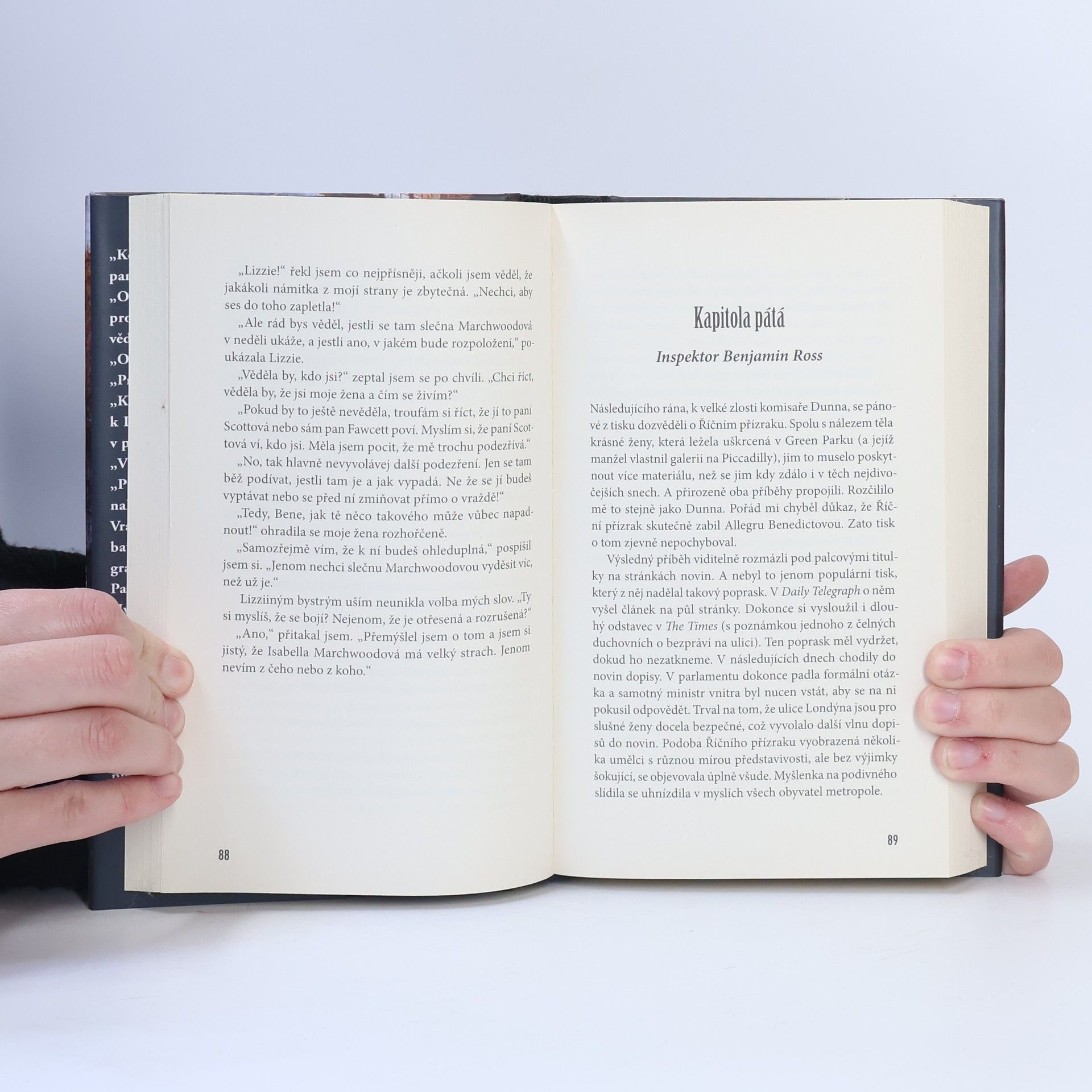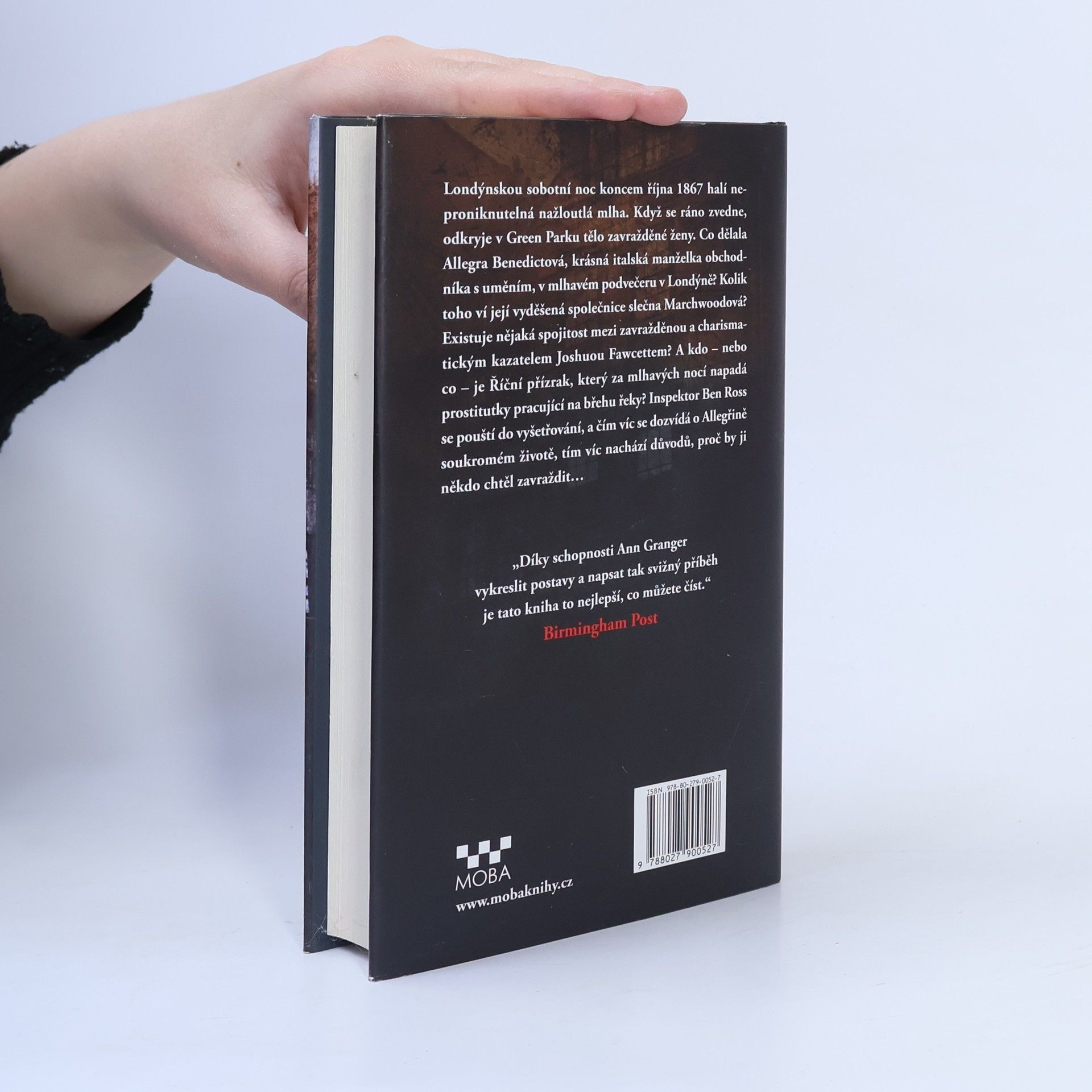 Když inspektor Ben Ross ze Scotland Yardu jedné sobotní noci koncem října 1867 kráčí domů, Londýn halí neproniknutelná nažloutlá mlha. Než se ráno zvedne, leží v Green Parku zavražděná žena. Allegra Benedictová byla krásná italská manželka obchodníka s uměním. Ale co dělala odpoledne v Londýně a proč jen pár hodin před svou smrtí prodávala brož v nákupní pasáži Burlington Arcade? Kolik toho ví vyděšená slečna Marchwoodová? Existuje nějaká spojitost mezi zavražděnou a charismatickým knězem Joshuou Fawcettem? A kdo – nebo co – je Říční přízrak, který za mlhavých nocí loví prostitutky pracující na břehu řeky?