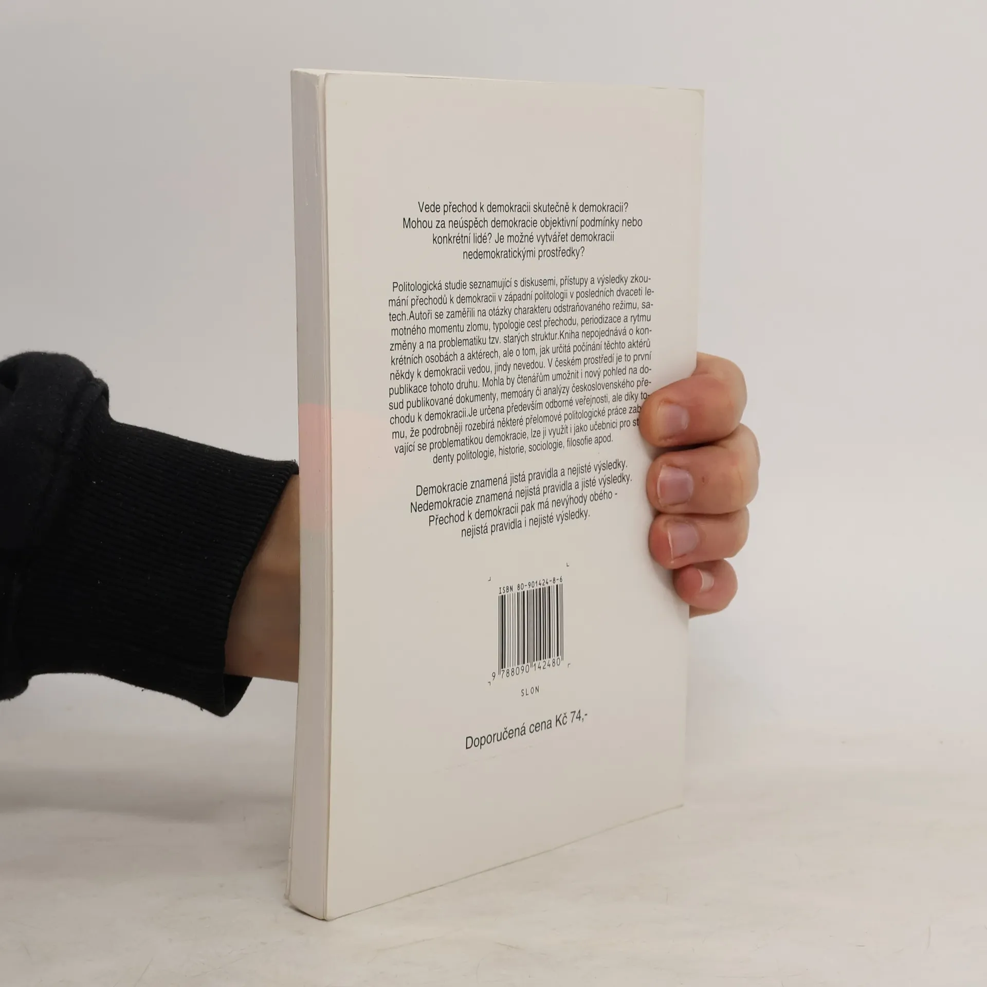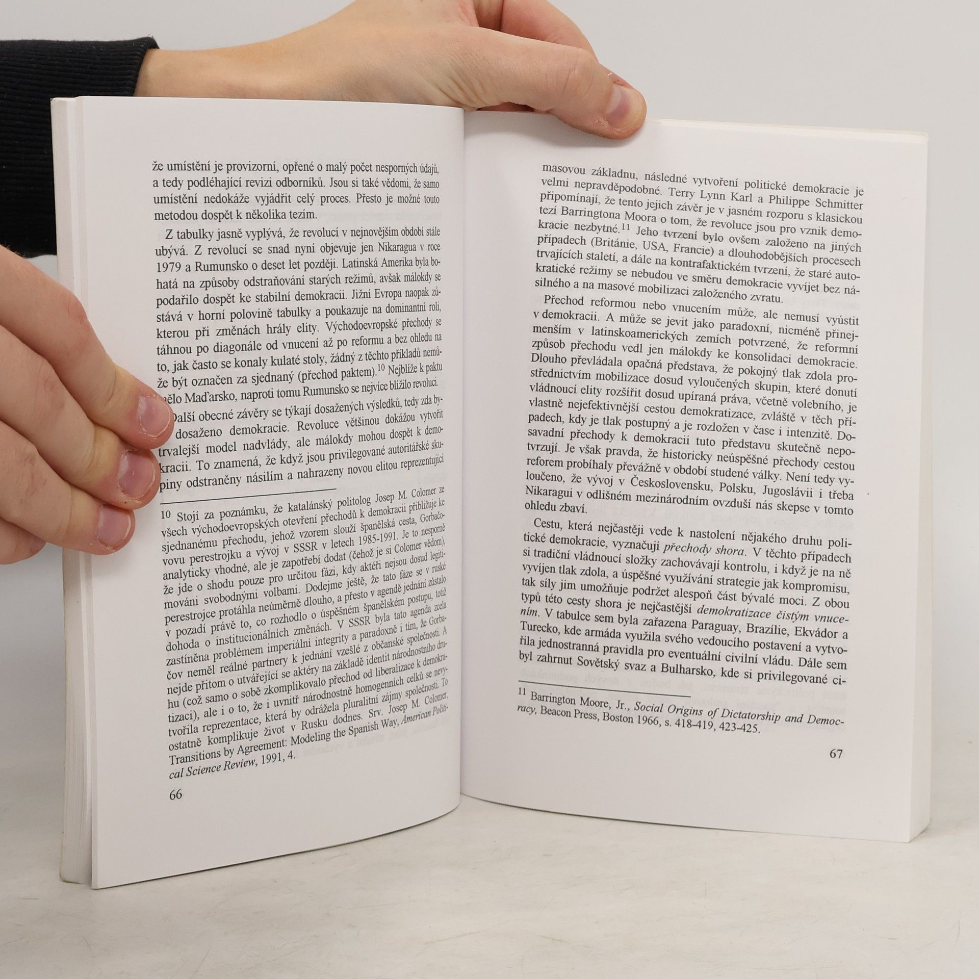 Politologická studie seznamující s diskusemi, přístupy a výsledky zkoumání přechodů k demokracii v západní politologii v posledních dvaceti letech. Autoři se zaměřili na otázky charakteru odstraňovaného režimu, samotného momentu zlomu, typologie cest přechodu, periodizace a rytmu změny a na problematiku tzv. starých struktur. Kniha nepojednává o konkrétních osobách a aktérech, ale o tom, jak určitá počínání těchto aktérů někdy k demokracii vedou, jindy nevedou. V českém prostředí je to první publikace tohoto druhu. Mohla by čtenářům umožnit i nový pohled na dosud publikované dokumenty, memoáry či analýzy československého přechodu k demokracii. Je určena především odborné veřejnosti, ale díky tomu, že podrobněji rozebírá některé přelomové politologické práce zabývající se problematikou demokracie, lze ji využít i jako učebnici pro studenty politologie, historie, sociologie, filosofie. Zdroj: spolecenskeknihy.cz
