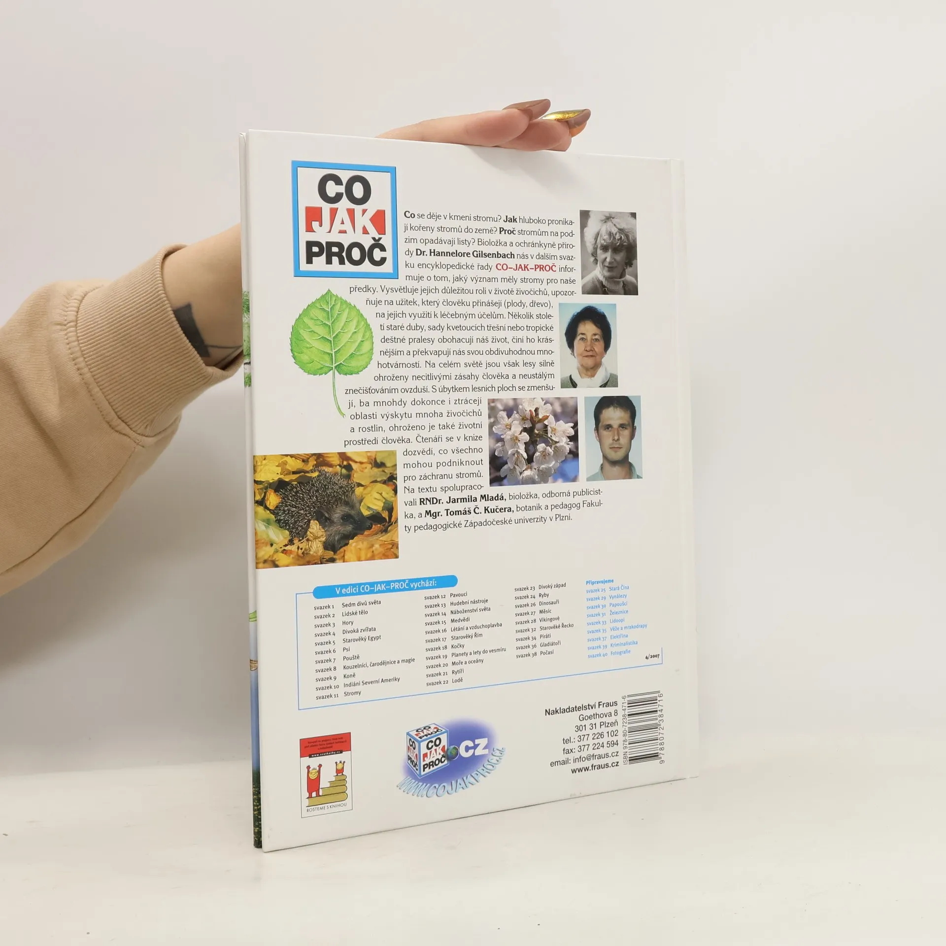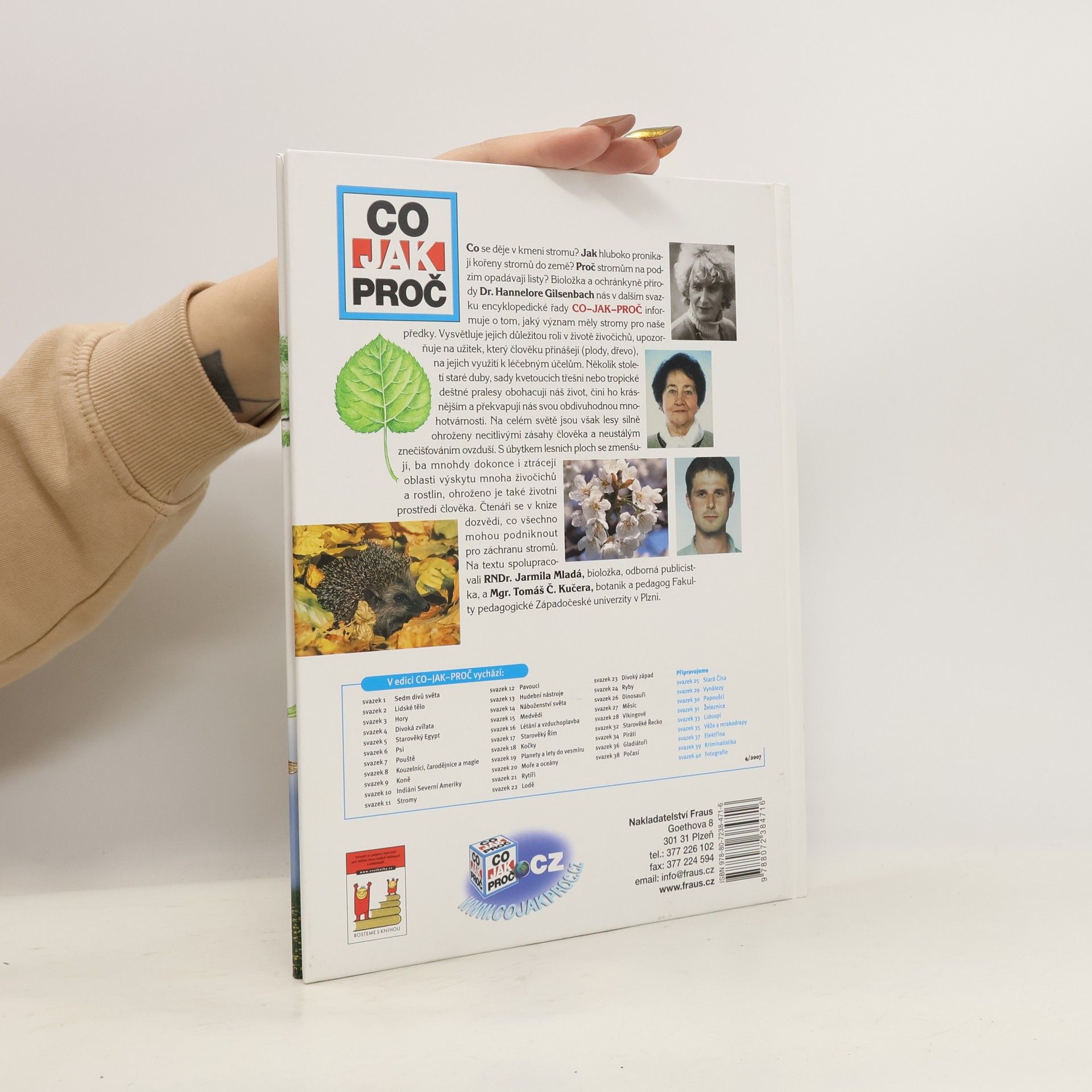 Co se děje v kmeni stromu? Jak hluboko pronikají kořeny do země? Proč listnaté stromy na podzim opadávají? Bioložka a ochránkyně přírody Dr. Hannelore Gilsenbachová vypráví o významu stromů pro naše předky. Vysvětluje, jak důležitou roli hrají stromy v životě živočichů a jaký užitek přinášejí člověku díky svým chutným plodům, nebo dřevu, které vydrží po staletí, či díky léčivým látkám. Několik století staré duby, kvetoucí třešně nebo tropické deštné pralesy – to jsou stromy, které dělají náš život krásnější a překvapují nás svou obdivuhodnou mnohotvárností. Na celém světě jsou ale lesy silně ohroženy zásahy člověka a zhoršujícím se znečištěním ovzduší. Mizí tak místo pro život mnoha živočišných druhů a ohrožen je i životní prostor člověka. Přítel přírody se v knize proto také dozví, co může udělat pro záchranu stromů. Na textu spolupracovala bioložka, redaktorka, odborná publicistka a emeritní spolupracovnice Akademie věd ČR, RNDr. Jarmila Mladá.