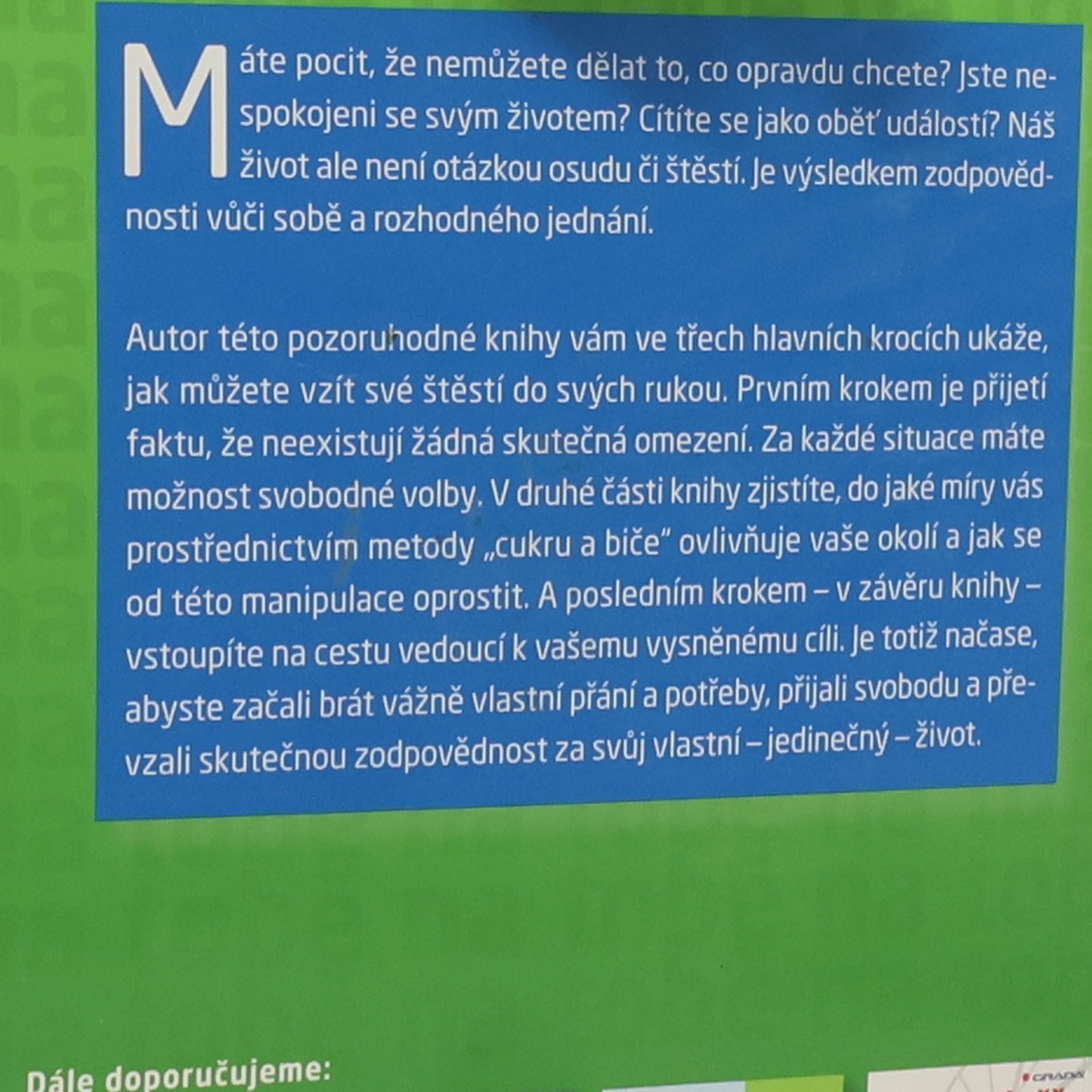 Máte pocit, že nemůžete dělat to, co opravdu chcete? Jste nespokojeni se svým životem? Cítíte se jako oběť událostí? Náš život ale není otázkou osudu či štěstí. Je výsledkem zodpovědnosti vůči sobě a rozhodného jednání. Autor této pozoruhodné knihy vám ve třech hlavních krocích ukáže, jak můžete vzít své štěstí do svých rukou. Prvním krokem je přijetí faktu, že neexistují žádná skutečná omezení. Za každé situace máte možnost svobodné volby. V druhé části knihy zjistíte, do jaké míry vás prostřednictvím metody "cukru a biče" ovlivňuje vaše okolí a jak se od této manipulace oprostit. A posledním krokem - v závěru knihy - vstoupíte na cestu vedoucí k vašemu vysněnému cíli. Je totiž načase, abyste začali brát vážně vlastní přání a potřeby, přijali svobodu a převzali skutečnou zodpovědnost za svůj vlastní - jedinečný - život.