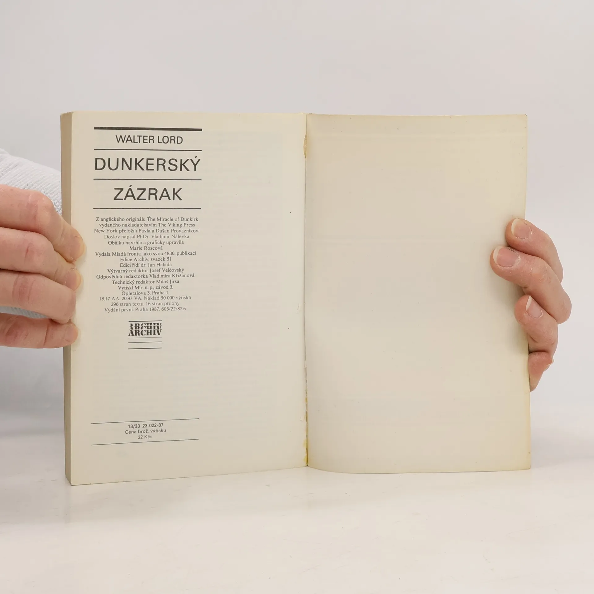 V květnu 1940 byla spojenecká vojska zatlačena do francouzského přístavu Dunkerque. Pro 400 000 vojáků byla jedinou cestou k záchraně evakuace do Anglie. Německé tanky stály 10 mil od nich a záchrana většiny z nich se zdála utopií. Kniha pojednává o největší záchranné operaci všech dob, díky které se podařilo zachránit 338 000 vojáků, což byl opravdu zázrak… Z anglického originálu The Miracle of Dunkirk vydaného nakladatelstvím The Viking Press, New York přeložili Pavla a Dušan Provazníkovi. Doslov napsal PhDr.Vladimír Nálevka. 296 stran textu, 16 stran přílohy. Vydání první.
