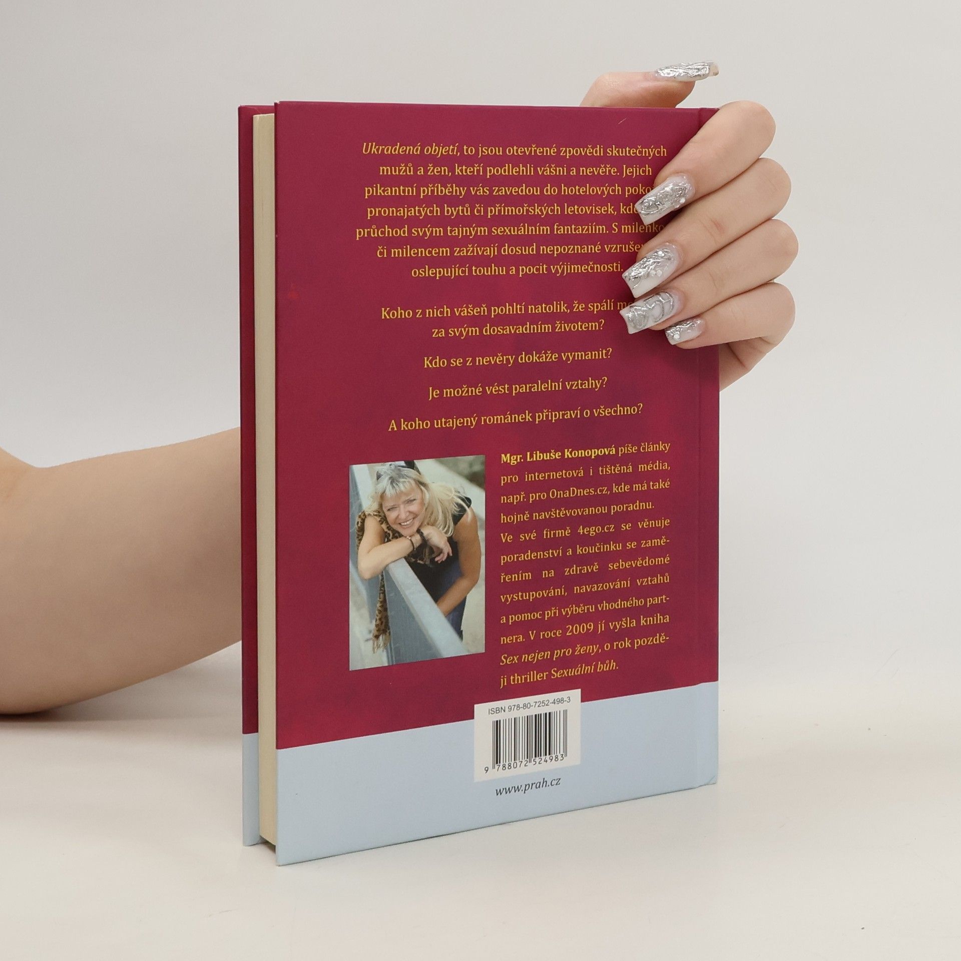 Vášeň v cizích ložnicích se může stát osudnou… Otevřené zpovědi skutečných mužů a žen, kteří podlehli vášni a nevěře. Jejich pikantní příběhy vás zavedou do hotelových pokojů, pronajatých bytů či přímořských letovisek, kde dali průchod svým tajným sexuálním fantaziím. S milenkou či milencem zažívají dosud nepoznané vzrušení, oslepující touhu a pocit výjimečnosti. Koho z nich vášeň pohltí natolik, že spálí mosty za svým dosavadním životem? Kdo se z nevěry dokáže vymanit? Je možné vést dva paralelní vztahy? A koho z nich utajený vztah připraví o všechno? Autorka je poradkyní v oblasti partnerských vztahů a zejména hledání vhodných partnerů.