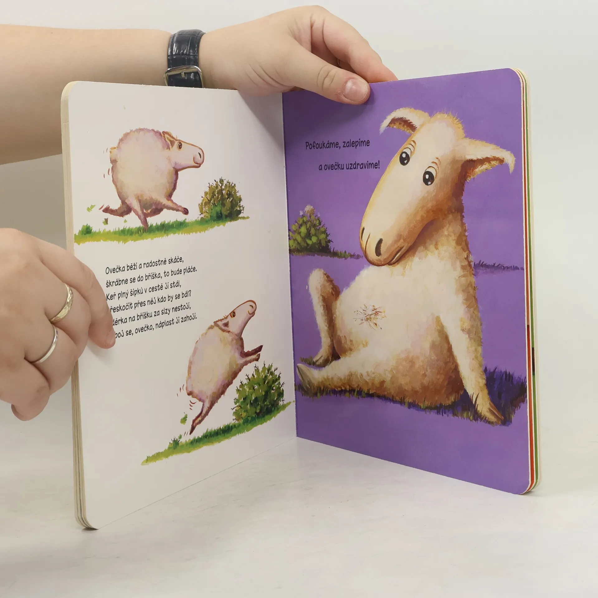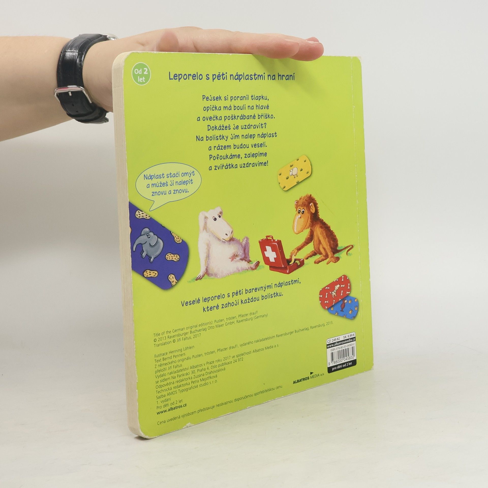 Pejsek si poranil tlapku, opička má bouli na hlavě a ovečka poškrábané bříško. Dokážeš je uzdravit? Na bolístky jim nalep náplast a rázem budou veselí. Pět barevných náplastí stačí omýt vodou a můžeš je nalepit znovu a znovu. Nakladatelská anotace.