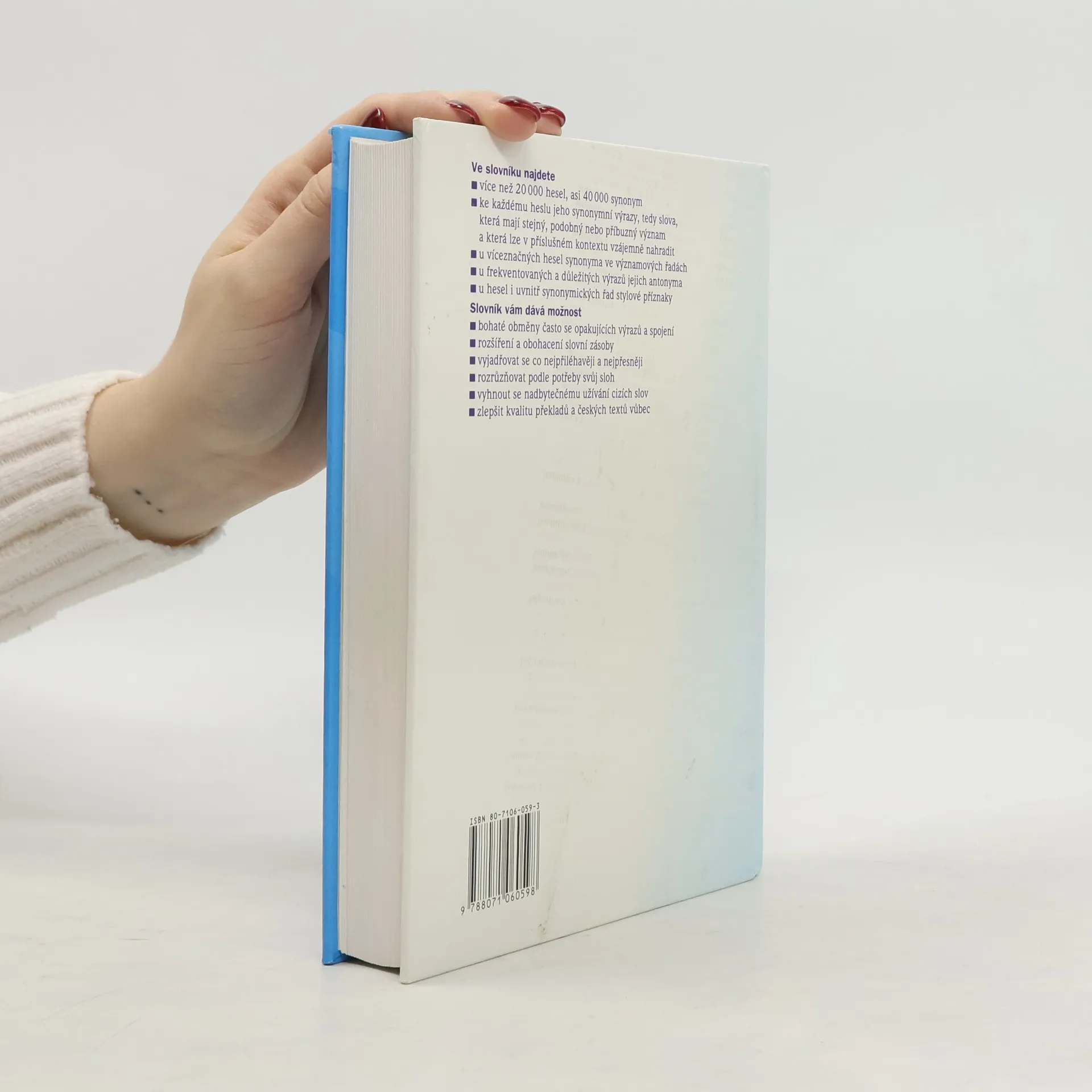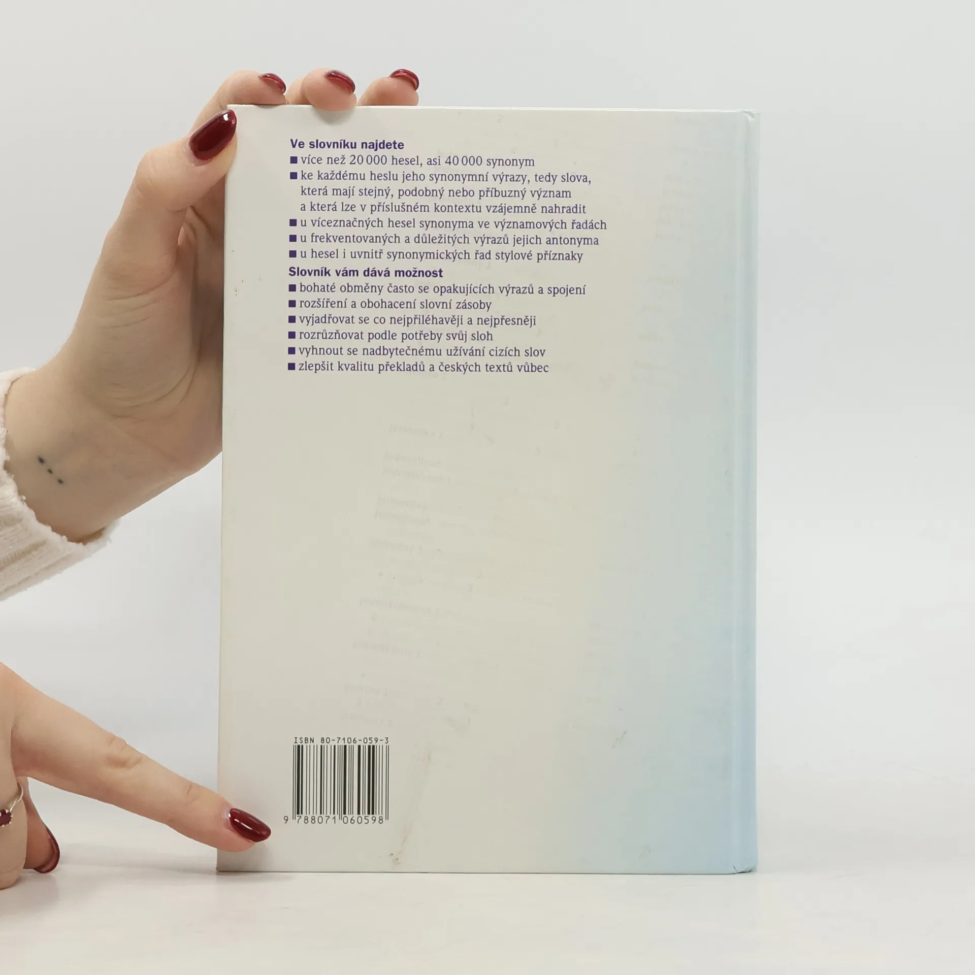 Čtvrté doplněné vydání oblíbené jazykové příručky, která přináší více než 22 000 hesel a asi 40 000 synonym. Ke každému heslu jsou uvedeny jeho synonymní výrazy, tedy slova, která mají stejný význam a která lze v příslušném kontextu vzájemně nahradit.