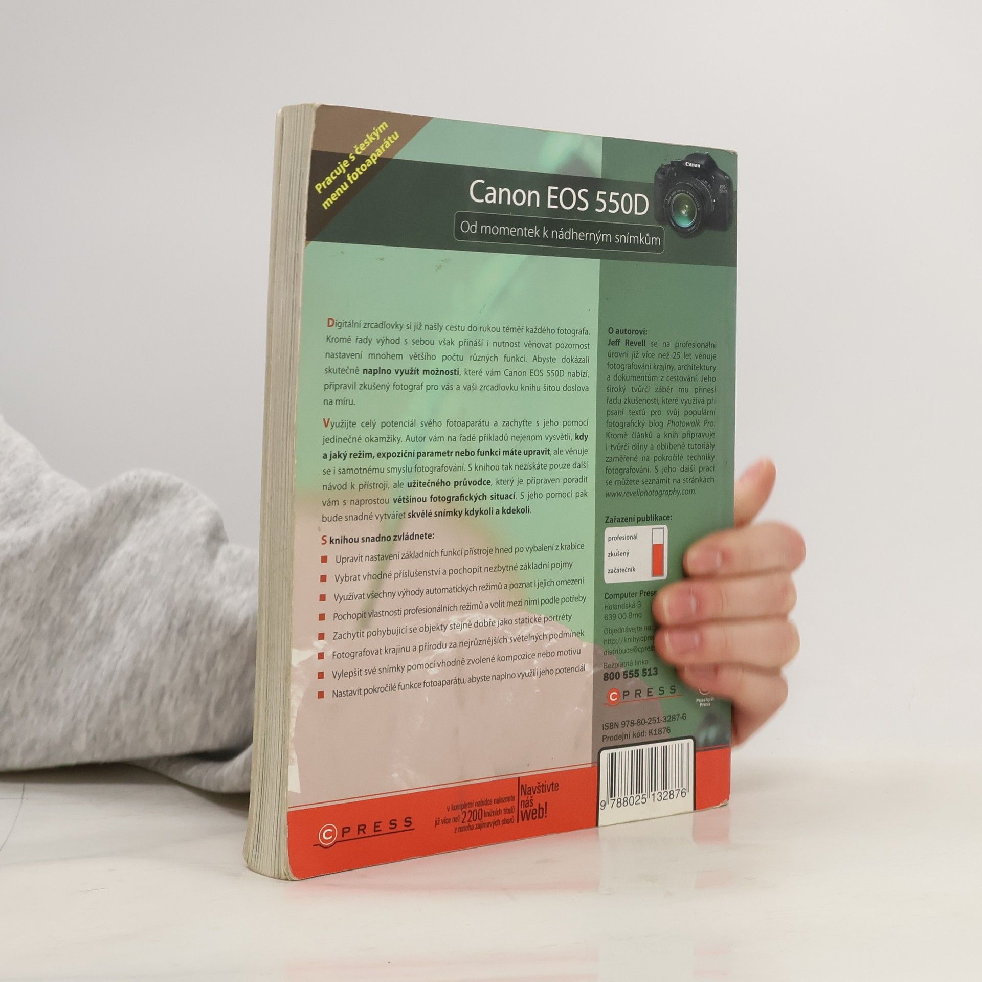 Digitální zrcadlovky si již našly cestu do rukou téměř každého fotografa. Kromě řady výhod s sebou však přináší i nutnost věnovat pozornost nastavení mnohem většího počtu různých funkcí. Abyste dokázali skutečně naplno využít možnosti, které vám Canon EOS 550D nabízí, připravil zkušený fotograf pro vás a vaši zrcadlovku knihu šitou doslova na míru. Využijte celý potenciál svého fotoaparátu a zachyťte s jeho pomocí jedinečné okamžiky. Autor vám na řadě příkladů nejenom vysvětlí, kdy a jaký režim, expoziční parametr nebo funkci máte upravit, ale věnuje se i samotnému smyslu fotografování. S knihou tak nezískáte pouze další návod k přístroji, ale užitečného průvodce, který je připraven poradit vám s naprostou většinou fotografických situací. S jeho pomocí pak bude snadné vytvářet skvělé snímky kdykoli a kdekoli. S knihou snadno zvládnete: * Upravit nastavení základních funkcí přístroje hned po vybalení z krabice * Vybrat vhodné příslušenství a pochopit nezbytné základní pojmy * Využívat všechny výhody automatických režimů a poznat i jejich omezení * Pochopit vlastnosti profesionálních režimů a volit mezi nimi podle potřeby * Zachytit pohybující se objekty stejně dobře jako statické portréty * Fotografovat krajinu a přírodu za nejrůznějších světelných podmínek * Vylepšit své snímky pomocí vhodně zvolené kompozice nebo motivu * Nastavit pokročilé funkce fotoaparátu, abyste naplno využili jeho potenciál