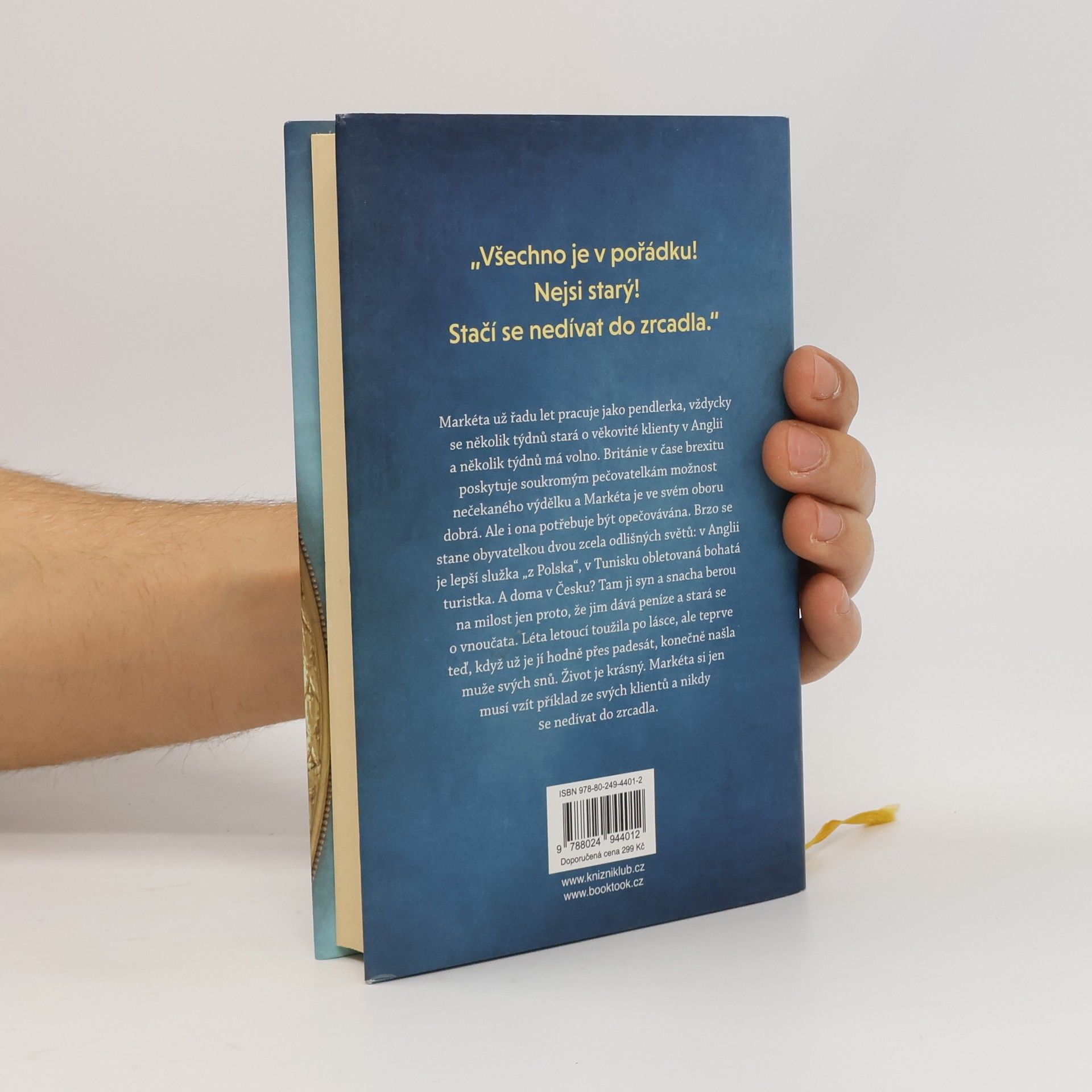 „Všechno je v pořádku! Nejsi starý! Stačí se nedívat do zrcadla.“ Markéta už řadu let pracuje jako pendlerka, vždycky se několik týdnů stará o věkovité klienty v Anglii a několik týdnů má volno. Británie v čase brexitu poskytuje soukromým pečovatelkám možnost nečekaného výdělku a Markéta je ve svém oboru dobrá. Ale i ona potřebuje být opečovávána. Brzo se stane obyvatelkou dvou zcela odlišných světů: v Anglii je lepší služka „z Polska“, v Tunisku obletovaná bohatá turistka. A doma v Česku? Tam ji syn a snacha berou na milost jen proto, že jim dává peníze a stará se o vnoučata. Léta letoucí toužila po lásce, ale teprve teď, když už je jí hodně přes padesát, konečně našla muže svých snů. Život je krásný. Jen si musí vzít příklad ze svých klientů a nikdy se nedívat do zrcadla.