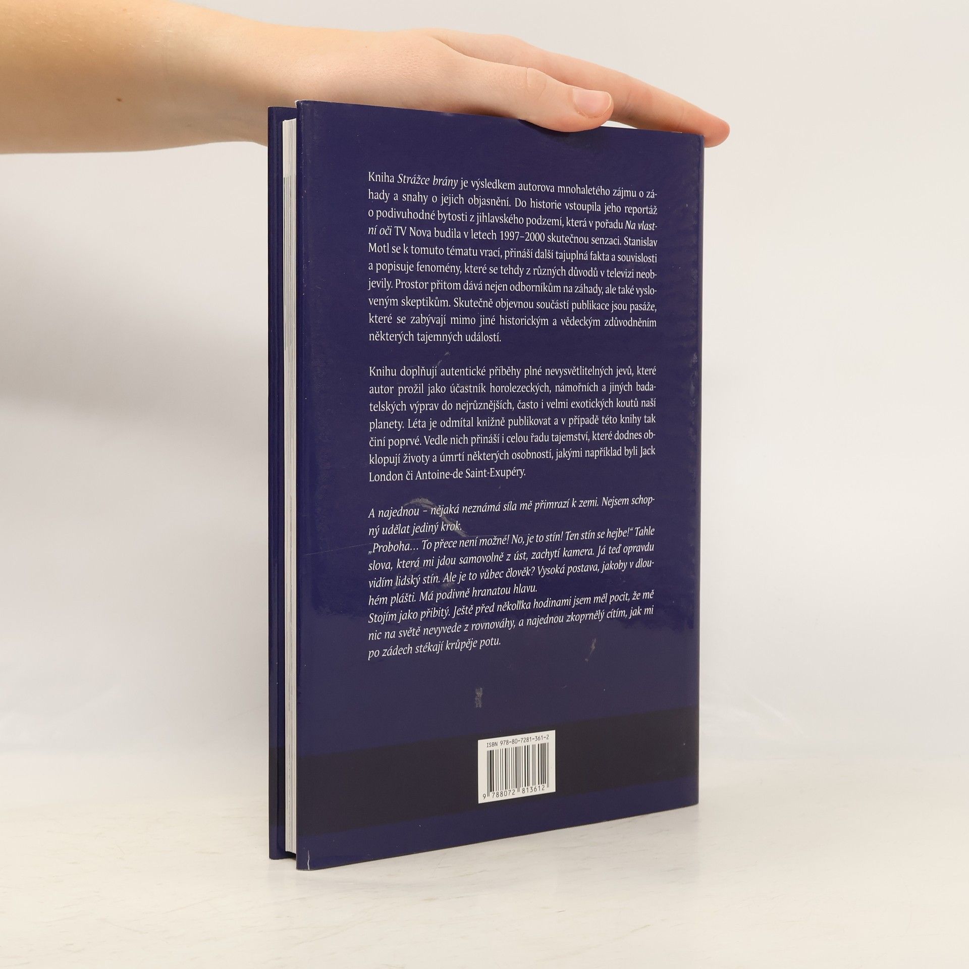 Kniha Strážce brány je výsledkem autorova mnohaletého zájmu o záhady a snahy o jejich objasnění. Do historie vstoupila jeho reportáž o podivuhodné bytosti z jihlavského podzemí, která v pořadu Na vlastní oči TV Nova budila v letech 1997 – 2000 skutečnou senzaci. Stanislav Motl se k tomuto tématu vrací, přináší další tajuplná fakta a souvislosti a popisuje fenomény, které se tehdy z různých důvodů v televizi neobjevily. Prostor přitom dává nejen odborníkům na záhady, ale také vysloveným skeptikům. Skutečně objevnou součástí publikace jsou pasáže, které se zabývají mimo jiné historickým a vědeckým zdůvodněním některých tajemných a pro mnohé lidi nevysvětlitelných událostí. Knihu doplňují autentické příběhy plné nevysvětlitelných jevů a událostí, které autor prožil jako účastník horolezeckých, námořních a jiných badatelských výprav do nejrůznějších, často i velmi exotických koutů naší planety. Léta je odmítal knižně publikovat a v případě této knihy tak činí poprvé. Vedle nich přináší i celou řadu tajemství, které dodnes obklopují životy a úmrtí některých osobností, jakými například byli Jack London či Antoine-de Saint-Exupéry. zdroj: http://www.eminent.cz