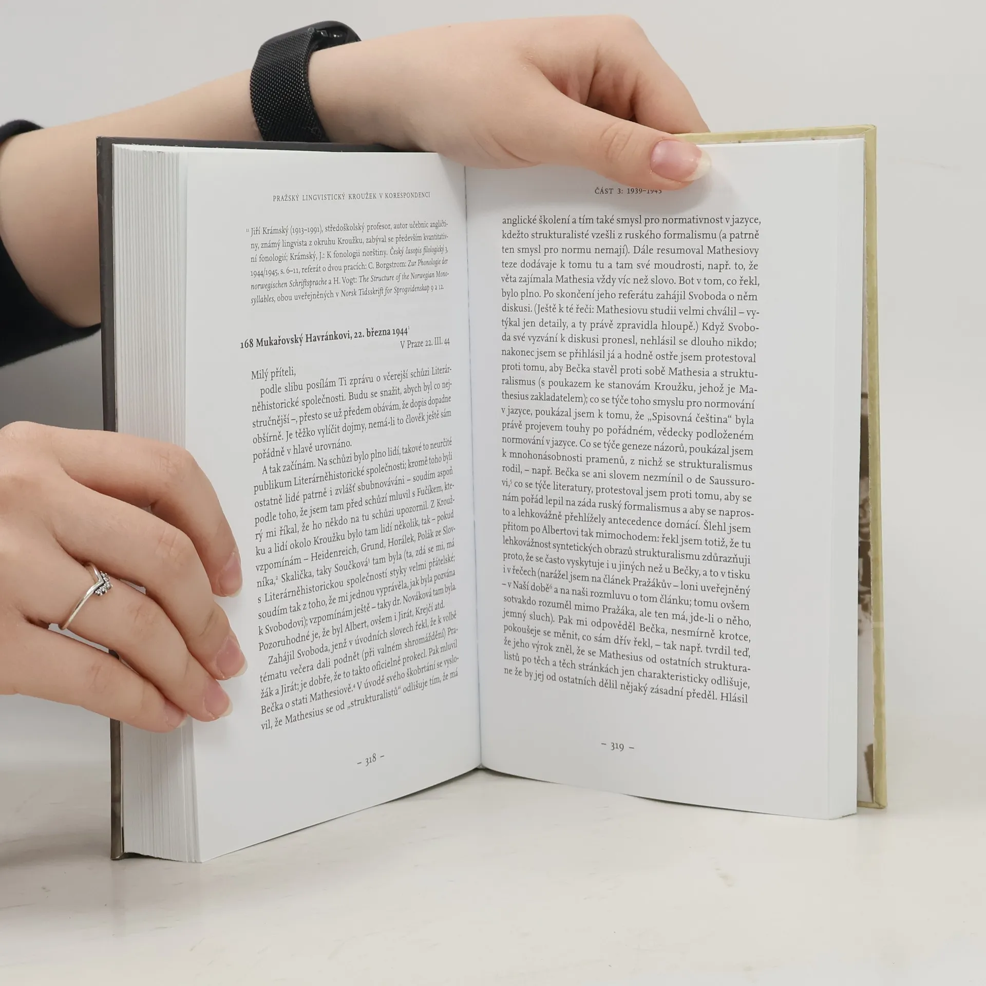 Pro vývoj vědy jsou důležité nejen jednotlivé významné osobnosti, ale i skupiny vědců, které společně usilují posunout poznání novým směrem. Jednou z prvních takových skupin v dějinách moderní lingvistiky byl Pražský lingvistický kroužek, založený před osmdesáti lety. Soubor korespondence jeho členů představuje mimořádně cenný příspěvek k dokreslení obrazu o životě čelných osobností tohoto významného sdružení, které v průběhu 20. století uvedlo pražskou lingvisticko-literární školu do povědomí evropské a později i světové badatelské veřejnosti. Publikace obsahuje dopisy uložené v archivu Pražského lingvistického kroužku – jde o korespondenci mezi V. Mathesiem, B. Havránkem, R. Jakobsonem, J. Mukařovským, B. Trnkou a M. Weingartem. Máme tak možnost nahlédnout „za kulisy“ a sledovat vzrušující proces postupného zrání a formování toho, co z později vydaných děl známe jako už hotový, jen zdánlivě samozřejmý výsledek.
