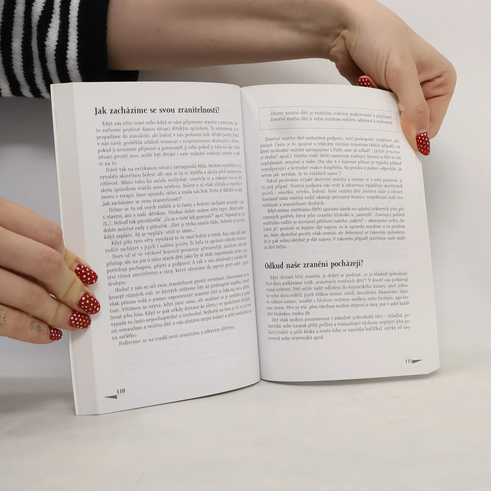 Tato kniha je o setkání s našimi nejhlubšími pocity – s naší citlivostí, zranitelností a opravdovostí. Je o radosti a smutku, o lásce a hněvu, o hlubším prožitku, který se skrývá za naší každodenní skutečností – zkrátka o dítěti v nás. Dobrý vztah k našemu „vnitřnímu dítěti“ nám umožní s pochopením a láskou přijmout i jeho negativní pocity – bolest, strach a hněv. To pomáhá vyléčit naše stará zranění a dodává novou naději na cestě životem, která nás ještě čeká. V první části knihy Radost z prožívání budete mít příležitost setkat se se svým vnitřním dítětem v jeho různých podobách. Najdete zde řadu experimentů, které vám umožní vyzkoušet si na vlastní kůži setkání s vnitřním dítětem, popis některých problémů, s nimiž se při tom můžete setkat, a návrh, jak je řešit. Nejprve se setkáte se se svým radostným a kreativním dítětem a poté se smutným a zraněným dítětem. Pak se zaměříme na jeho strach, hněv a úzkost. V této části budete mít také příležitost poznat a „vychovávat“ svého „vnitřního rodiče“, který v nás vede s vnitřním dítětem neustále dialog – aby byl dostatečně citlivý a současně pevný, tak aby byl tvému dítěti oporou. Druhá část – Osvoboďte své vnitřní dítě – je zaměřená na práci se zakletími, které jsme při své výchově přijali, a na zdravý rozvoj a růst našeho vnitřního dítěte.