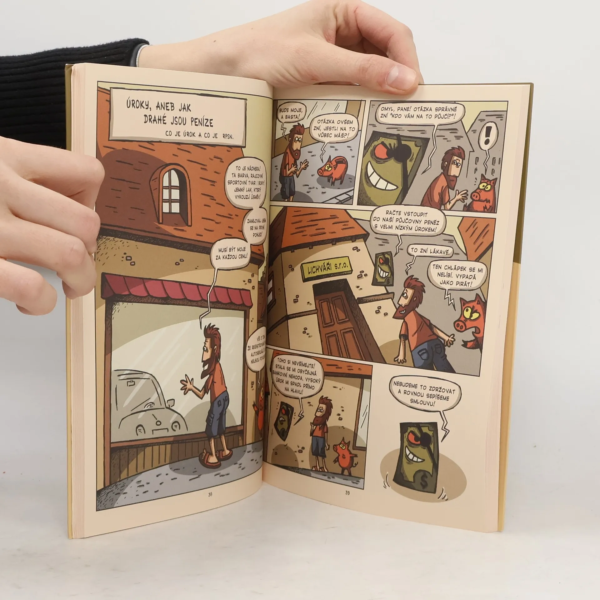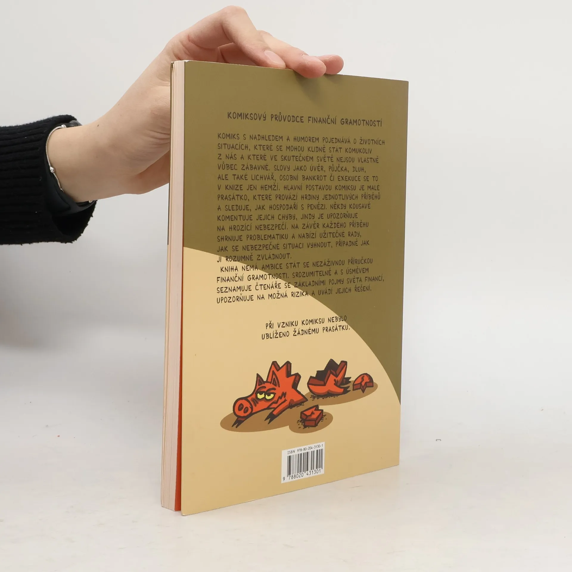 Kniha s nadhledem a humorem pojednává o životních situacích, které se mohou klidně stát komukoliv z nás a které ve výsledku nejsou vůbec zábavné. Slovy jako úvěr, půjčka, dluh, ale také lichvář, osobní bankrot či exekuce se to v knize jen hemží. Hlavní postavou je malé prasátko, které provází hrdiny jednotlivých příběhů a sleduje, jak hospodaří s penězi. Někdy kousavě komentuje jejich chyby, jindy je upozorňuje na hrozící nebezpečí. Na závěr každého příběhu shrnuje problematiku a nabízí užitečné rady, jak se průšvihu vyhnout, případně jak situaci rozumně zvládnout. Nejde o nezáživnou příručku finanční gramotnosti. Komiks velice zábavně a srozumitelně seznamuje se základními pojmy světa financí, upozorňuje na možná rizika a uvádí jejich řešení. Pro děti od 8 let i jejich rodiče.