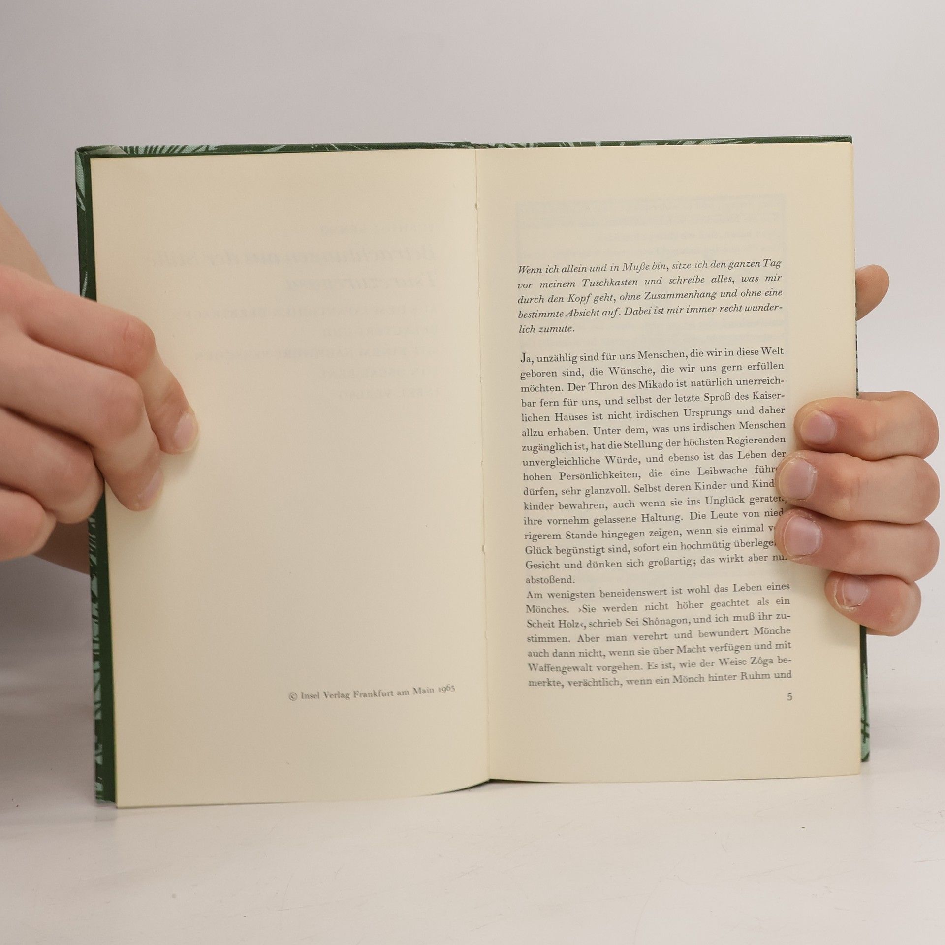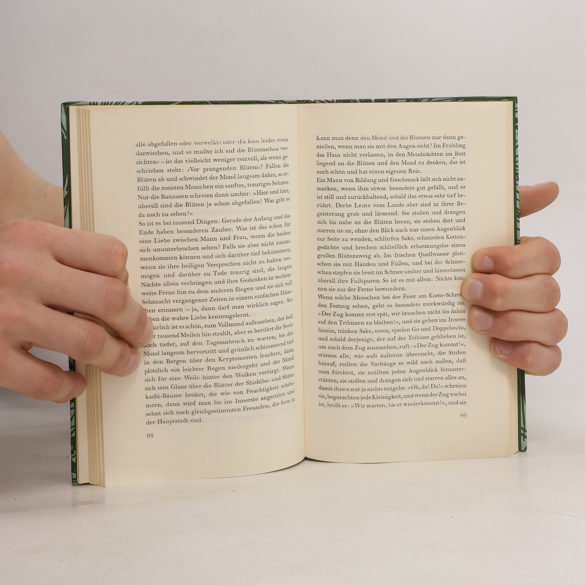 Das Werk enthält in 243 Kapiteln Betrachtungen über die mannigfaltigasten Dinge des Lebens, über das Glück der Einsamkeit, über Tempel und seltsame Mönche, über Liebe, alte Bräuche, Gedichte, über Einfalt und Leichtsinn der Menschen. Wie ein roter Faden zieht sich durch dies alles die Erkenntnis von der Vergänglichkeit allen Daseins und von der Notwendigkeit, sich in rechter Weise auf das Sterben vorzubereiten. Der Autor vereinigt dabei Elemente der konfuzianischen, buddhistischen und taoistischen Lehre.