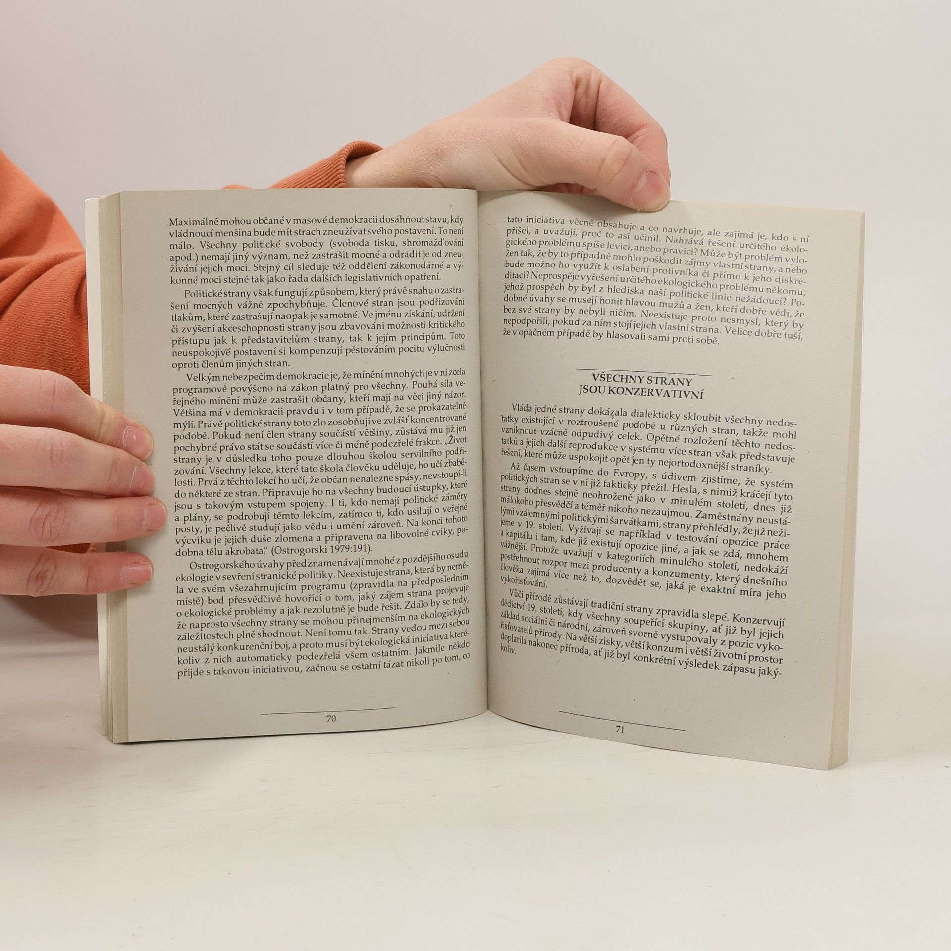 Kniha se zabývá společenskými souvislostmi ekologické krize s důrazem na oblast politiky a ekonomiky. Analyzuje patologické rysy konzumní společnosti, která výrazně omezuje naše šance přejít k trvale udržitelným životním způsobům. V závěru se dotýká jednoho z předpokladů tohoto přechodu: mocenské a ekonomické decentralizace.