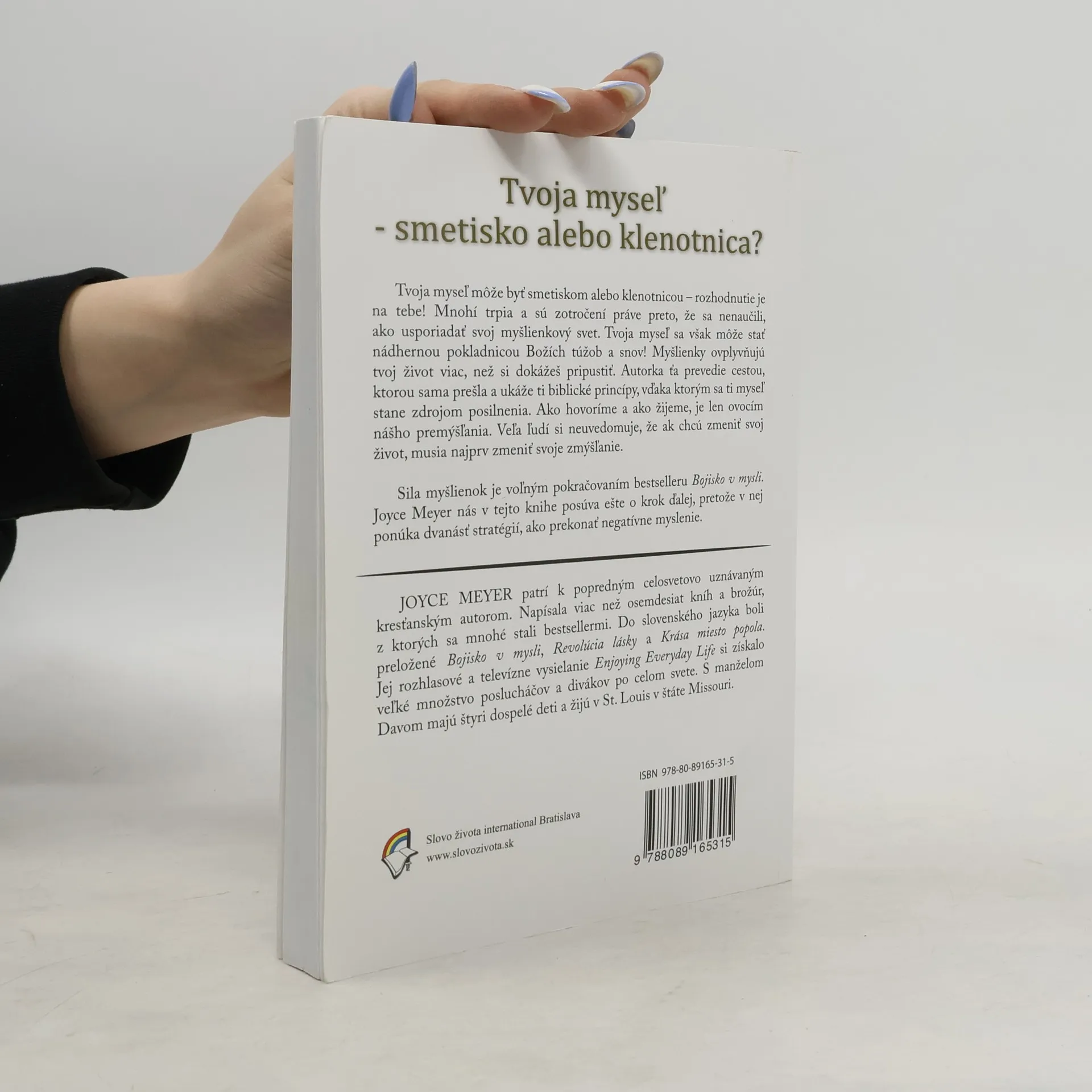 Mnohí trpia a sú zotročení práve preto, že sa nenaučili, ako usporiadať svoj myšlienkový svet. Tvoja myseľ sa však môže stať nádhernou pokladnicou Božích túžob a snov! Myšlienky ovplyvňujú tvoj život viac, než si dokážeš pripustiť. Autorka ťa prevedie cestou, ktorou sama prešla a ukáže ti biblické princípy, vďaka ktorým sa ti myseľ stane zdrojom posilnenia. Ako hovoríme a ako žijeme, je len ovocím nášho premýšľania. Veľa ľudí si neuvedomuje, že ak chcú zmeniť svoj život, musia najprv zmeniť svoje zmýšľanie. Sila myšlienok je voľným pokračovaním bestselleru Bojisko v mysli. Joyce Meyer nás v tejto knihe posúva ešte o krok ďalej, pretože v nej ponúka dvanásť stratégií, ako prekonať negatívne myslenie.